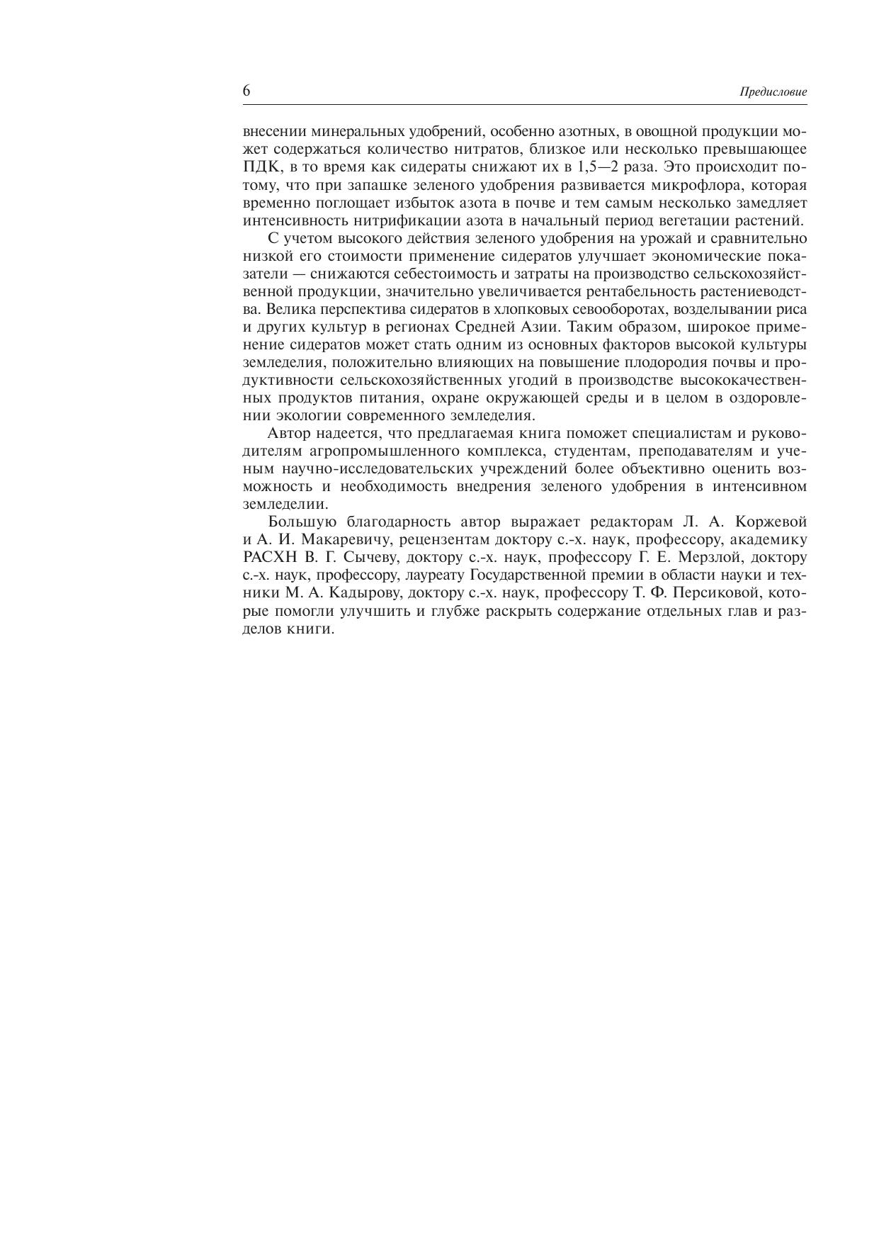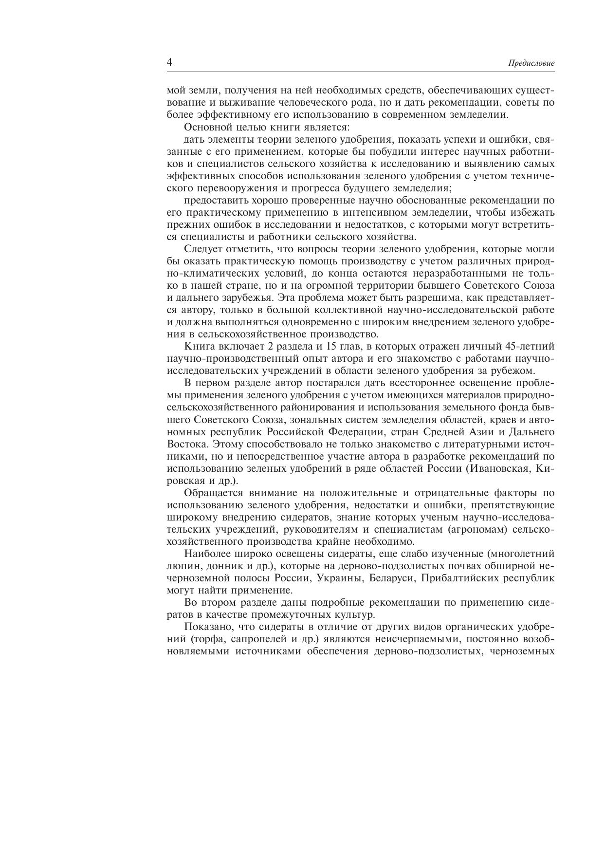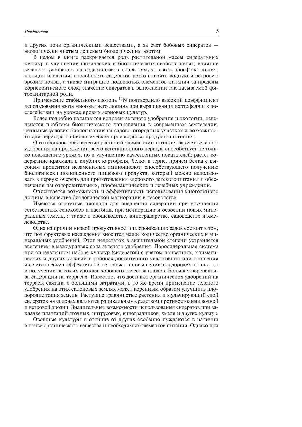 Обобщены результаты длительных научных исследований автора и опыт передовых хозяйств в стране и за рубежом по применению зеленого удобрения в современном земледелии. Описывается значение сидерации как источника постоянно возобновляемого органического вещества и азота в почве, роль и значение зеленого удобрения как биологической основы природоохранных технологий в снижении водной и ветровой эрозии, миграции подвижных элементов питания в глубокие слои почвы, фитосанитарное значение сидератов в полях севооборота и в водоохранных зонах. Особое внимание уделяется вопросам повышения урожайности сельскохозяйственных культур и их качества, получению экологически чистой, биологически здоровой продукции растениеводства. Монография будет полезным справочником для научных работников, руководителей сельхозорганов и фермерских хозяйств, агрономов всех специальностей, преподавателей и студентов высших и средних сельскохозяйственных учебных заведений.