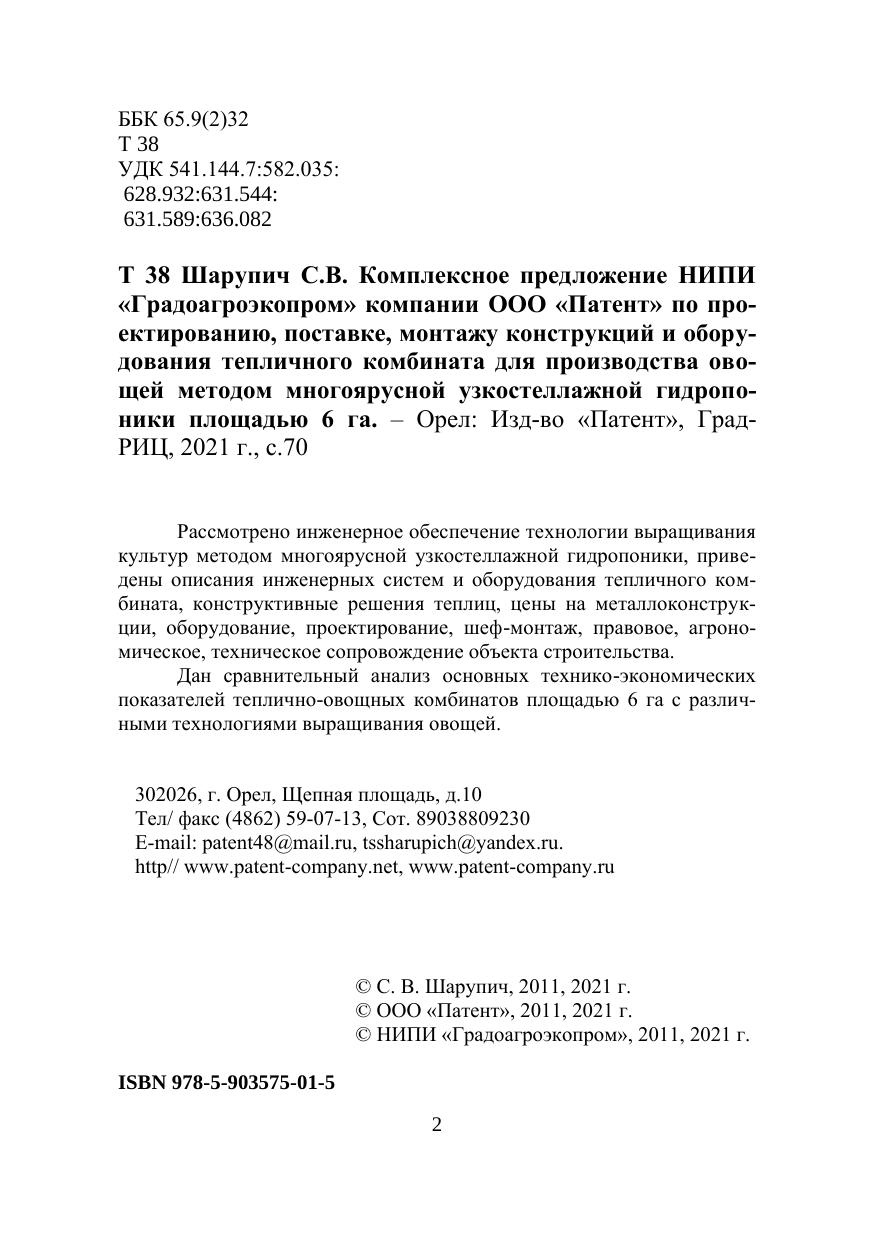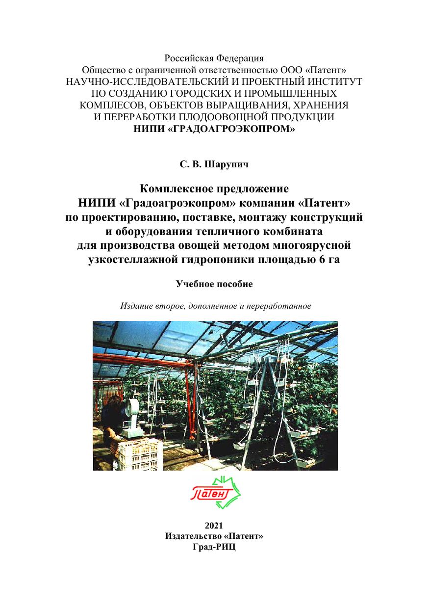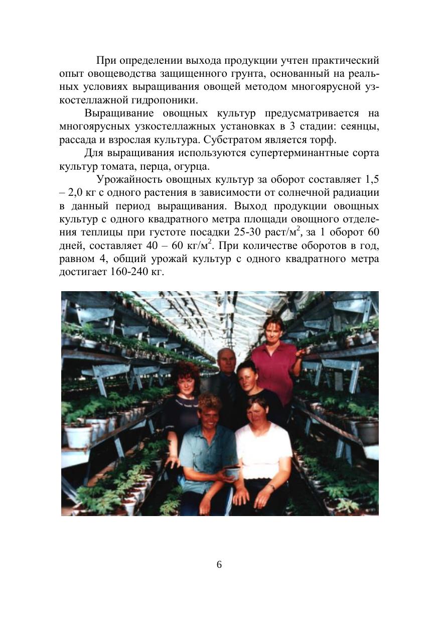 Рассмотрено инженерное обеспечение технологии выращивания культур методом многоярусной узкостеллажной гидропоники, приведены описания инженерных систем и оборудования тепличного комбината, конструктивные решения теплиц, цены на металлоконструкции, оборудование, проектирование, шеф-монтаж, правовое, агрономическое, техническое сопровождение объекта строительства. Дан сравнительный анализ основных технико-экономических показателей теплично-овощных комбинатов площадью 6 га с различными технологиями выращивания овощей.