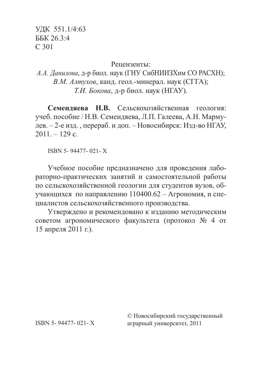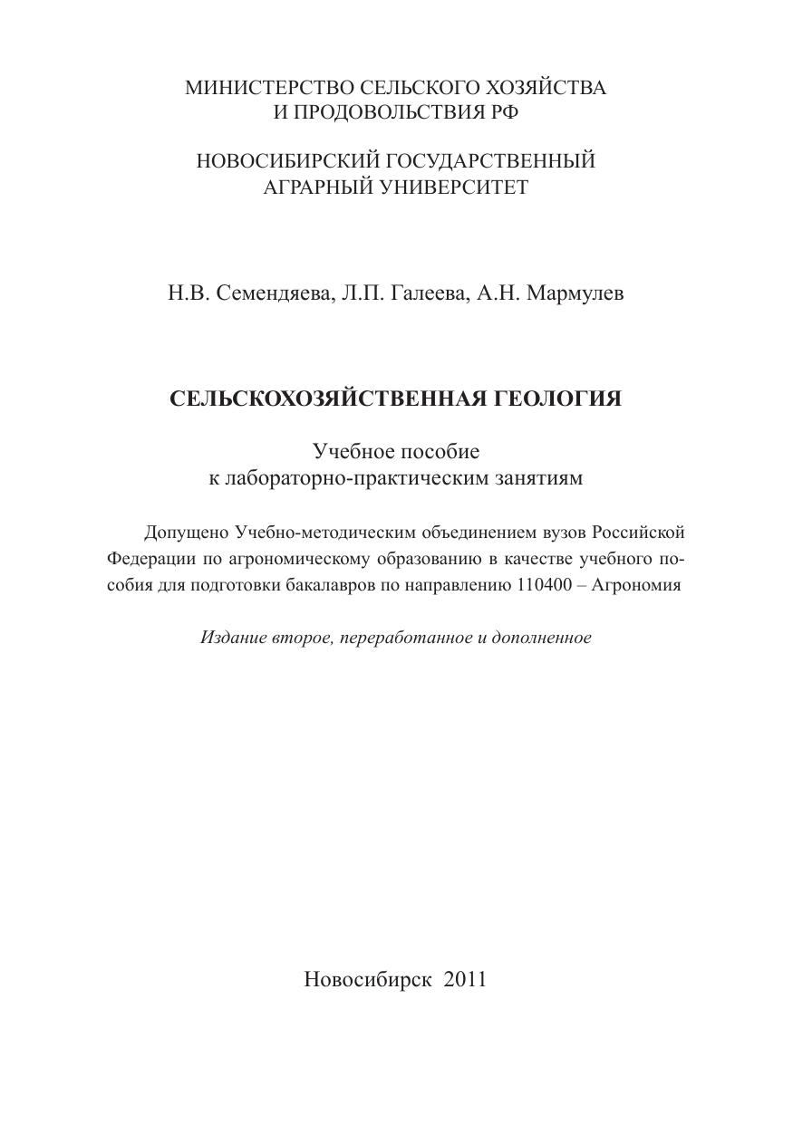 Учебное пособие предназначено для проведения лабораторно-практических занятий и самостоятельной работы по сельскохозяйственной геологии для студентов вузов, обучающихся по направлению 110400.62 – Агрономия, и специалистов сельскохозяйственного производства.