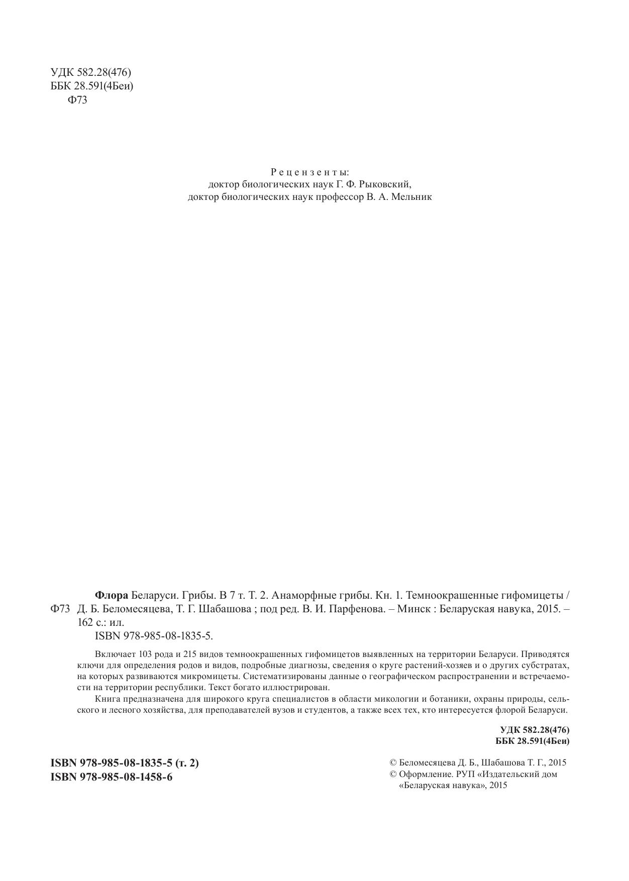 Включает 103 рода и 215 видов темноокрашенных гифомицетов выявленных на территории Беларуси. Приводятся ключи для определения родов и видов, подробные диагнозы, сведения о круге растений-хозяев и о других субстратах, на которых развиваются микромицеты. Систематизированы данные о географическом распространении и встречаемости на территории республики. Текст богато иллюстрирован. Книга предназначена для широкого круга специалистов в области микологии и ботаники, охраны природы, сельского и лесного хозяйства, для преподавателей вузов и студентов, а также всех тех, кто интересуется флорой Беларуси.
