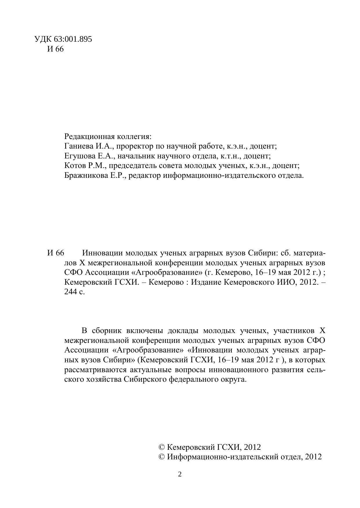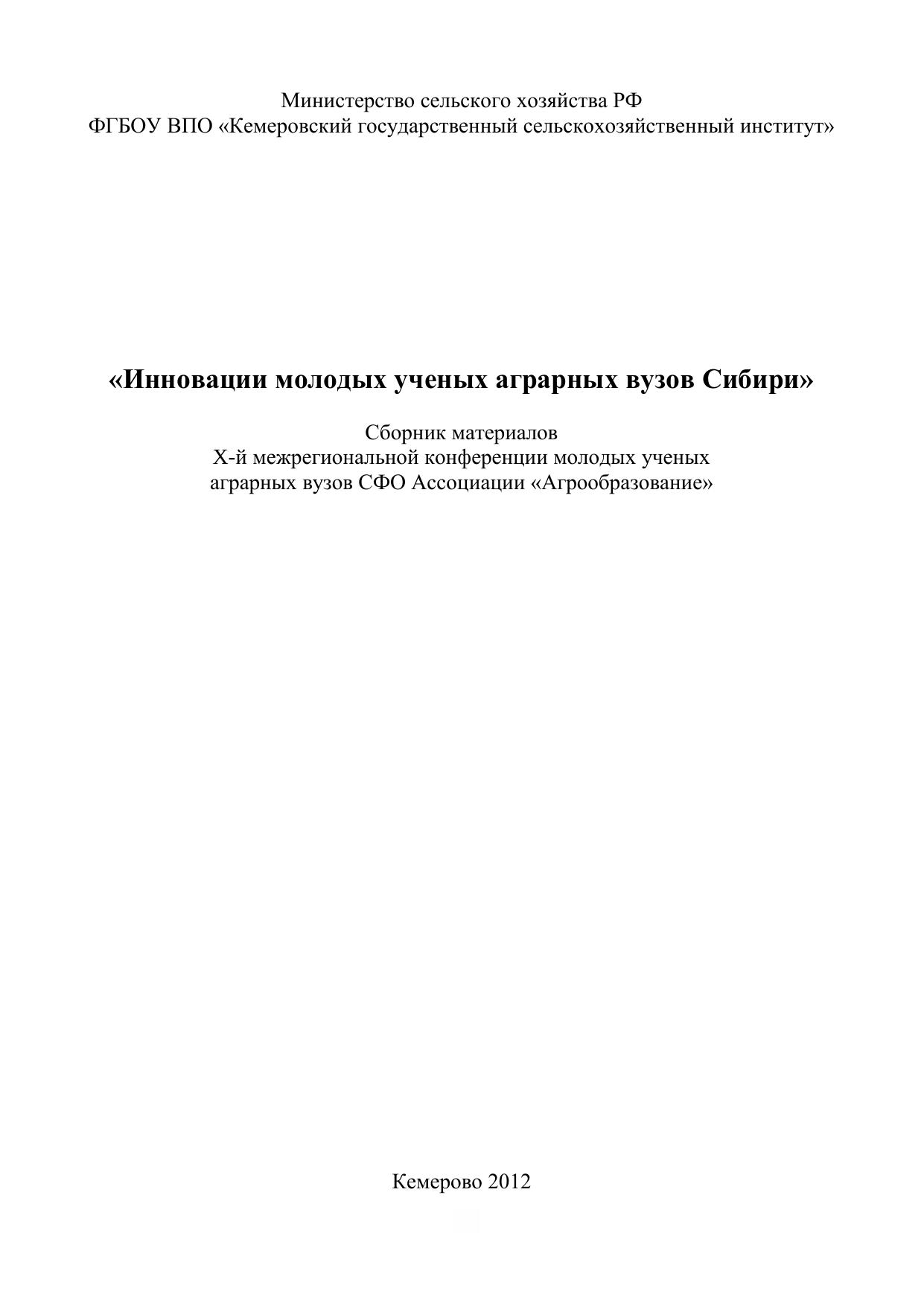 Инновации молодых ученых аграрных вузов Сибири: сб. материалов X межрегиональной конференции молодых ученых аграрных вузов СФО Ассоциации «Агрообразование» (г. Кемерово, 16–19 мая 2012 г.)