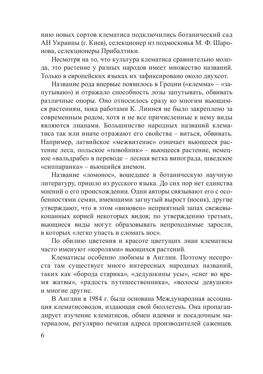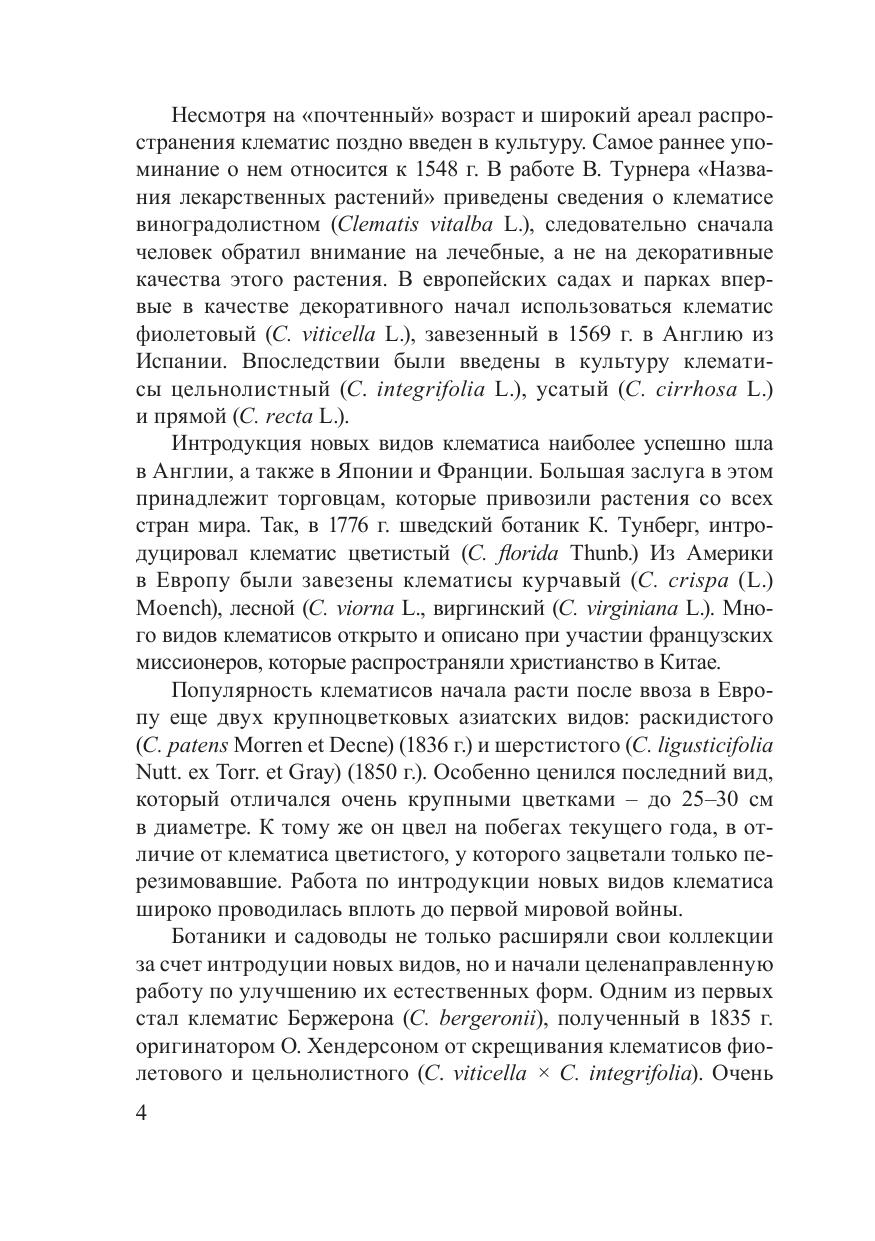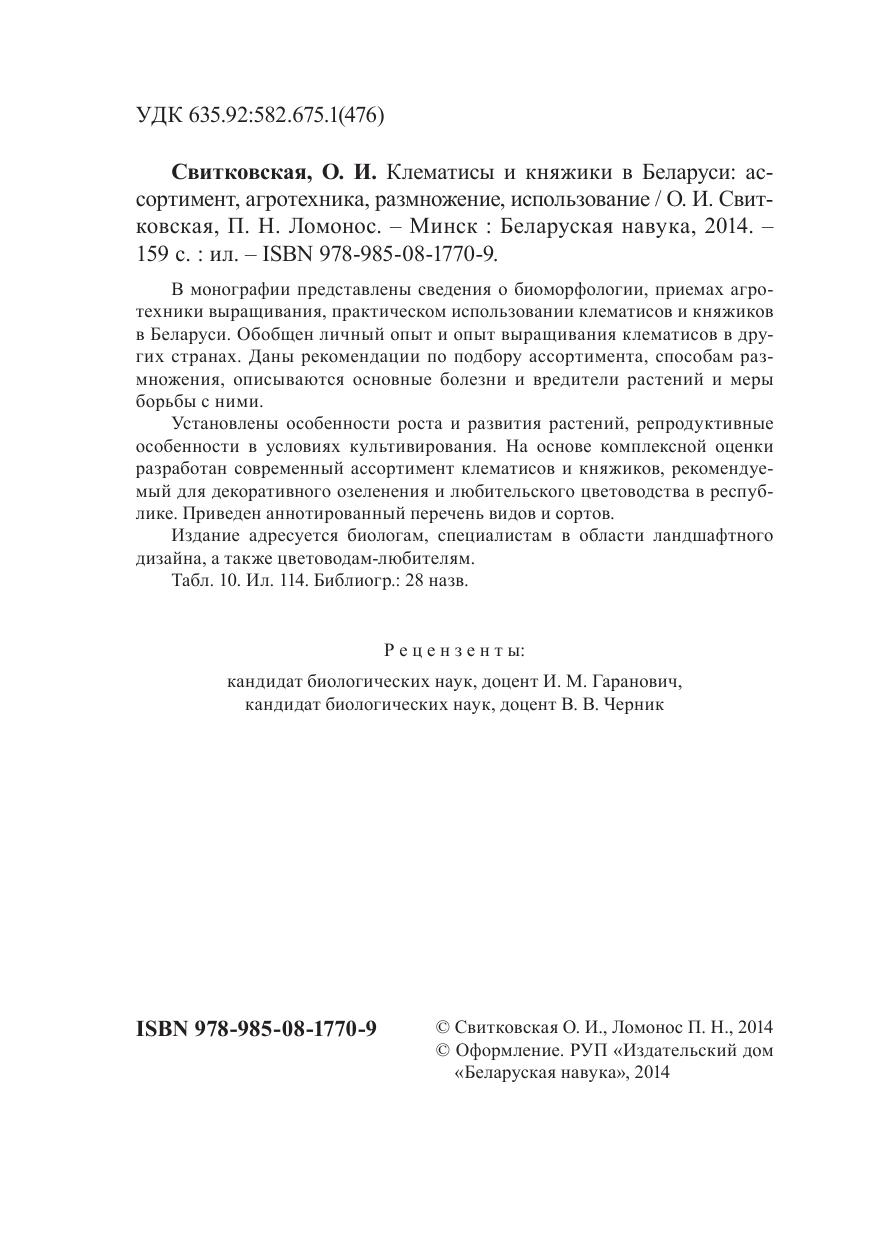 В монографии представлены сведения о биоморфологии, приемах агротехники выращивания, практическом использовании клематисов и княжиков в Беларуси. Обобщен личный опыт и опыт выращивания клематисов в других странах. Даны рекомендации по подбору ассортимента, способам размножения, описываются основные болезни и вредители растений и меры борьбы с ними. Установлены особенности роста и развития растений, репродуктивные особенности в условиях культивирования. На основе комплексной оценки разработан современный ассортимент клематисов и княжиков, рекомендуемый для декоративного озеленения и любительского цветоводства в республике. Приведен аннотированный перечень видов и сортов. Издание адресуется биологам, специалистам в области ландшафтного дизайна, а также цветоводамлюбителям.