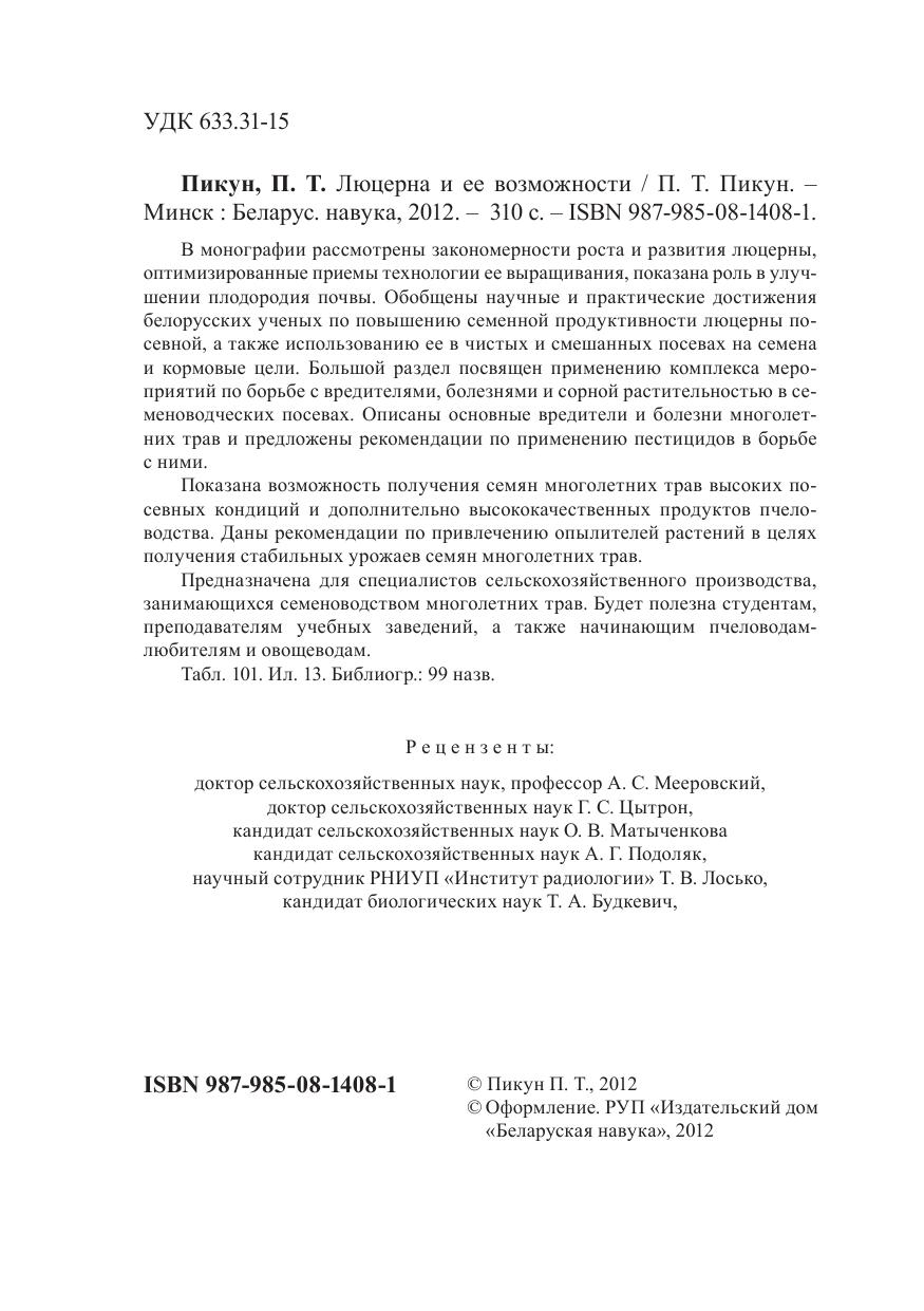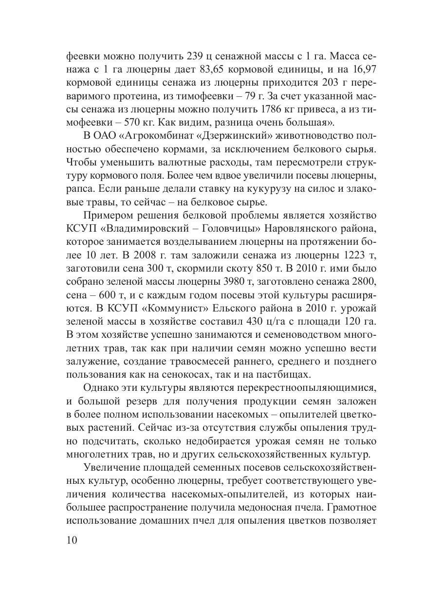 В монографии рассмотрены закономерности роста и развития люцерны, оптимизированные приемы технологии ее выращивания, показана роль в улучшении плодородия почвы. Обобщены научные и практические достижения белорусских ученых по повышению семенной продуктивности люцерны посевной, а также использованию ее в чистых и смешанных посевах на семена и кормовые цели. Большой раздел посвящен применению комплекса мероприятий по борьбе с вредителями, болезнями и сорной растительностью в семеноводческих посевах. Описаны основные вредители и болезни многолетних трав и предложены рекомендации по применению пестицидов в борьбе с ними. Показана возможность получения семян многолетних трав высоких посевных кондиций и дополнительно высококачественных продуктов пчеловодства. Даны рекомендации по привлечению опылителей растений в целях получения стабильных урожаев семян многолетних трав. Предназначена для специалистов сельскохозяйственного производства, занимающихся семеноводством многолетних трав. Будет полезна студентам, преподавателям учебных заведений, а также начинающим пчеловодам-любителям и овощеводам.