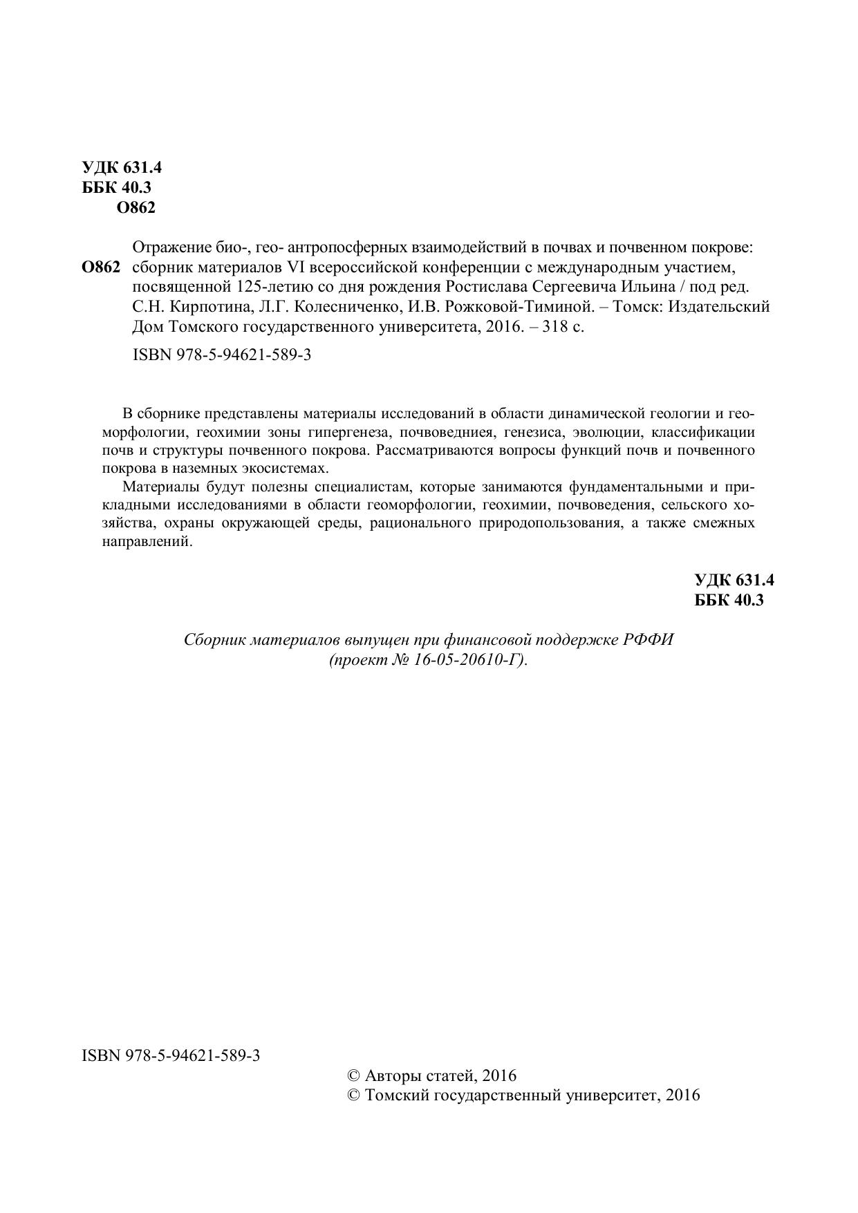 В сборнике представлены материалы исследований в области динамической геологии и геоморфологии, геохимии зоны гипергенеза, почвоведниея, генезиса, эволюции, классификации почв и структуры почвенного покрова. Рассматриваются вопросы функций почв и почвенного покрова в наземных экосистемах. Материалы будут полезны специалистам, которые занимаются фундаментальными и прикладными исследованиями в области геоморфологии, геохимии, почвоведения, сельского хозяйства, охраны окружающей среды, рационального природопользования, а также смежных направлений.