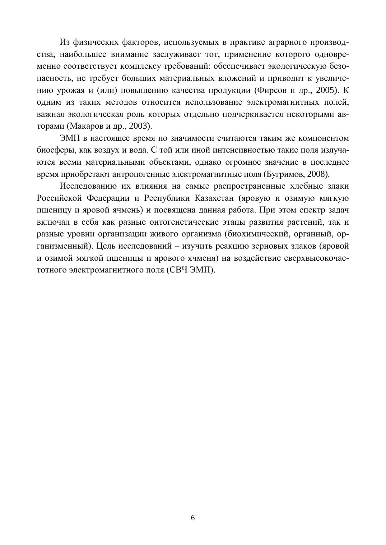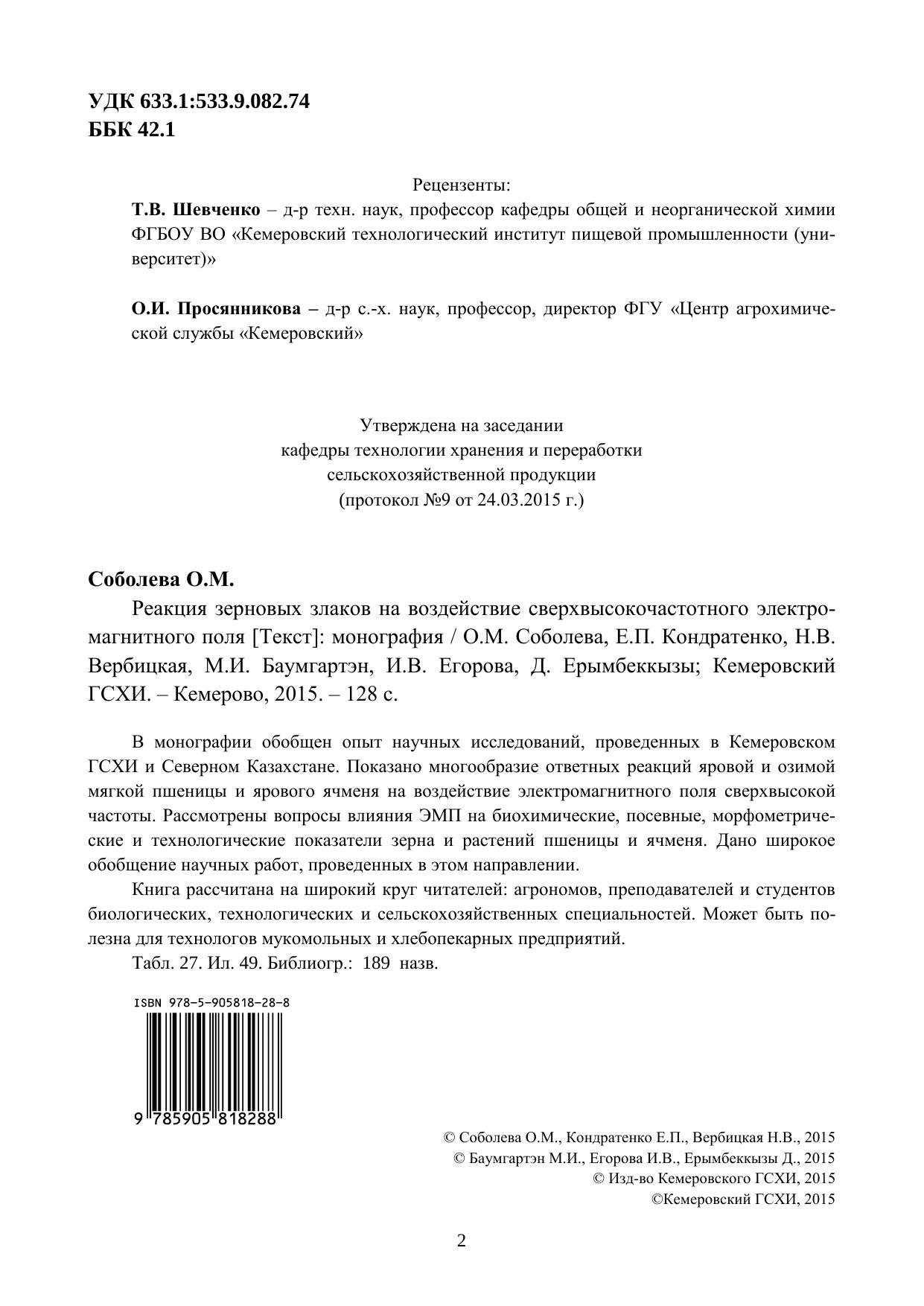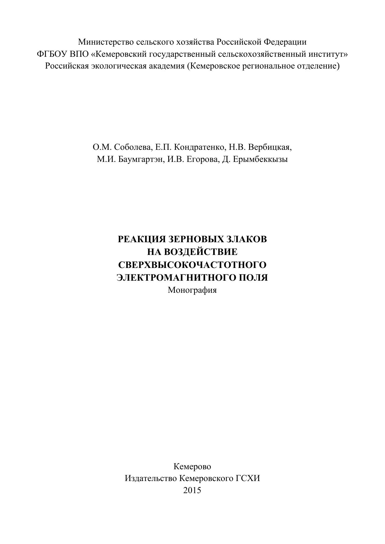 В монографии обобщен опыт научных исследований, проведенных в Кемеровском ГСХИ и Северном Казахстане. Показано многообразие ответных реакций яровой и озимой мягкой пшеницы и ярового ячменя на воздействие электромагнитного поля сверхвысокой частоты. Рассмотрены вопросы влияния ЭМП на биохимические, посевные, морфометрические и технологические показатели зерна и растений пшеницы и ячменя. Дано широкое обобщение научных работ, проведенных в этом направлении.