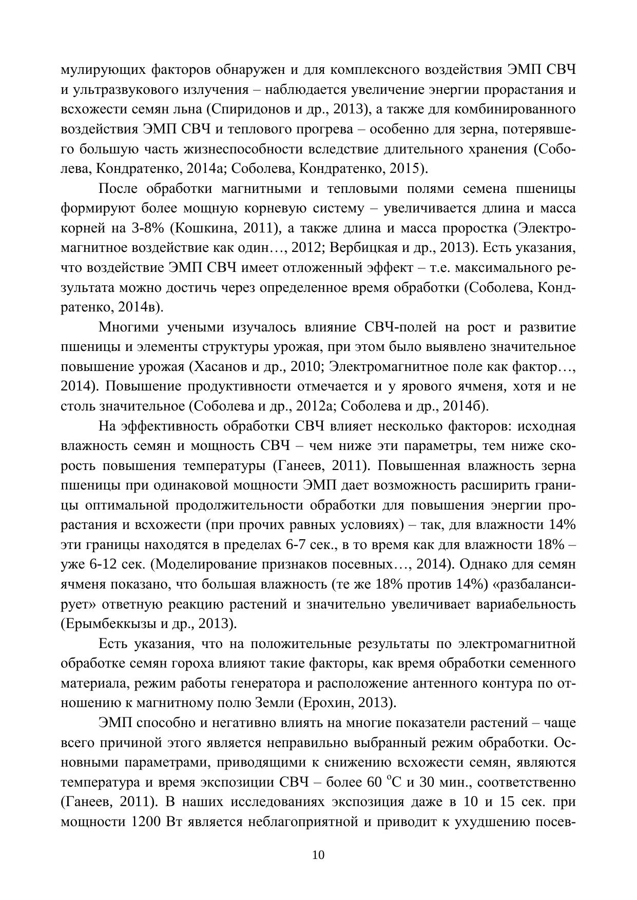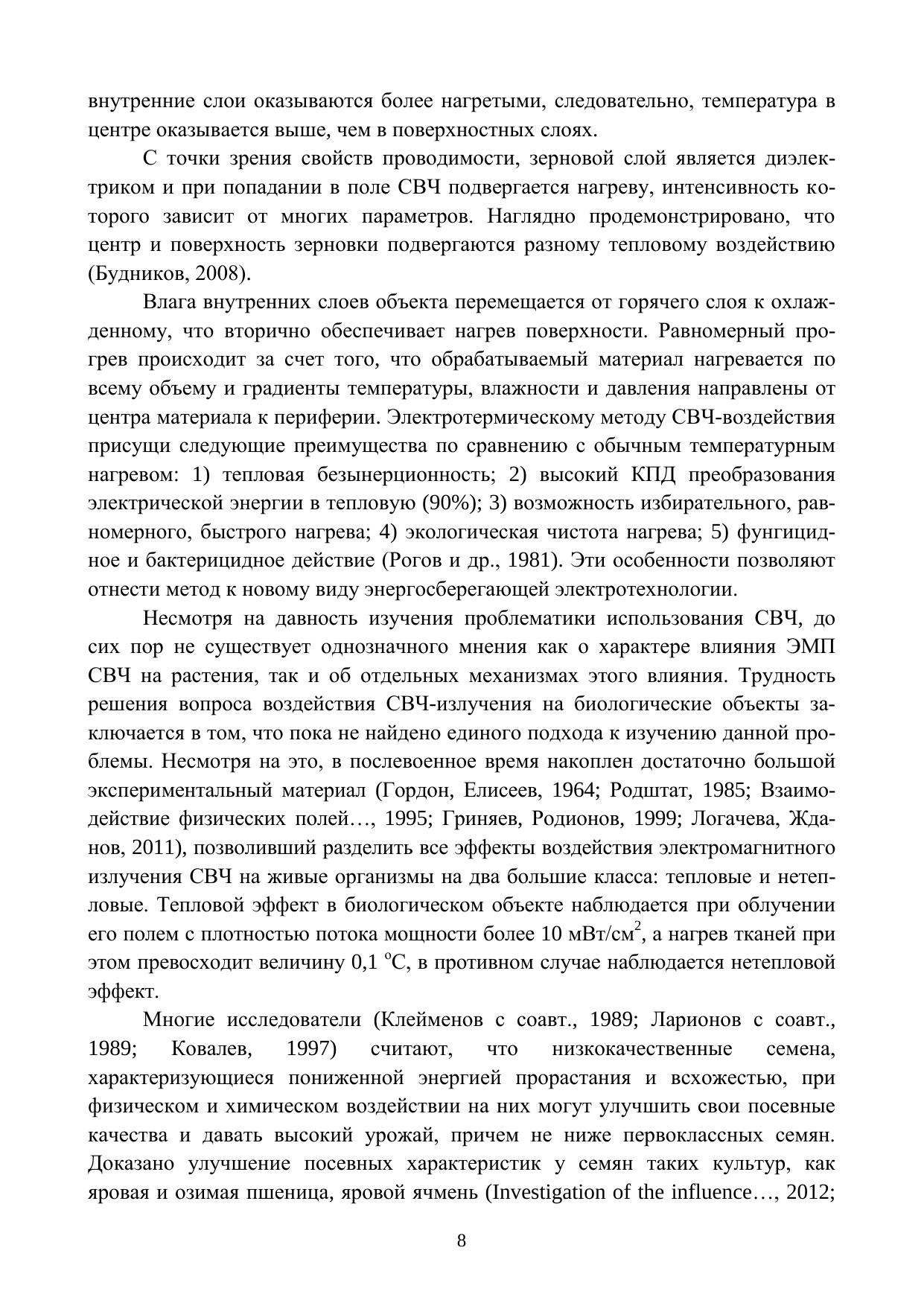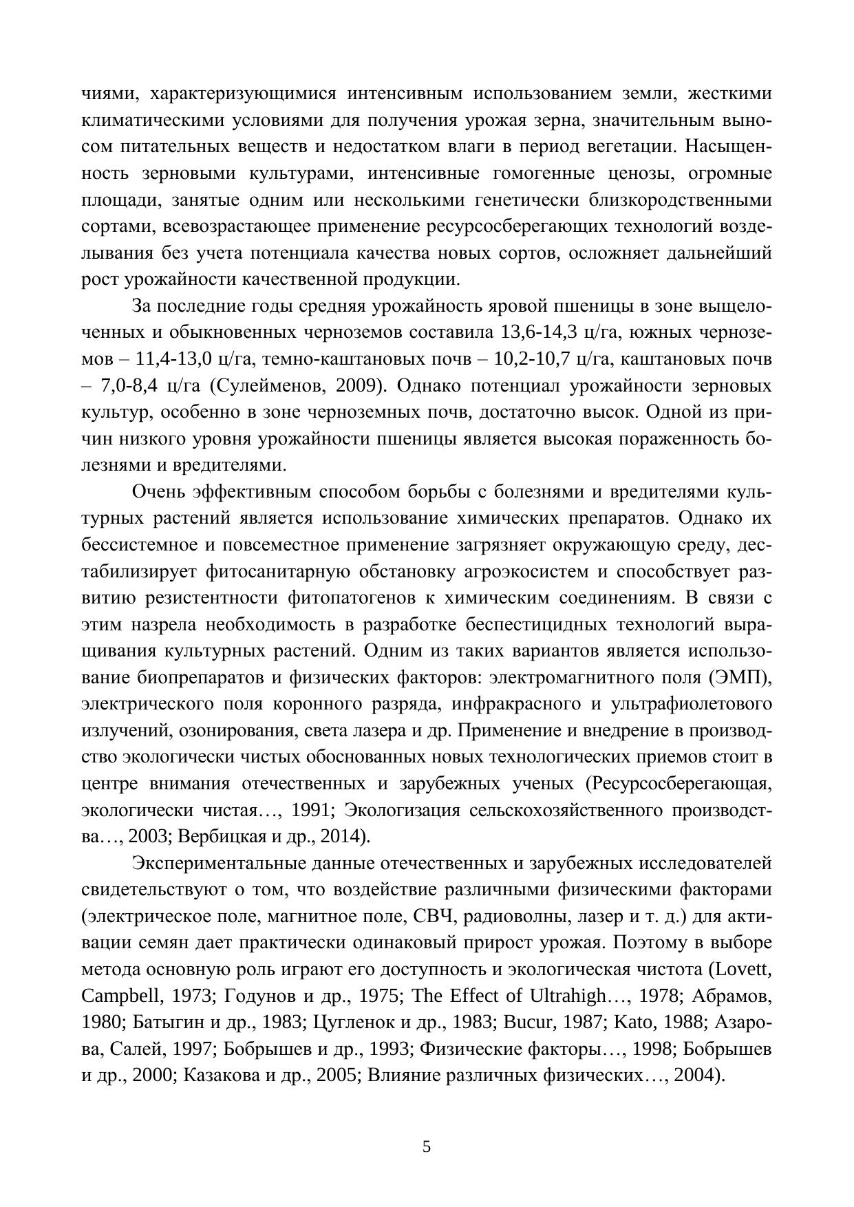 В монографии обобщен опыт научных исследований, проведенных в Кемеровском ГСХИ и Северном Казахстане. Показано многообразие ответных реакций яровой и озимой мягкой пшеницы и ярового ячменя на воздействие электромагнитного поля сверхвысокой частоты. Рассмотрены вопросы влияния ЭМП на биохимические, посевные, морфометрические и технологические показатели зерна и растений пшеницы и ячменя. Дано широкое обобщение научных работ, проведенных в этом направлении.