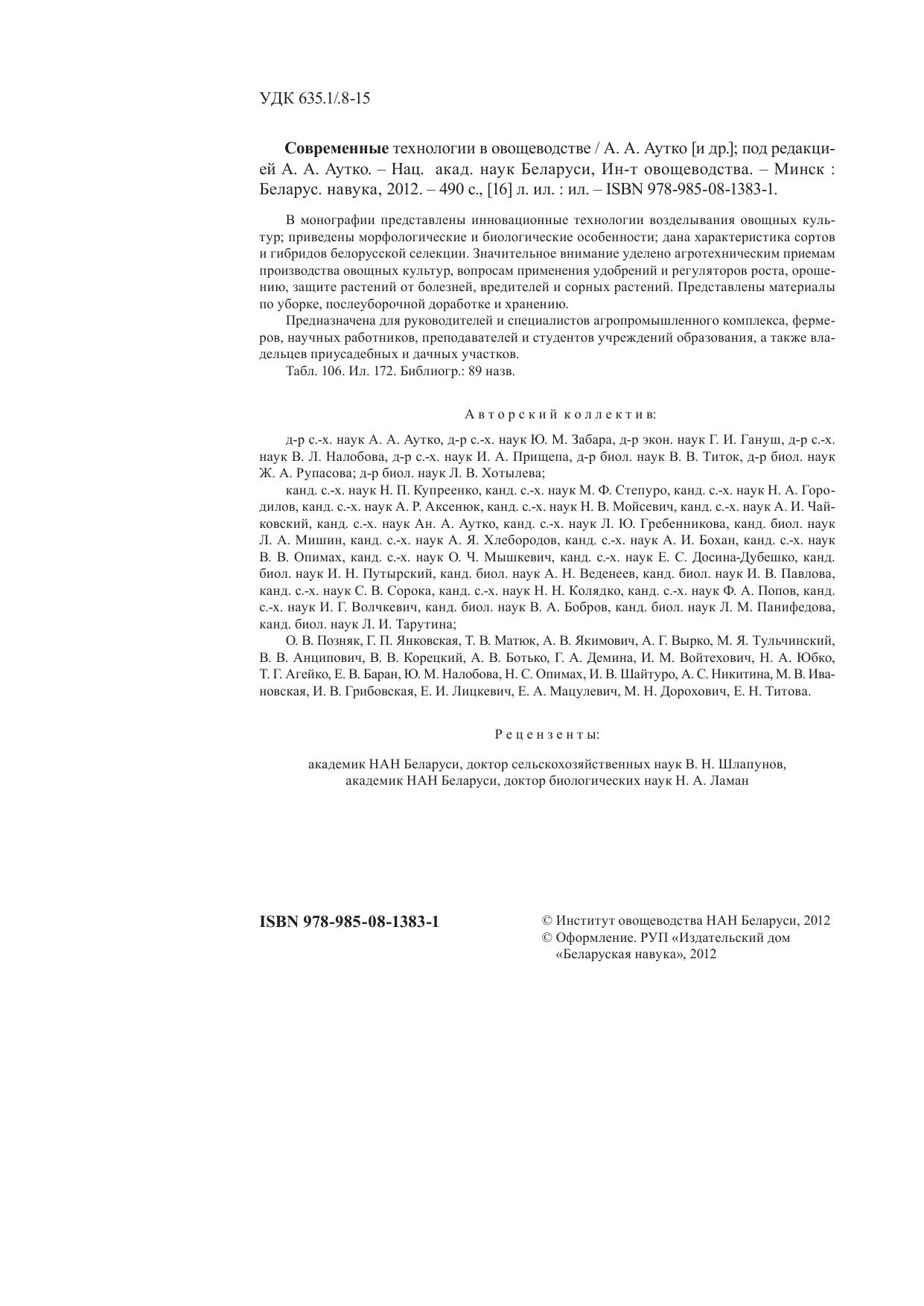 В монографии представлены инновационные технологии возделывания овощных культур, приведены морфологические и биологические особенности, дана характеристика сортов и гибридов белорусской селекции. Значительное внимание уделено агротехническим приемам производства овощных культур, вопросам применения удобрений и регуляторов роста, орошению, защите растений от болезней, вредителей и сорных растений. Представлены материалы по уборке, послеуборочной доработке и хранению. Предназначена для руководителей и специалистов агропромышленного комплекса, фермеров, научных работников, преподавателей и студентов учреждений образования, а также владельцев приусадебных и дачных участков.
