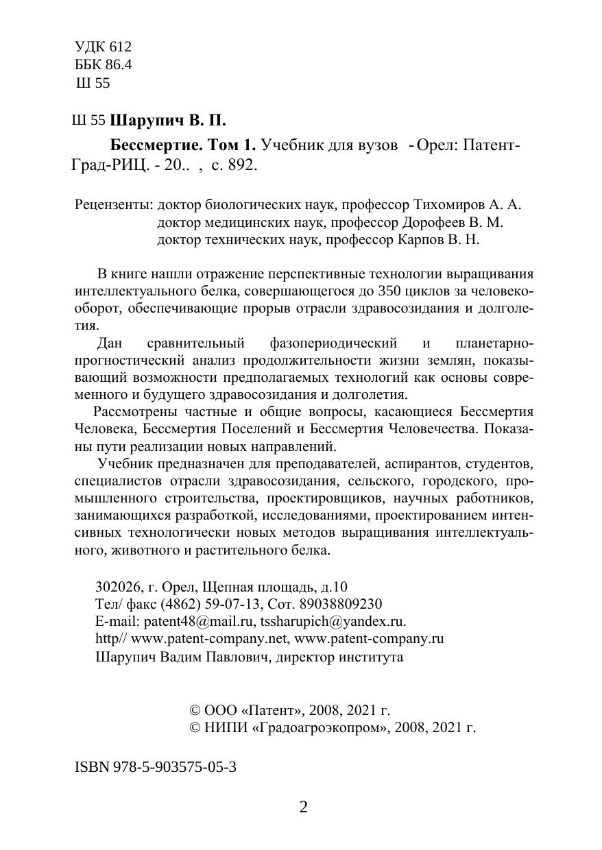 В книге нашли отражение перспективные технологии выращивания интеллектуального белка, совершающегося до 350 циклов за человекооборот, обеспечивающие прорыв отрасли здравосозидания и долголетия. Дан сравнительный фазопериодический и планетарно прогностический анализ продолжительности жизни землян, показы вающий возможности предполагаемых технологий как основы современного и будущего здравосозидания и долголетия. Рассмотрены частные и общие вопросы, касающиеся Бессмертия Человека, Бессмертия Поселений и Бессмертия Человечества. Показа ны пути реализации новых направлений. Учебник предназначен для преподавателей, аспирантов, студентов, специалистов отрасли здравосозидания, сельского, городского, промышленного строительства, проектировщиков, научных работников, занимающихся разработкой, исследованиями, проектированием интенсивных технологически новых методов выращивания интеллектуального, животного и растительного белка.