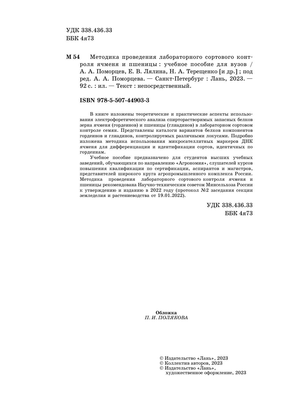 В книге изложены теоретические и практические аспекты использования электрофоретического анализа спирторастворимых запасных белков зерна ячменя (гордеинов) и пшеницы (глиадинов) в лабораторном сортовом контроле семян. Представлены каталоги вариантов белков компонентов гордеинов и глиадинов, контролируемых различными локусами. Подробно изложена методика использования микросателлитных маркеров ДНК ячменя для дифференциации и идентификации сортов, идентичных по гордеинам. Учебное пособие предназначено для студентов высших учебных заведений, обучающихся по направлению «Агрономия», слушателей курсов повышения квалификации по сертификации, аспирантов и магистров, представителей широкого круга агропромышленного комплекса России. Методика проведения лабораторного сортового контроля ячменя и пшеницы рекомендована Научно-техническим советом Минсельхоза России к утверждению и изданию в 2022 году (протокол №2 заседания секции земледелия и растениеводства от 19.01.2022).