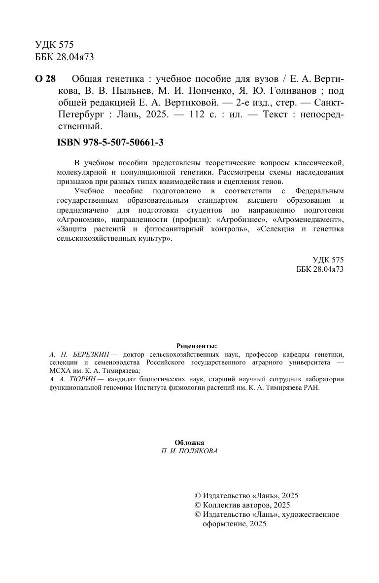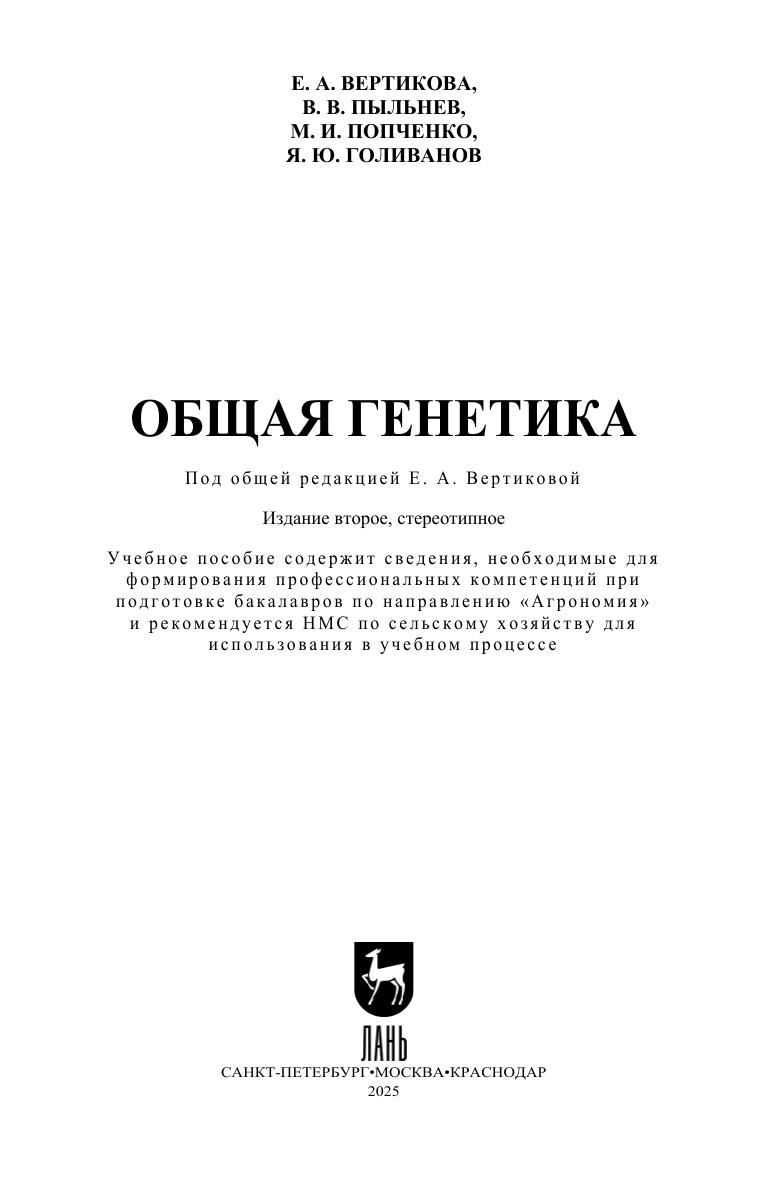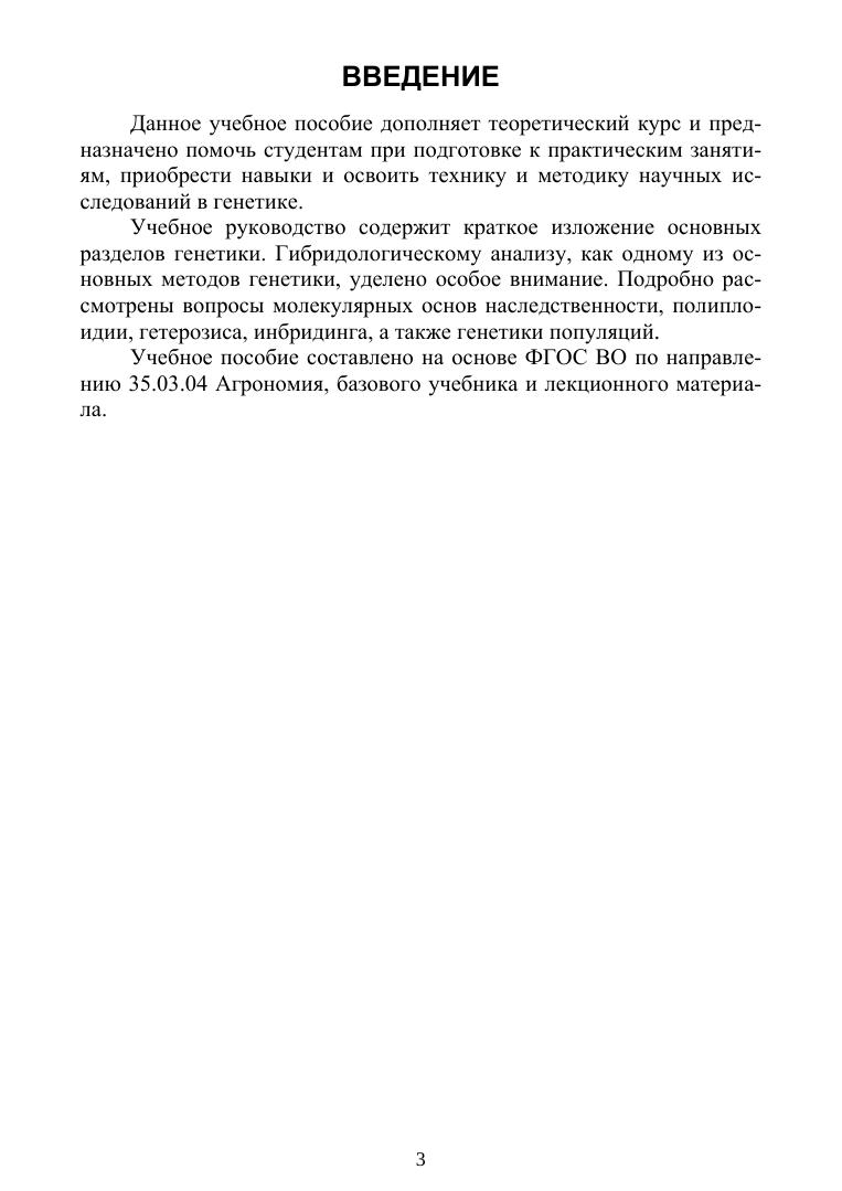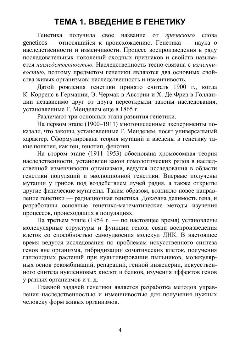 В учебном пособии представлены теоретические вопросы классической, молекулярной и популяционной генетики. Рассмотрены схемы наследования признаков при разных типах взаимодействия и сцепления генов. Учебное пособие подготовлено в соответствии с Федеральным государственным образовательным стандартом высшего образования и предназначено для подготовки студентов по направлению подготовки «Агрономия», направленности (профили): «Агробизнес», «Агроменеджмент», «Защита растений и фитосанитарный контроль», «Селекция и генетика сельскохозяйственных культур».