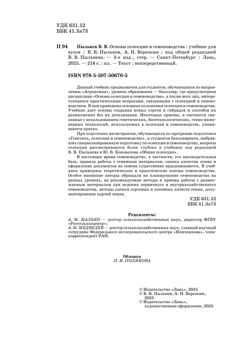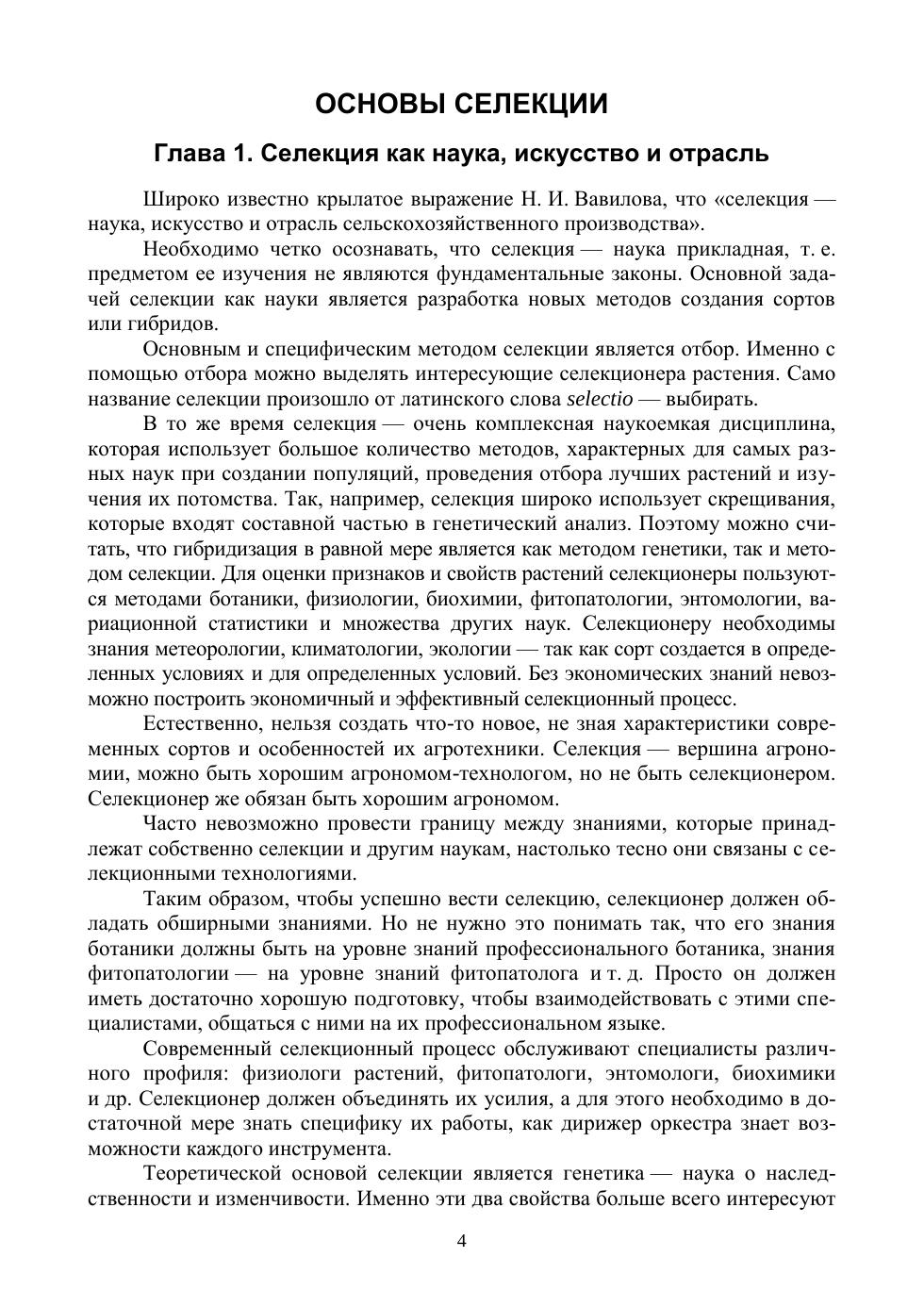 Данный учебник предназначен для студентов, обучающихся по направ-лению «Агрономия», уровень образования — бакалавр, где предусмотрена дисциплина «Основы селекции и семеноводства», а также всех лиц, интересующихся практическими вопросами, связанными с селекцией и семеноводством. В нем приведены основные положения селекции и семеноводства. Учебник дает основы создания новых сортов и гибридов и способов их размножения без их детализации. Некоторые приемы, в частности связанные с использованием генетических, биотехнологических, генно-инженерных технологий, используемых в селекции и семеноводстве, упоминаются кратко. При подготовке магистрантов, обучающихся по программе подготовки «Генетика, селекция и семеноводство», и студентов бакалавриата, выбравших специализированную подготовку по селекции и семеноводству, вопросы селекции рассматриваются более глубоко в учебнике под редакцией В. В. Пыльнева и Ю. Б. Коновалова «Общая селекция». В настоящее время семеноводство, в частности, его законодательная база, правила работы с семенным материалом, оценка качества семян и оформление документов на семена существенно видоизменяются. В учебнике приведены теоретические и практические основы семеноводства. Особое внимание авторы обращали на планирование семеноводства на разных уровнях, на рекомендуемые методы и приемы работы с размножаемым материалом при ведении первичного и внутрихозяйственного семеноводства, методы оценки сортовых и посевных качеств семян, документирование партий семян.