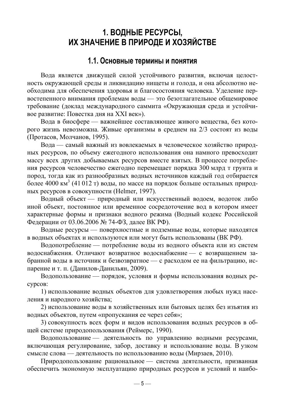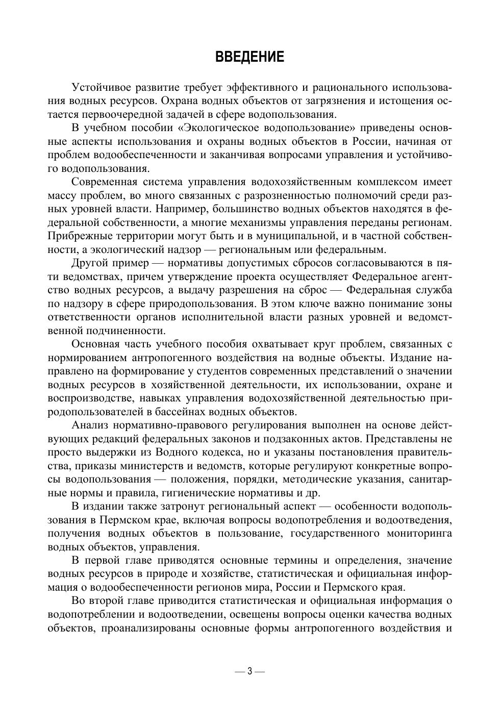 В учебном пособии даны основные аспекты использования и охраны водных объектов в России. Рассмотрены вопросы водообеспеченности, водопотребления, водоотведения, получения водных объектов в пользование, управления с сфере водопользования, устойчивого использования и охраны водных ресурсов. Особое внимание уделено негативному воздействию хозяйственной и иной деятельности на водные объекты, нормированию этого воздействия. Приводится статистическая и официальная информация о водопользовании. Анализ нормативно-правового регулирования выполнен на основе действующих редакций федеральных законов и подзаконных актов. В издании также затронут региональный аспект — особенности водопользования в Пермском крае.