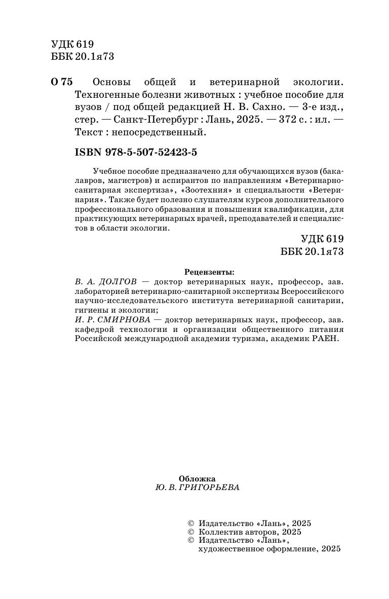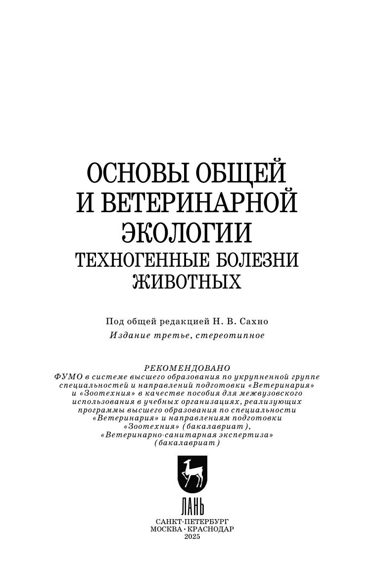 Учебное пособие предназначено для обучающихся вузов-бакалавров, магистров и аспирантов по направлениям «Ветеринарно-санитарная экспертиза», «Зоотехния» и специальности «Ветеринария». Также будет полезно слушателям курсов дополнительного профессионального образования и повышения квалификации, для практикующих ветеринарных врачей, преподавателей и специалистов в области экологии.