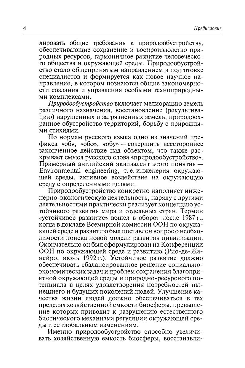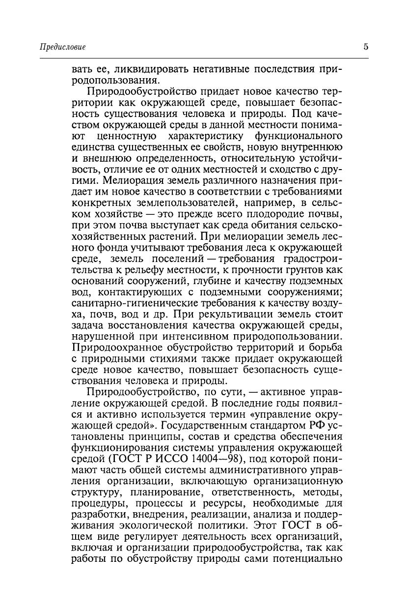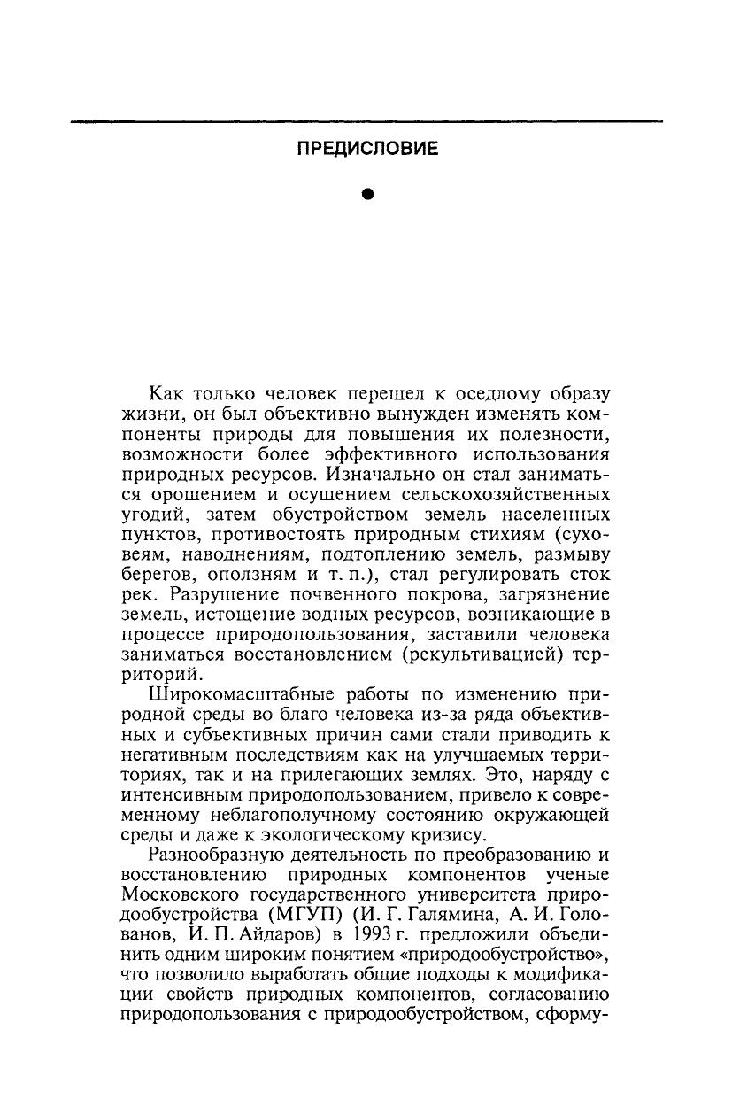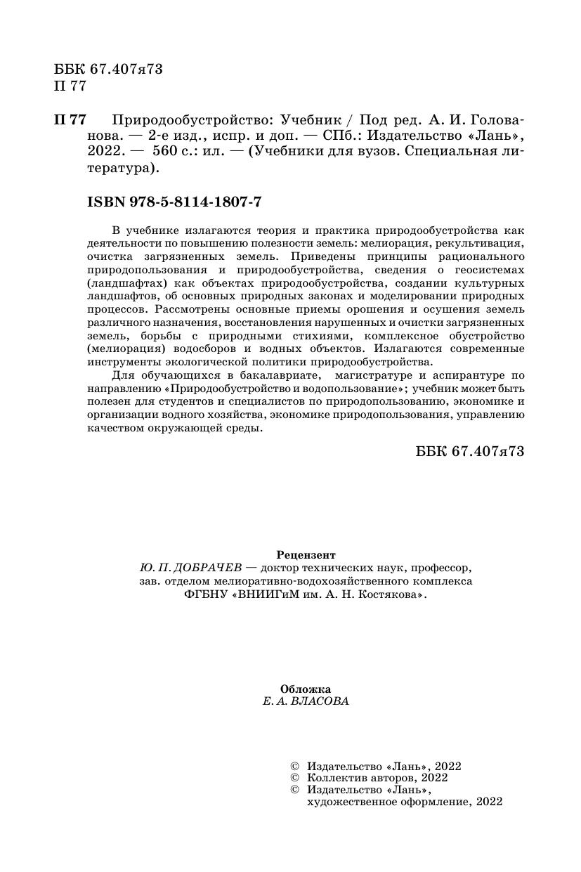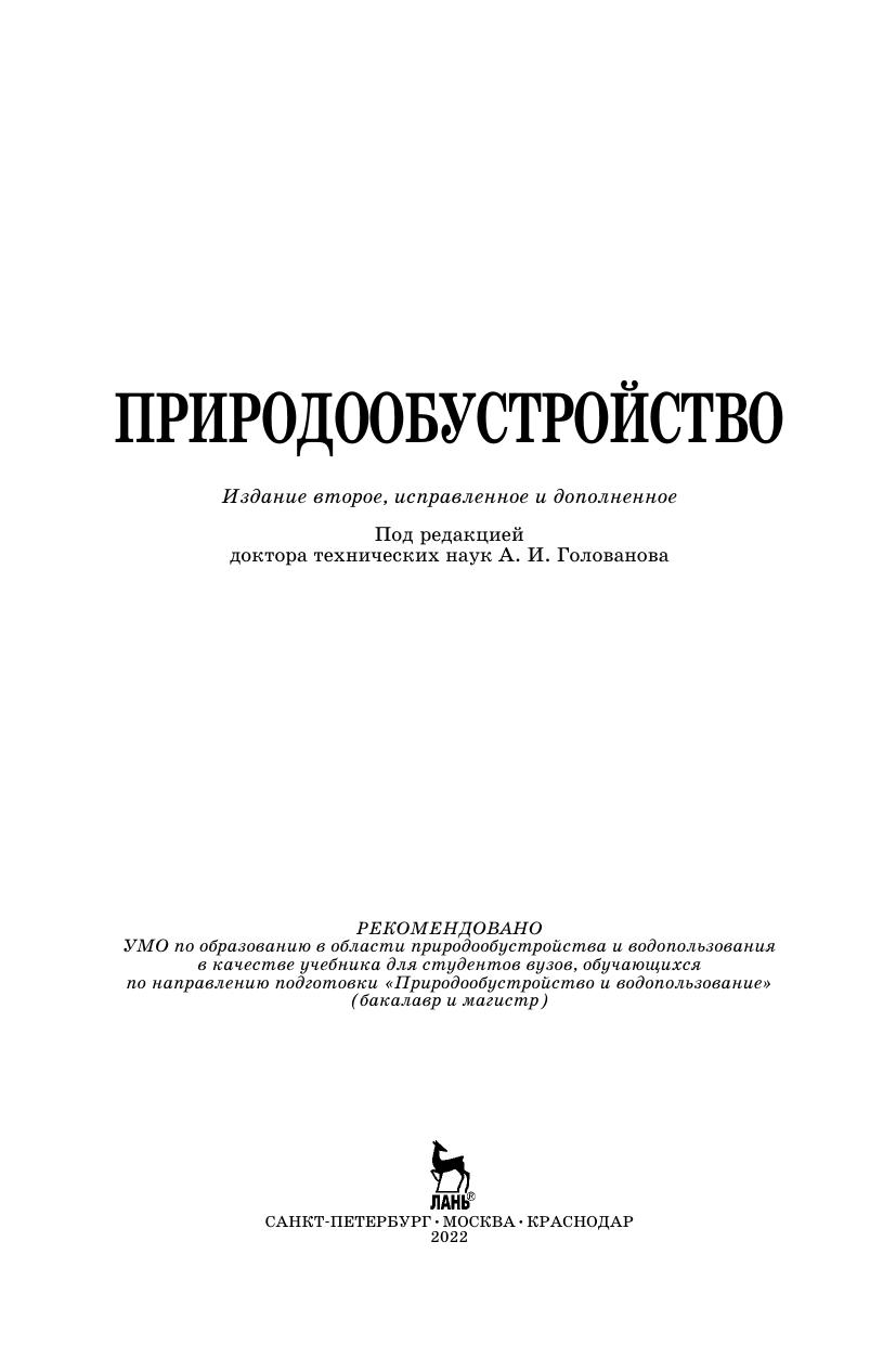 В учебнике излагаются теория и практика природообустройства как деятельности по повышению полезности земель: мелиорация, рекультивация, очистка загрязненных земель. Приведены принципы рационального природопользования и природообустройства, сведения о геосистемах (ландшафтах) как объектах природообустройства, создании культурных ландшафтов, об основных природных законах и моделировании природных процессов. Рассмотрены основные приемы орошения и осушения земель различного назначения, восстановления нарушенных и очистки загрязненных земель, борьбы с природными стихиями, комплексное обустройство (мелиорация) водосборов и водных объектов. Излагаются современные инструменты экологической политики природообустройства. Для обучающихся в специалитете, бакалавриате, магистратуре и аспирантуре по направлениям: «Природообустройство» и «Водные ресурсы и водопользование», он может быть полезен для студентов и специалистов по природопользованию, экономике и организации водного хозяйства, экономике природопользования, управлению качеством окружающей среды.