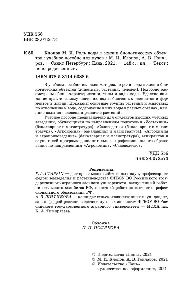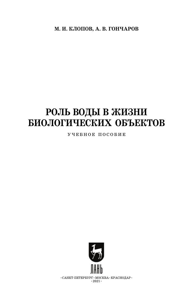 В учебном пособии изложен материал о роли воды в жизни биологических объектов (животные, растения, человек). Подробно рассмотрены общие характеристики, типы и виды воды. Уделено внимание практическому значению воды, биогенных элементов и ферментов в жизни. Показаны основные группы растений и животных по отношению к воде, содержание в них воды в разных органах, влияние воды на человека и развитие растений. Учебное пособие предназначено для студентов высших учебных заведений, обучающихся по направлениям подготовки «Зоотехния» (бакалавриат и магистратура), «Садоводство» (бакалавриат и магистратура), «Агрономия» (ба-калавриат и магистратура), «Агрохимия и агропочвоведение» (бакалавриат и магистратура), аспирантов и слушателей программ дополнительного профес-сионального образования по направлениям «Агрономия», «Садоводство».