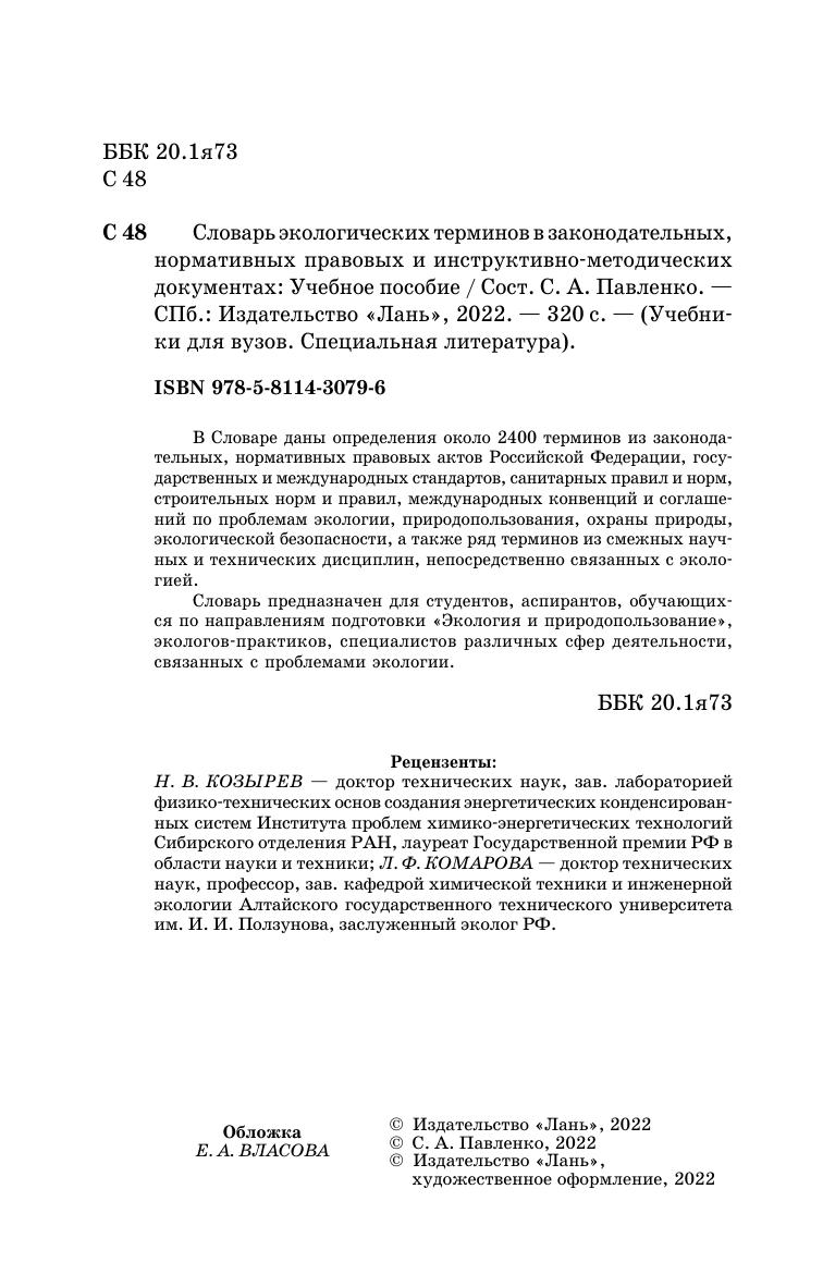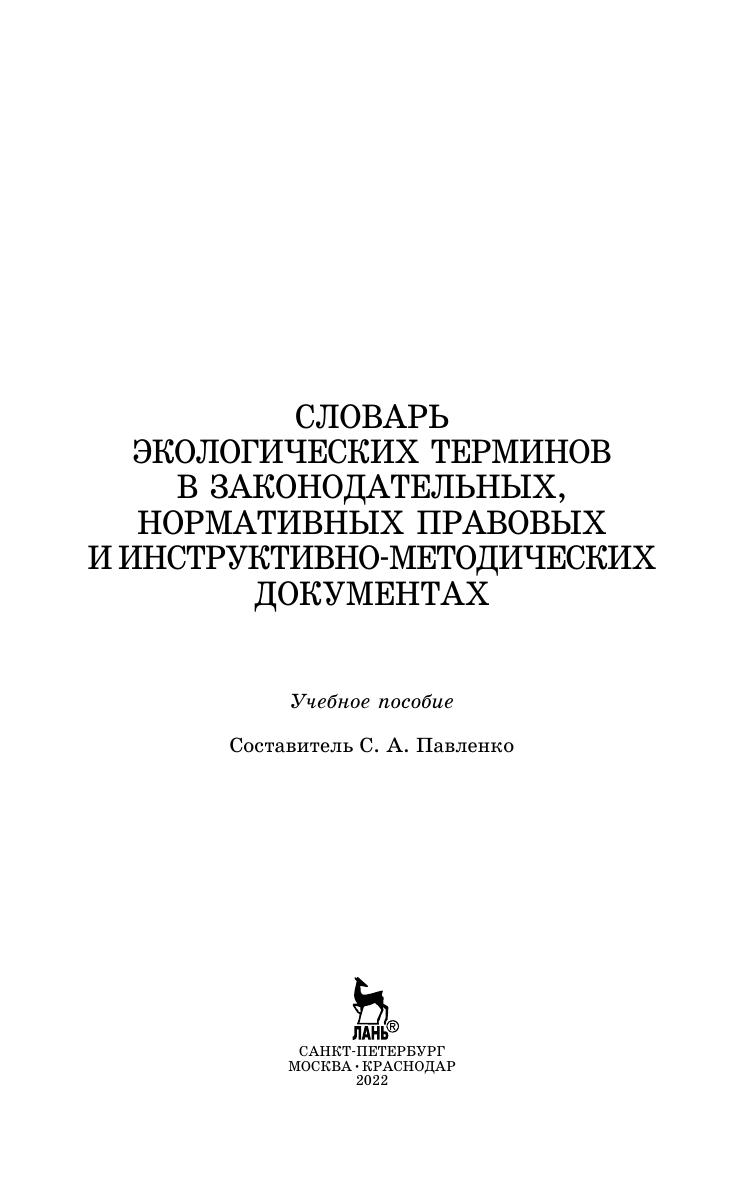 В Словаре даны определения около 2400 терминов из законодательных, нормативных правовых актов Российской Федерации, государственных и международных стандартов, санитарных правил и норм, строительных норм и правил, международных конвенций и соглашений по проблемам экологии, природопользования, охраны природы, экологической безопасности, а также ряд терминов из смежных научных и технических дисциплин, непосредственно связанных с экологией. Словарь предназначен для студентов, аспирантов, обучающихся по экологическим специальностям, экологов-практиков, специалистов различных сфер деятельности, связанных с проблемами экологии.