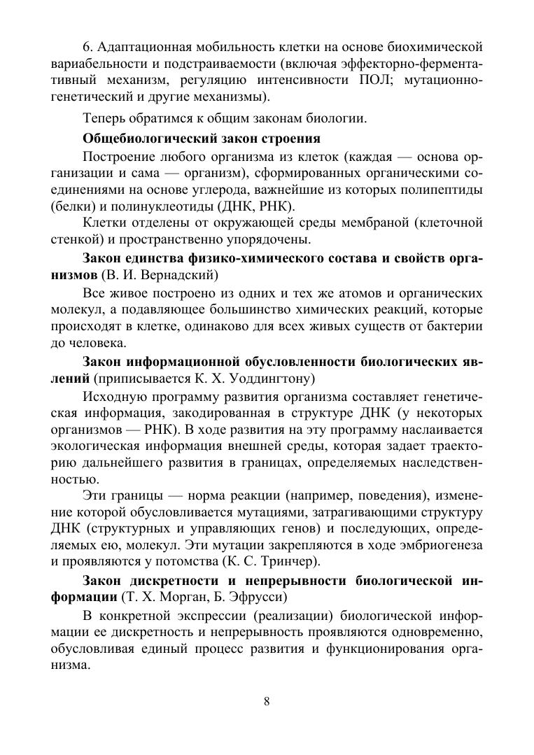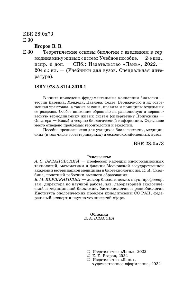 В книге приведены фундаментальные концепции биологии — теории Дарвина, Менделя, Павлова, Селье, Вернадского и их современная трактовка, а также законы, правила и принципы отдельных ее разделов. Особое внимание обращено на равновесную и неравновесную термодинамику живых систем (синергетику Пригожина — Онзагера — Виам) и теорию биологической информации. Отдельное место отведено проблемам геронтологии и экологии. Пособие предназначено для учащихся биологических, медицинских (в том числе зооветеринарных) и сельскохозяйственных вузов.