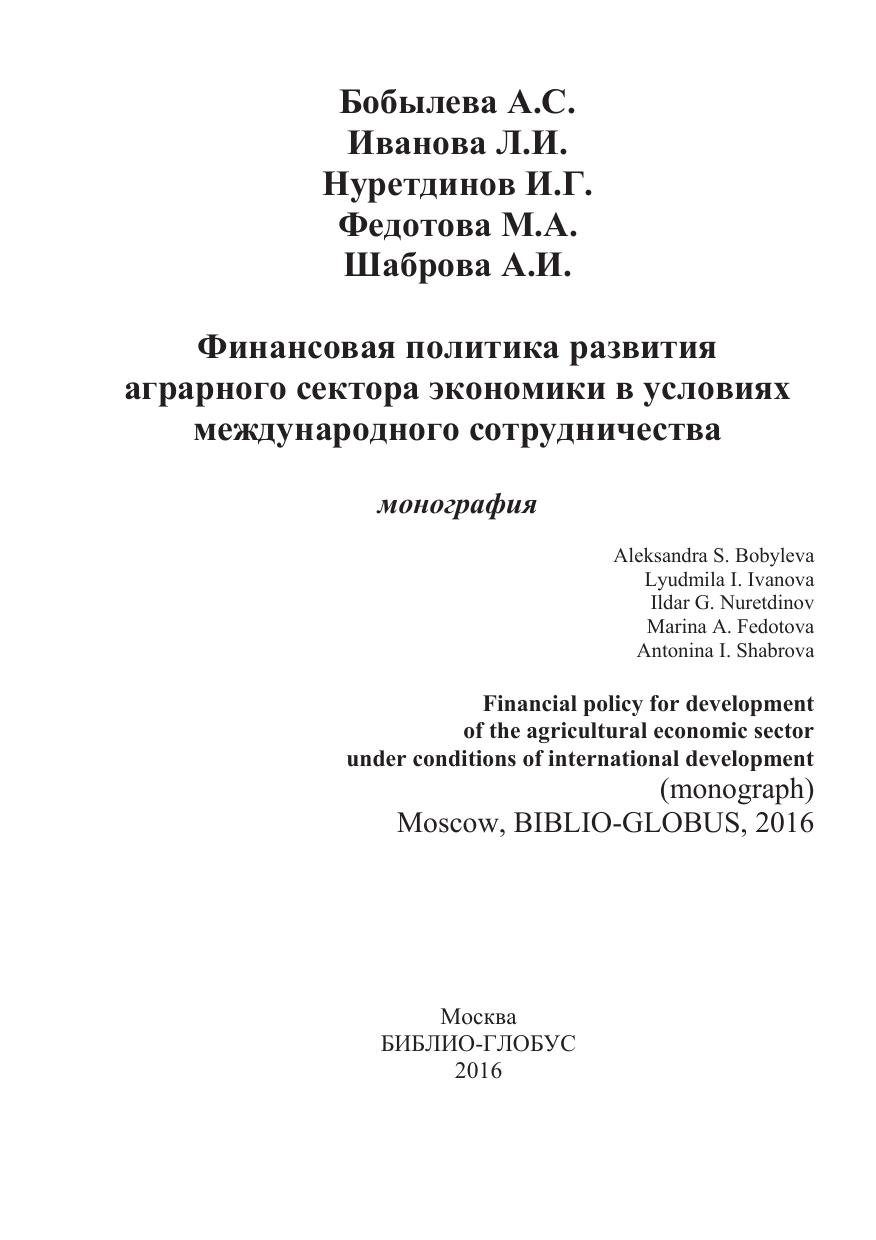 Ключевые слова: аграрный сектор экономики, международное сотрудничество, Всемирная торговая организация, финансовая политика, налоговая политика, ценовая политика, кредитная политика, амортизационная политика, страхование, финансовый анализ.