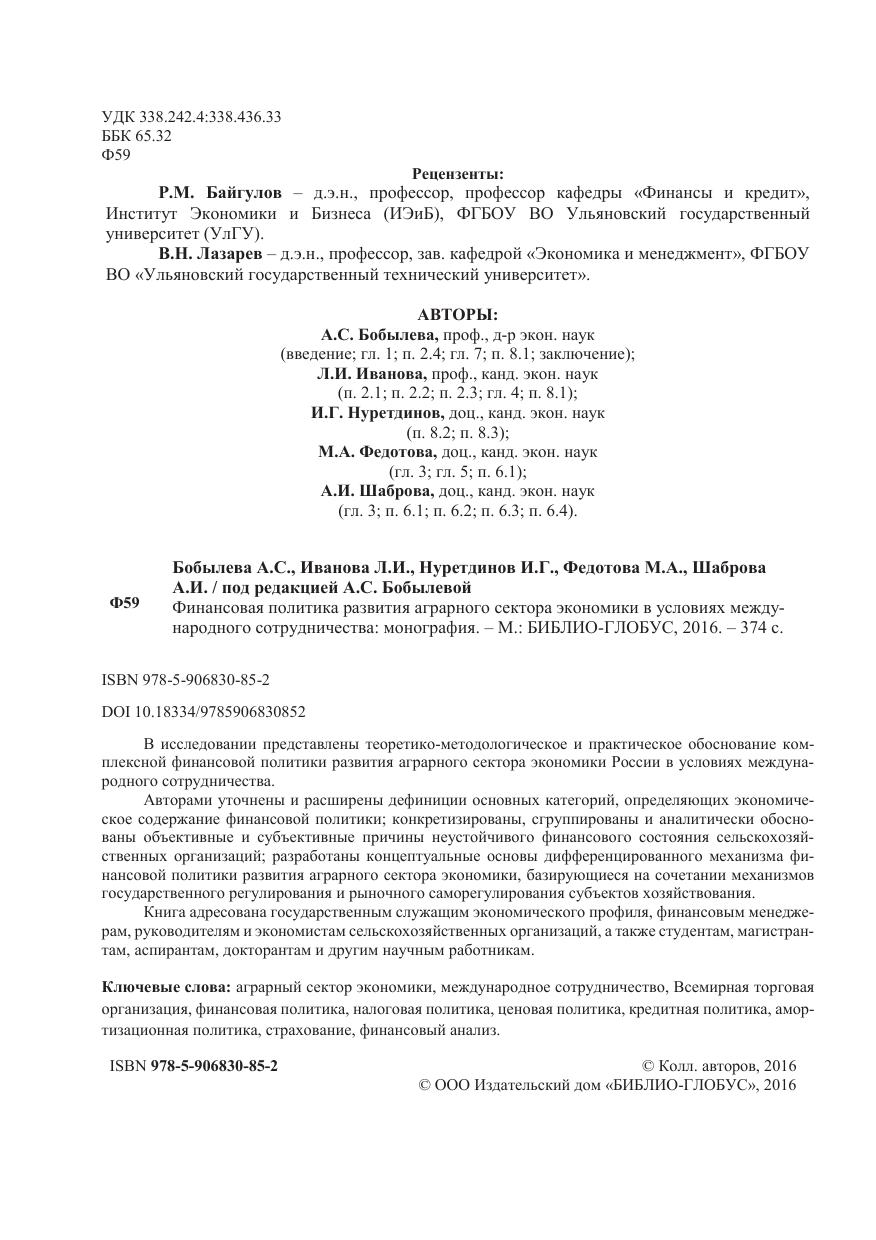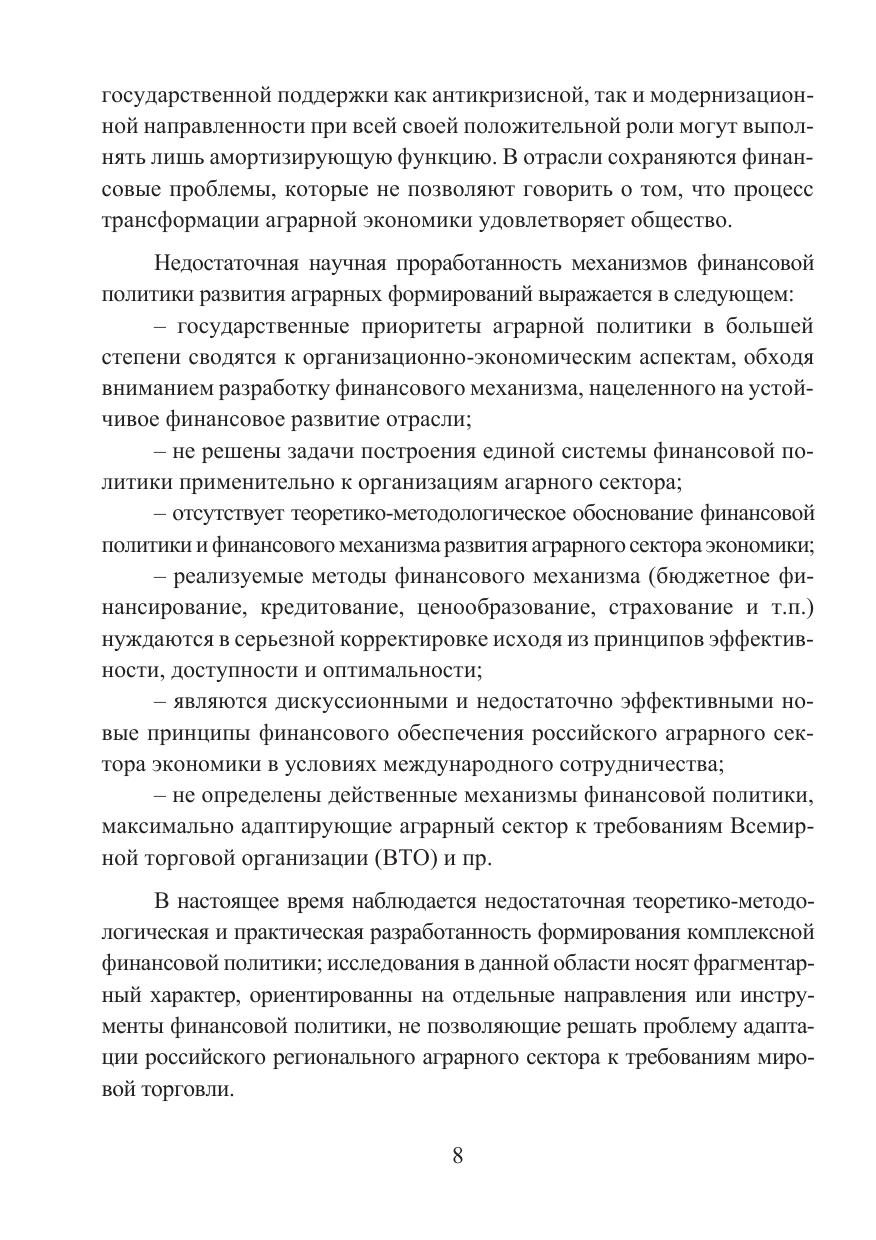 В исследовании представлены теоретико-методологическое и практическое обоснование комплексной финансовой политики развития аграрного сектора экономики России в условиях международного сотрудничества. Авторами уточнены и расширены дефиниции основных категорий, определяющих экономическое содержание финансовой политики; конкретизированы, сгруппированы и аналитически обоснованы объективные и субъективные причины неустойчивого финансового состояния сельскохозяйственных организаций; разработаны концептуальные основы дифференцированного механизма финансовой политики развития аграрного сектора экономики, базирующиеся на сочетании механизмов государственного регулирования и рыночного саморегулирования субъектов хозяйствования.