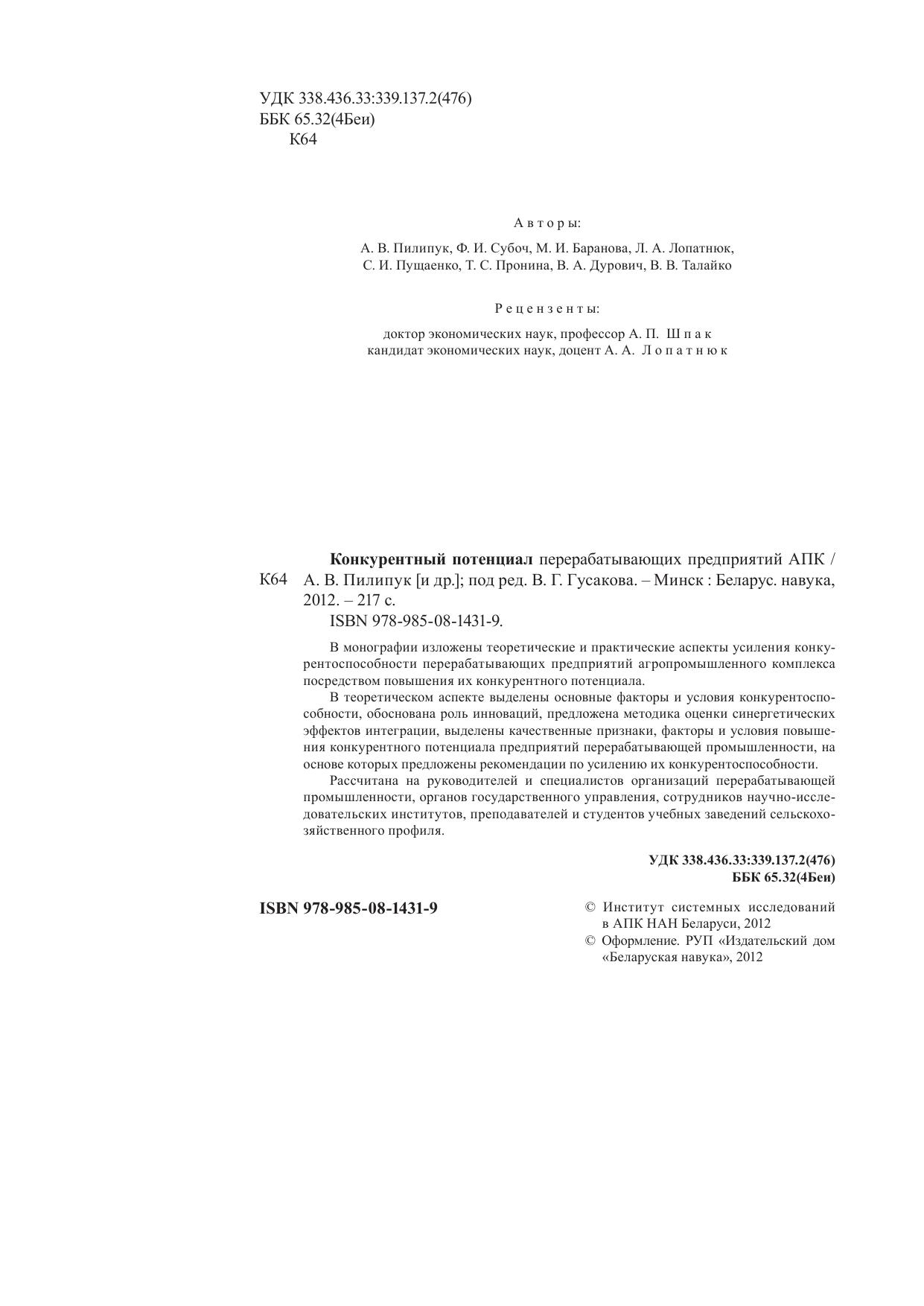 В монографии изложены теоретические и практические аспекты усиления конкурентоспособности перерабатывающих предприятий агропромышленного комплекса посредством повышения их конкурентного потенциала. В теоретическом аспекте выделены основные факторы и условия конкурентоспособности, обоснована роль инноваций, предложена методика оценки синергетических эффектов интеграции, выделены качественные признаки, факторы и условия повышения конкурентного потенциала предприятий перерабатывающей промышленности, на основе которых предложены рекомендации по усилению их конкурентоспособности. Рассчитана на руководителей и специалистов организаций перерабатывающей промышленности, органов государственного управления, сотрудников научно-исследовательских институтов, преподавателей и студентов учебных заведений сельскохозяйственного профиля.
