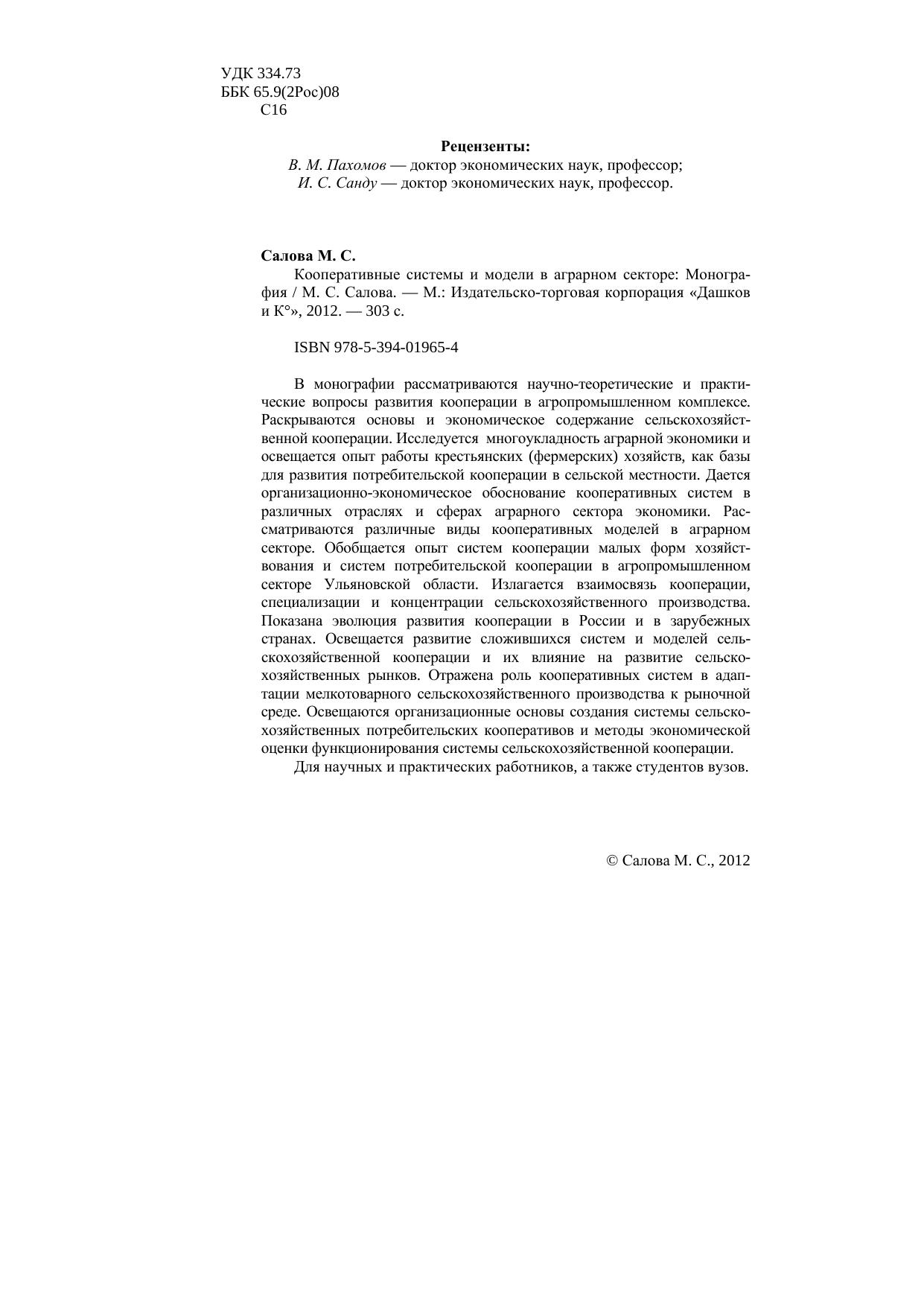 В монографии рассматриваются научно-теоретические и практические вопросы развития кооперации в агропромышленном комплексе.Раскрываются основы и экономическое содержание сельскохозяйст-венной кооперации. Исследуется многоукладность аграрной экономики иосвещается опыт работы крестьянских (фермерских) хозяйств, как базыдля развития потребительской кооперации в сельской местности. Дается организационно-экономическое обоснование кооперативных систем вразличных отраслях и сферах аграрного сектора экономики. Рас-сматриваются различные виды кооперативных моделей в аграрномсекторе. Обобщается опыт систем кооперации малых форм хозяйст-вования и систем потребительской кооперации в агропромышленномсекторе Ульяновской области. Излагается взаимосвязь кооперации,специализации и концентрации сельскохозяйственного производства.Показана эволюция развития кооперации в России и в зарубежныхстранах. Освещается развитие сложившихся систем и моделей сельскохозяйственной кооперации и их влияние на развитие сельско-хозяйственных рынков. Отражена роль кооперативных систем в адап-тации мелкотоварного сельскохозяйственного производства к рыночнойсреде. Освещаются организационные основы создания системы сельско-хозяйственных потребительских кооперативов и методы экономическойоценки функционирования системы сельскохозяйственной кооперации.Для научных и практических работников, а также студентов вузов.