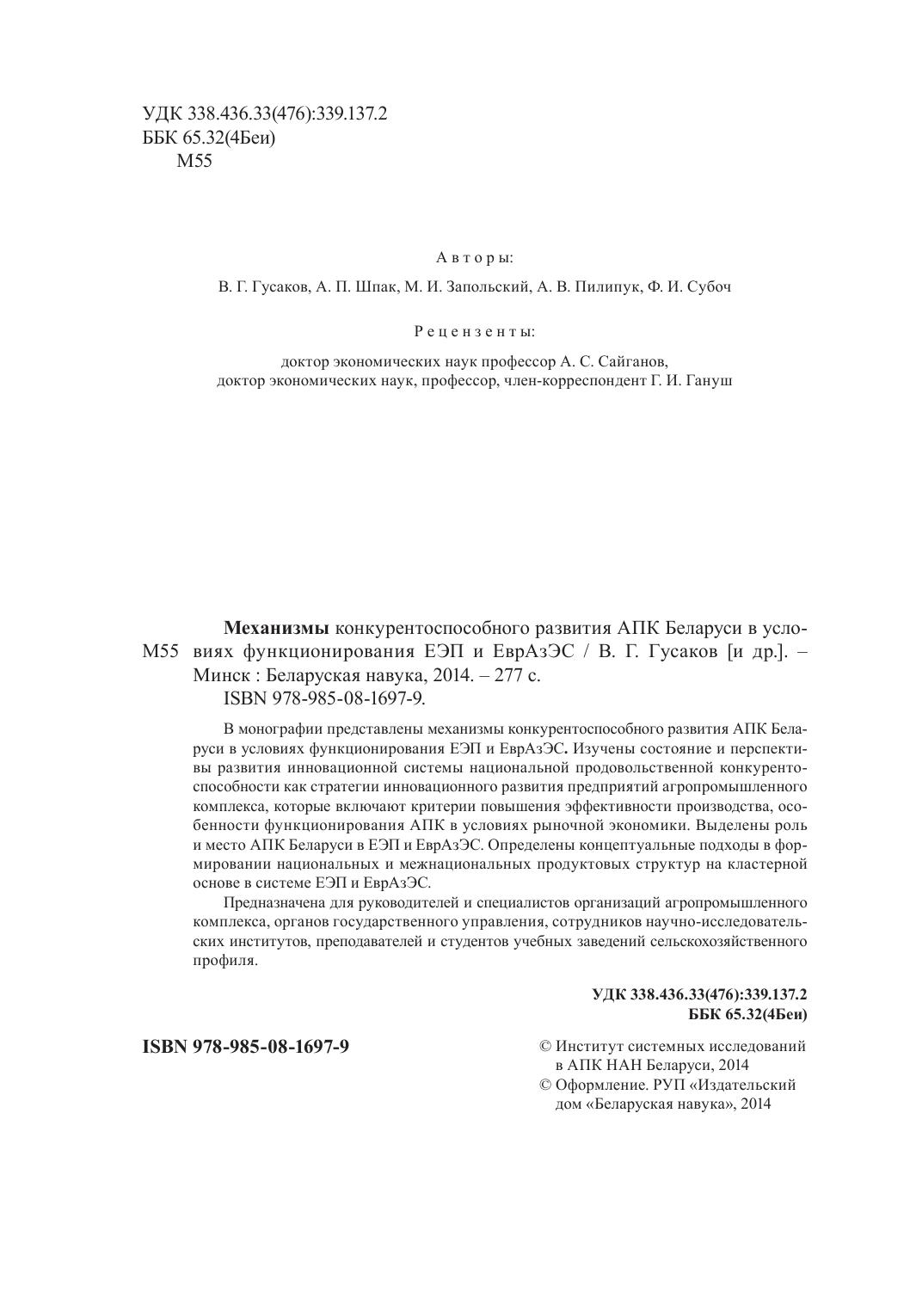 В монографии представлены механизмы конкурентоспособного развития АПК Беларуси в условиях функционирования ЕЭП и ЕврАзЭС. Изучены состояние и перспективы развития инновационной системы национальной продовольственной конкуренто- способности как стратегии инновационного развития предприятий агропромышленного комплекса, которые включают критерии повышения эффективности производства, особенности функционирования АПК в условиях рыночной экономики. Выделены роль и место АПК Беларуси в ЕЭП и ЕврАзЭС. Определены концептуальные подходы в формировании национальных и межнациональных продуктовых структур на кластерной основе в системе ЕЭП и ЕврАзЭС. Предназначена для руководителей и специалистов организаций агропромышленного комплекса, органов государственного управления, сотрудников научно-исследовательских институтов, преподавателей и студентов учебных заведений сельскохозяйственного профиля.