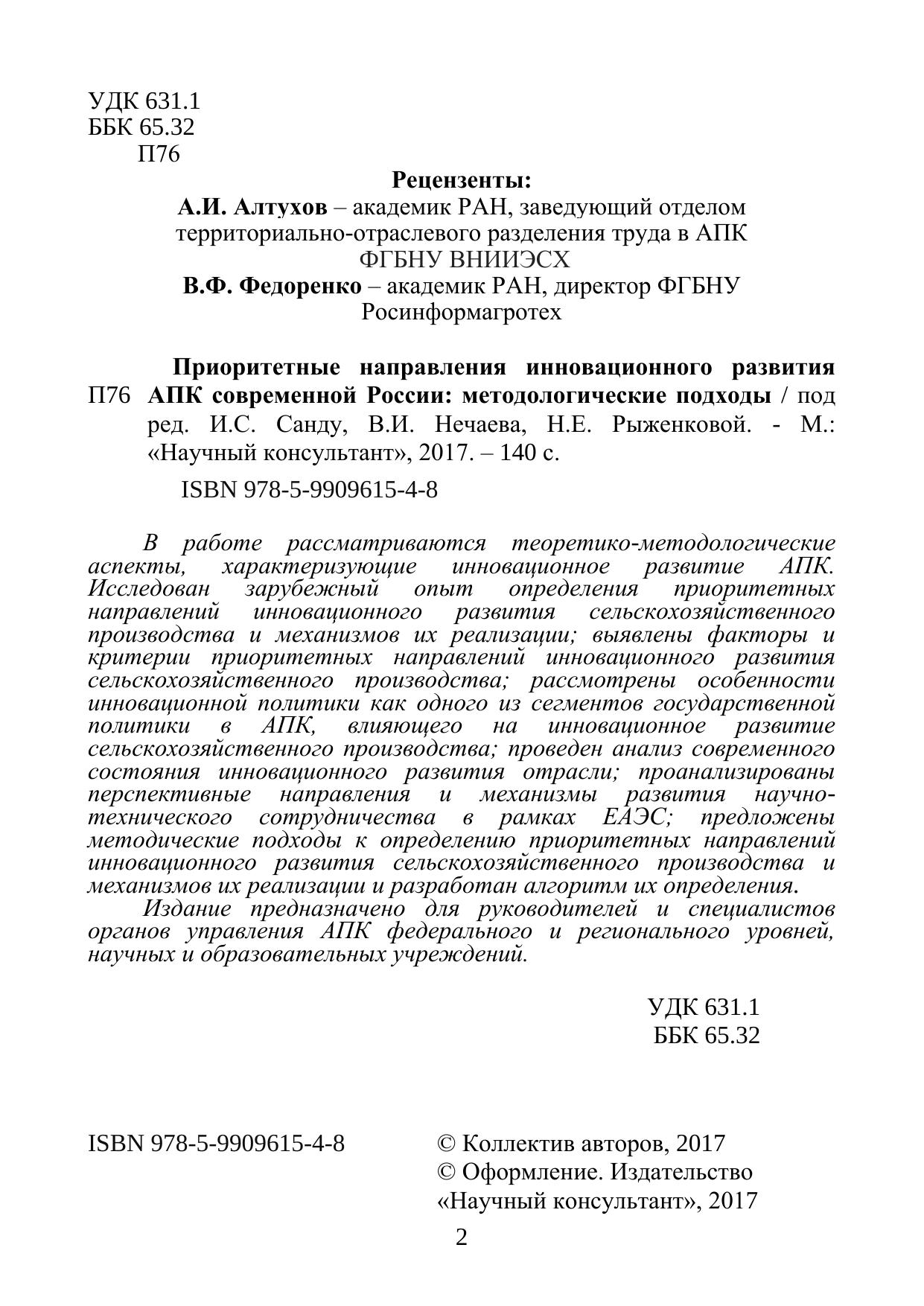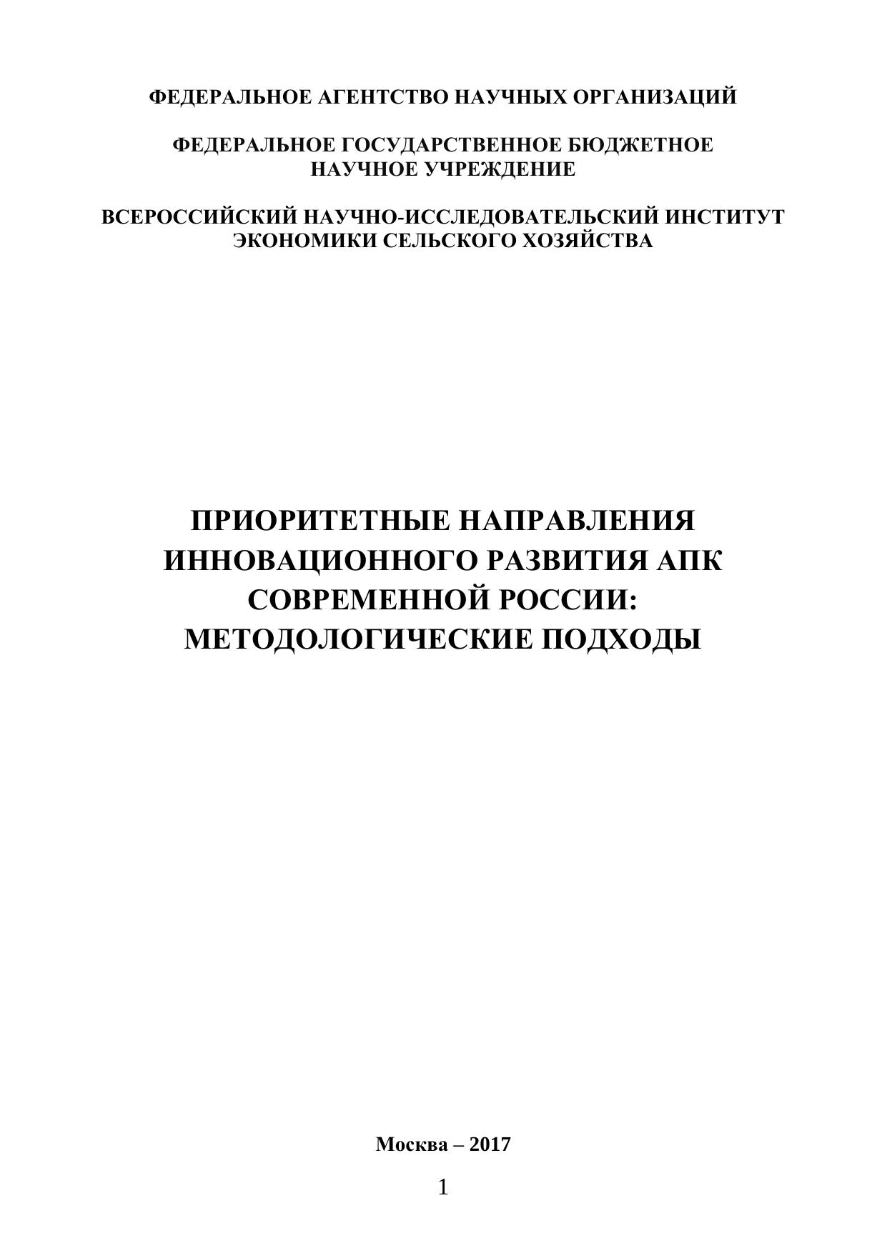Приоритетные направления инновационного развития АПК современной России: методологические подходы