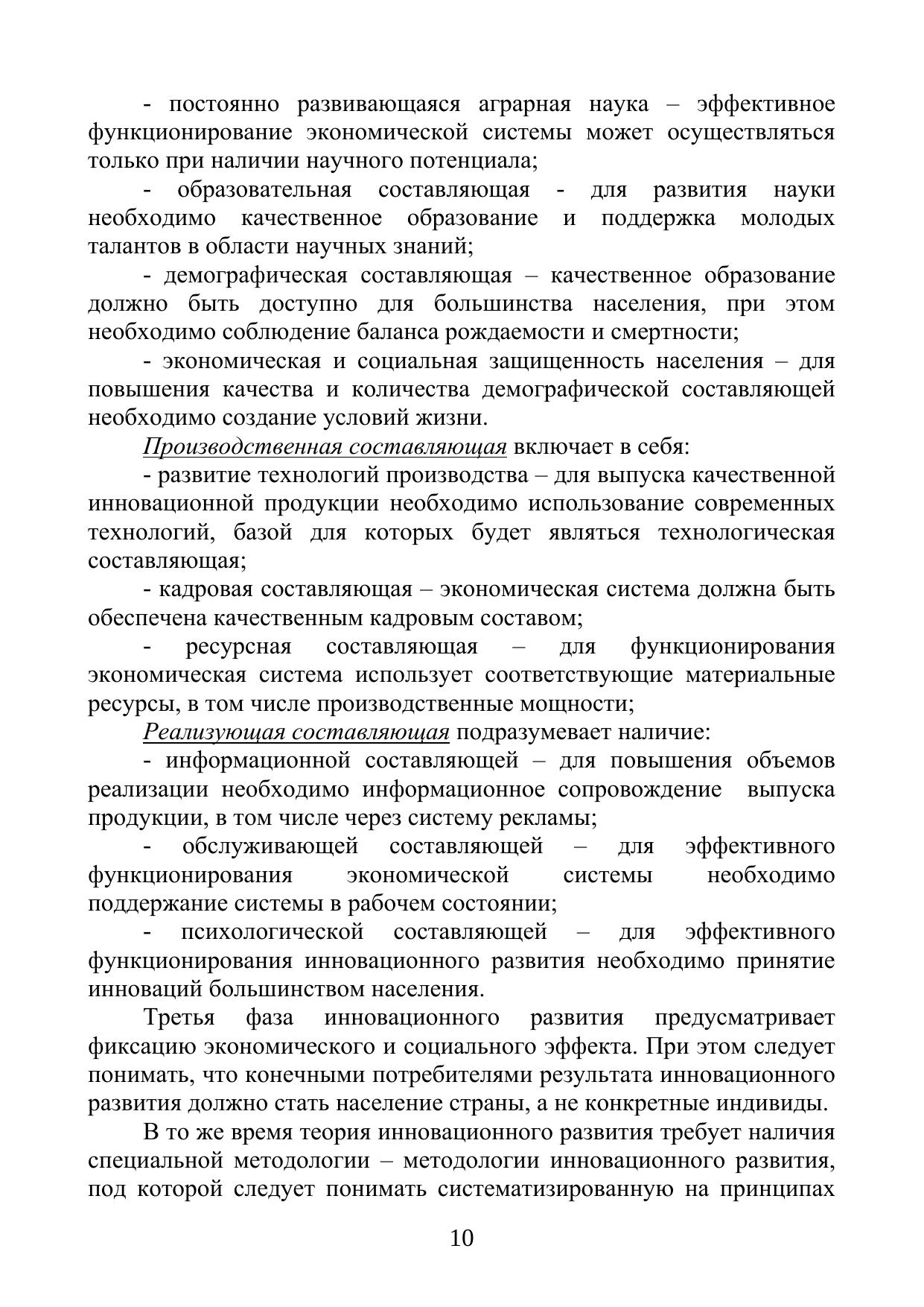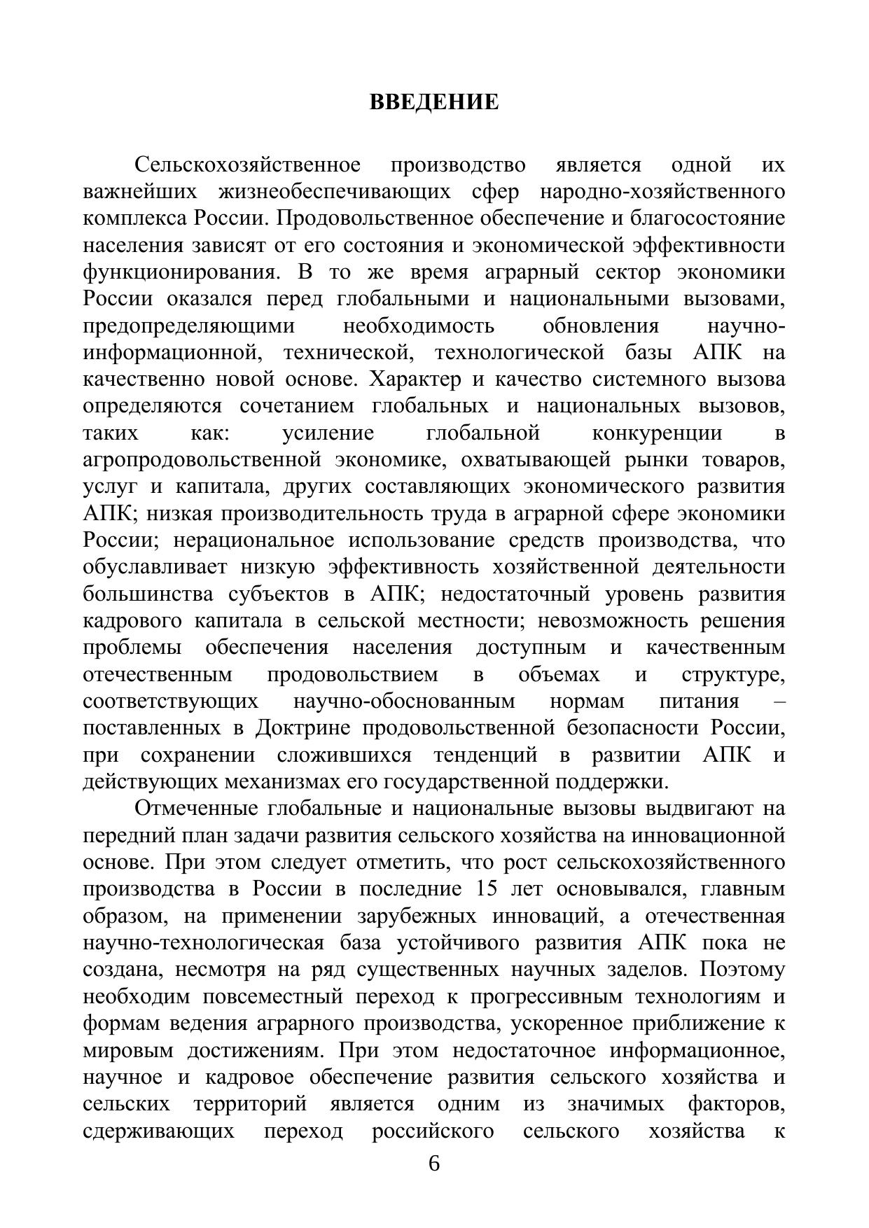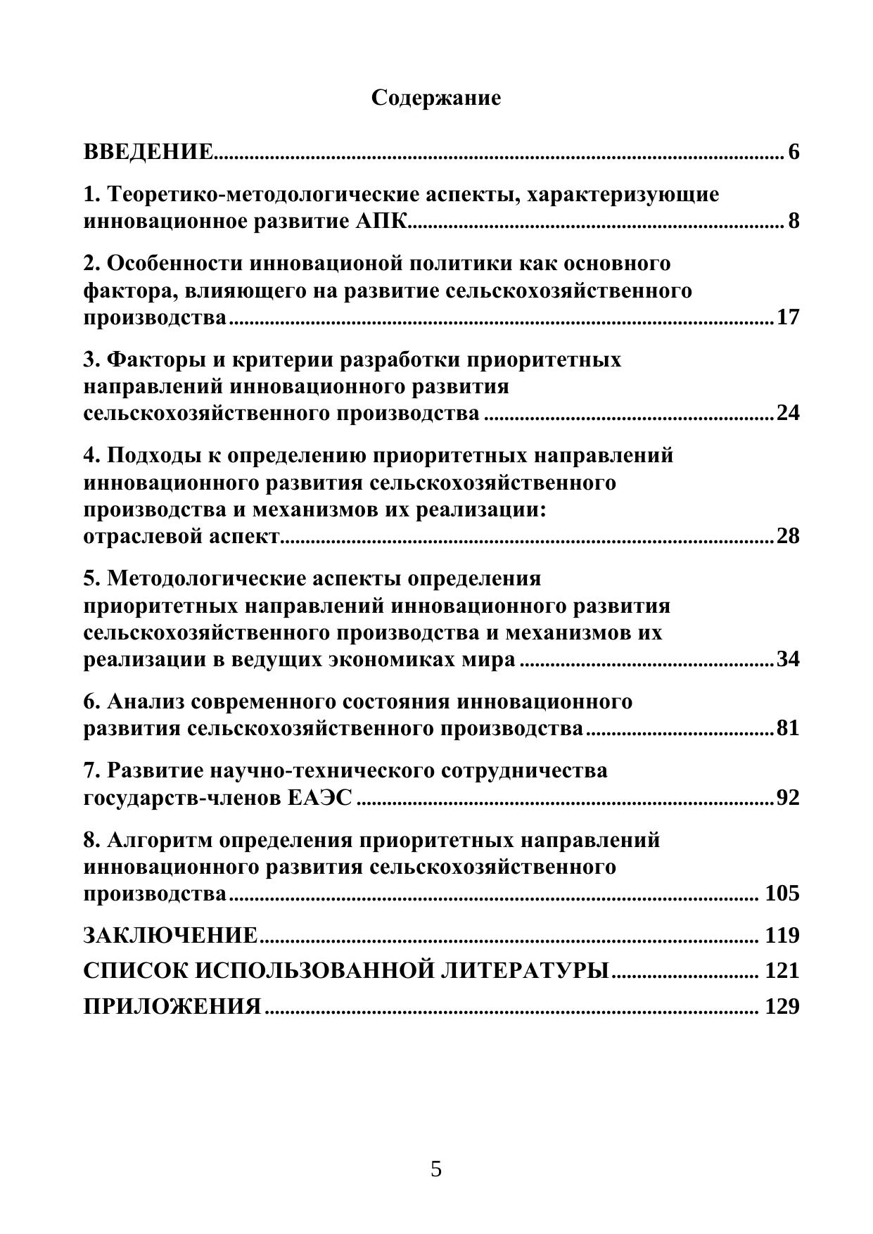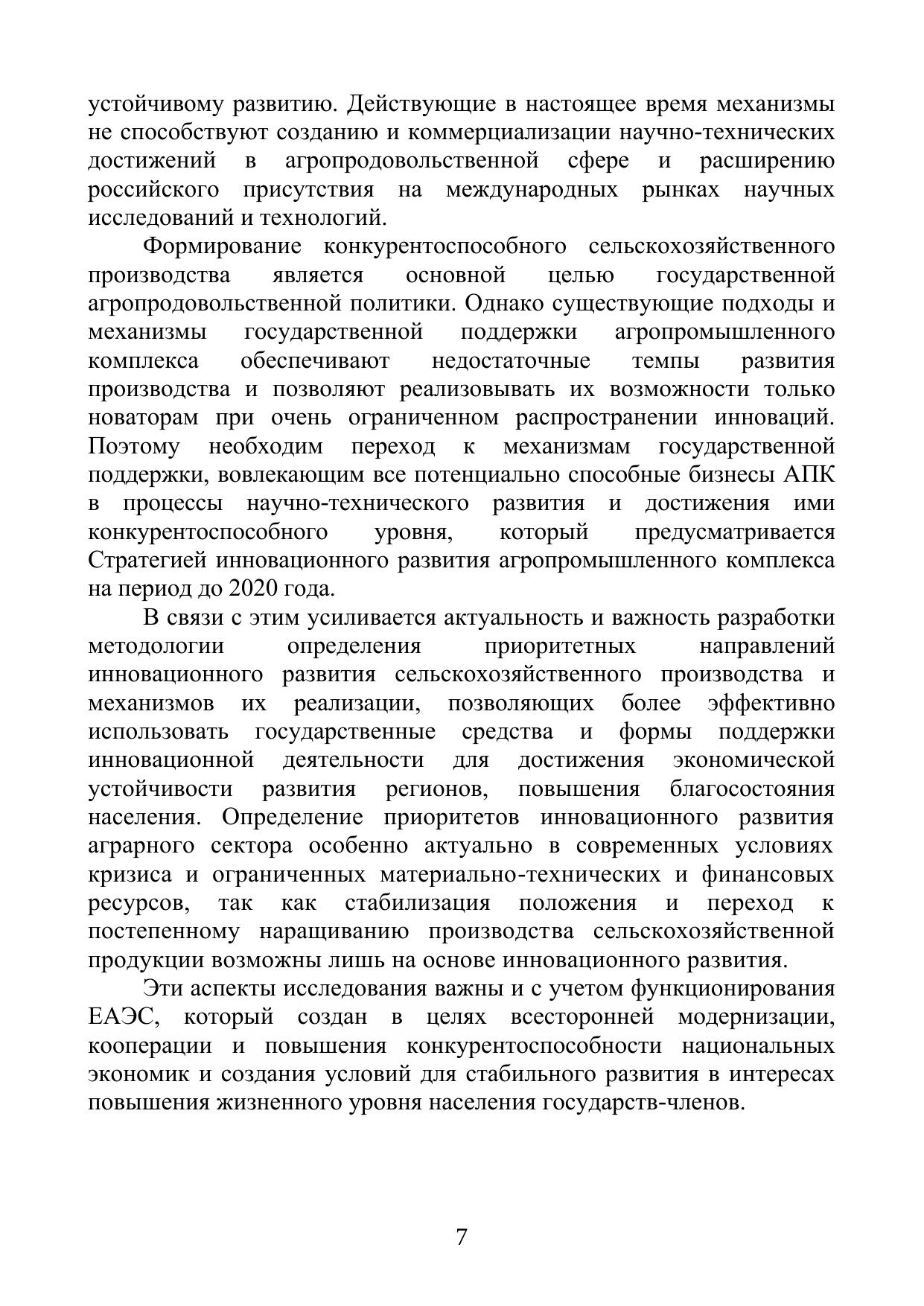 В работе рассматриваются теоретико-методологические аспекты, характеризующие инновационное развитие АПК. Исследован зарубежный опыт определения приоритетных направлений инновационного развития сельскохозяйственного производства и механизмов их реализации; выявлены факторы и критерии приоритетных направлений инновационного развития сельскохозяйственного производства; рассмотрены особенности инновационной политики как одного из сегментов государственной политики в АПК, влияющего на инновационное развитие сельскохозяйственного производства; проведен анализ современного состояния инновационного развития отрасли; проанализированы перспективные направления и механизмы развития научно-технического сотрудничества в рамках ЕАЭС; предложены методические подходы к определению приоритетных направлений инновационного развития сельскохозяйственного производства и механизмов их реализации и разработан алгоритм их определения.