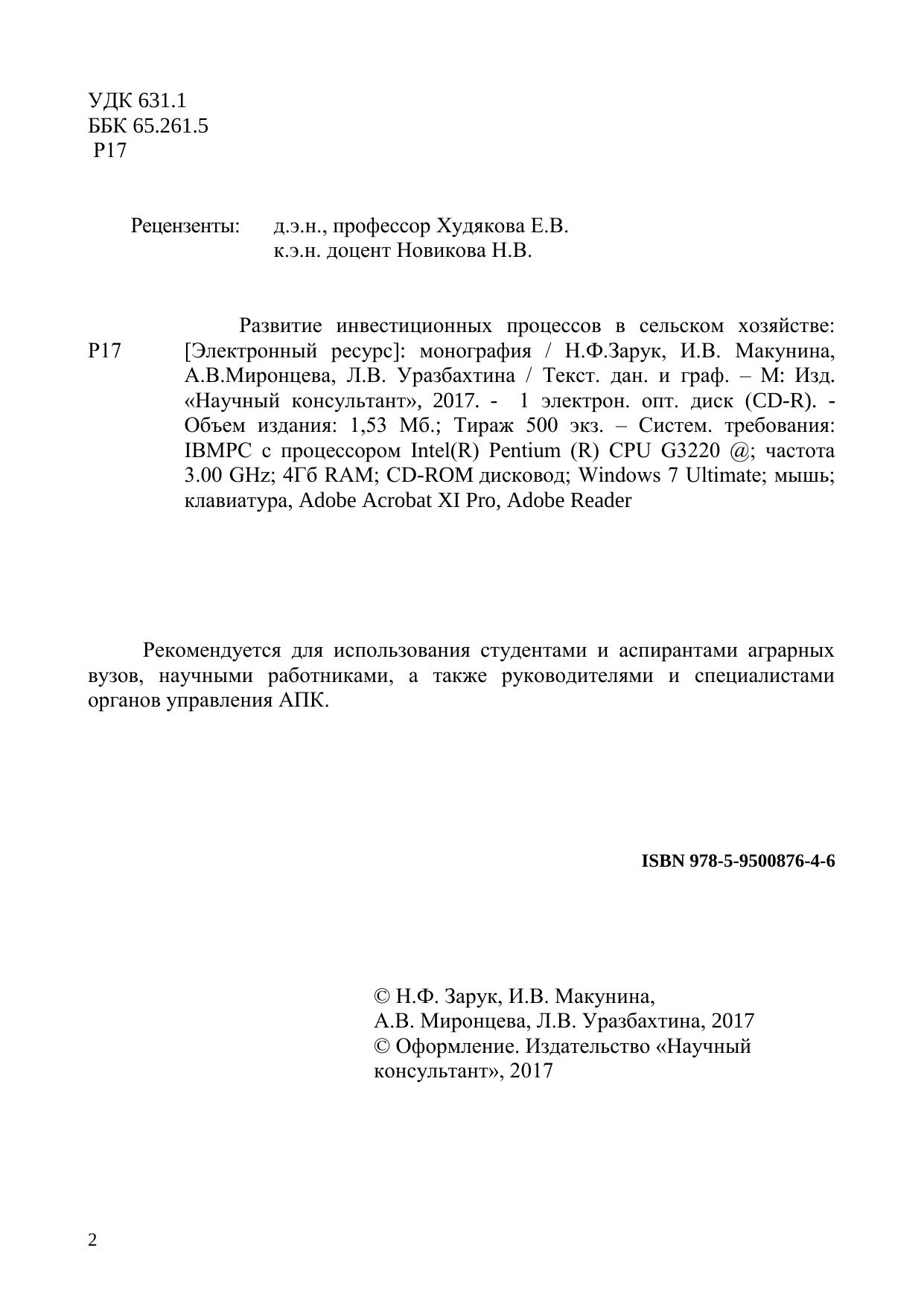 Рекомендуется для использования студентами и аспирантами аграрных вузов, научными работниками, а также руководителями и специалистами органов управления АПК.