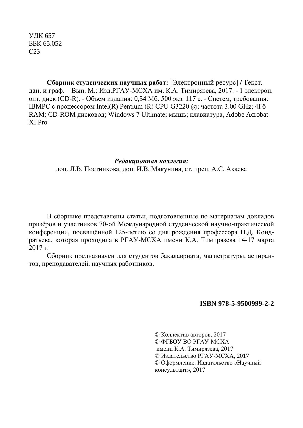 В сборнике представлены статьи, подготовленные по материалам докладов призёров и участников 70-ой Международной студенческой научно-практической конференции, посвящённой 125-летию со дня рождения профессора Н.Д. Кондратьева, которая проходила в РГАУ-МСХА имени К.А. Тимирязева 14-17 марта 2017 г. Сборник предназначен для студентов бакалавриата, магистратуры, аспирантов, преподавателей, научных работников.