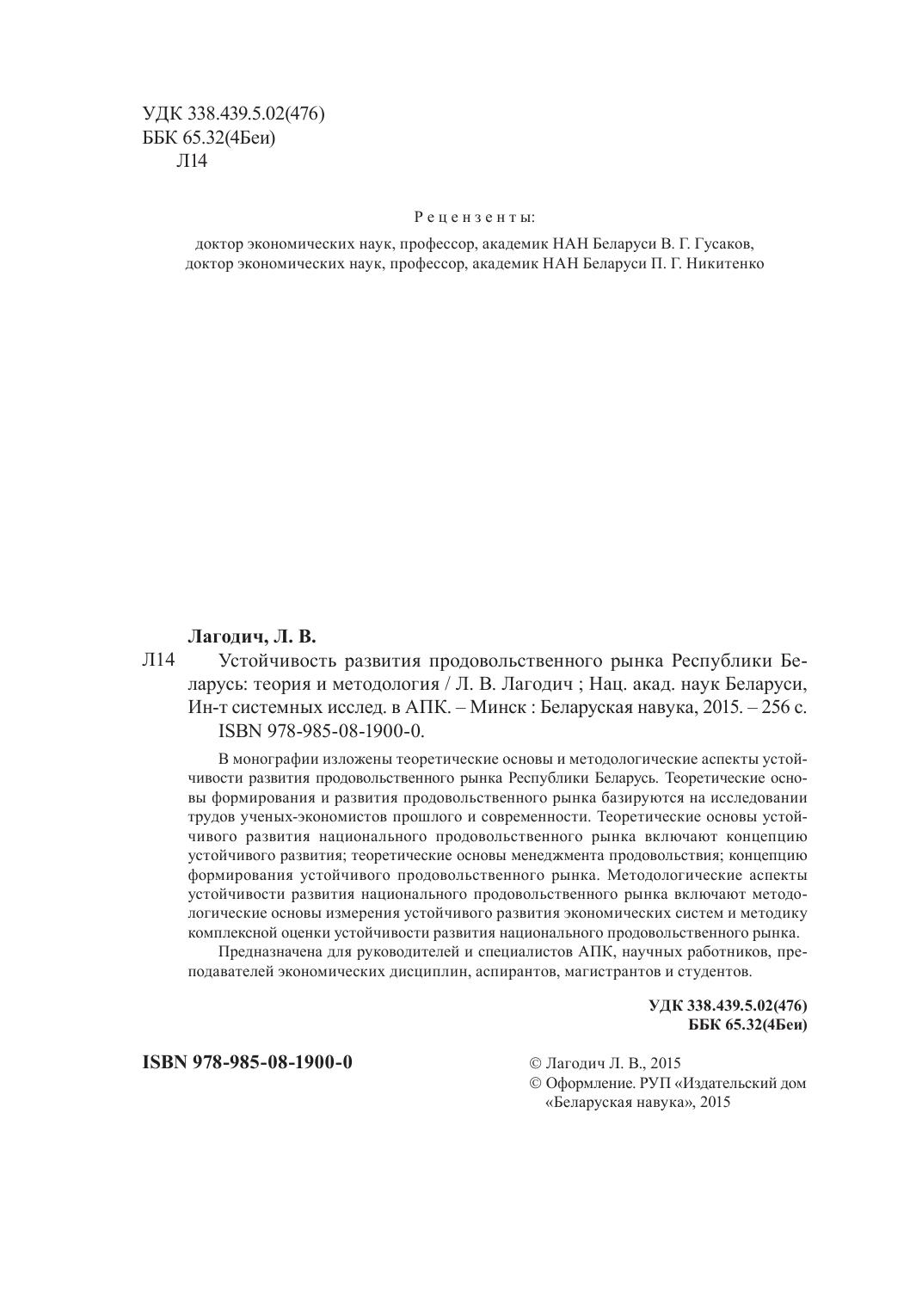 В монографии изложены теоретические основы и методологические аспекты устойчивости развития продовольственного рынка Республики Беларусь. Теоретические основы формирования и развития продовольственного рынка базируются на исследовании трудов ученых-экономистов прошлого и современности. Теоретические основы устойчивого развития национального продовольственного рынка включают концепцию устойчивого развития, теоретические основы менеджмента продовольствия, концепцию формирования устойчивого продовольственного рынка. Методологические аспекты устойчивости развития национального продовольственного рынка включают методологические основы измерения устойчивого развития экономических систем и методику комплексной оценки устойчивости развития национального продовольственного рынка. Предназначена для руководителей и специалистов АПК, научных работников, преподавателей экономических дисциплин, аспирантов, магистрантов и студентов.