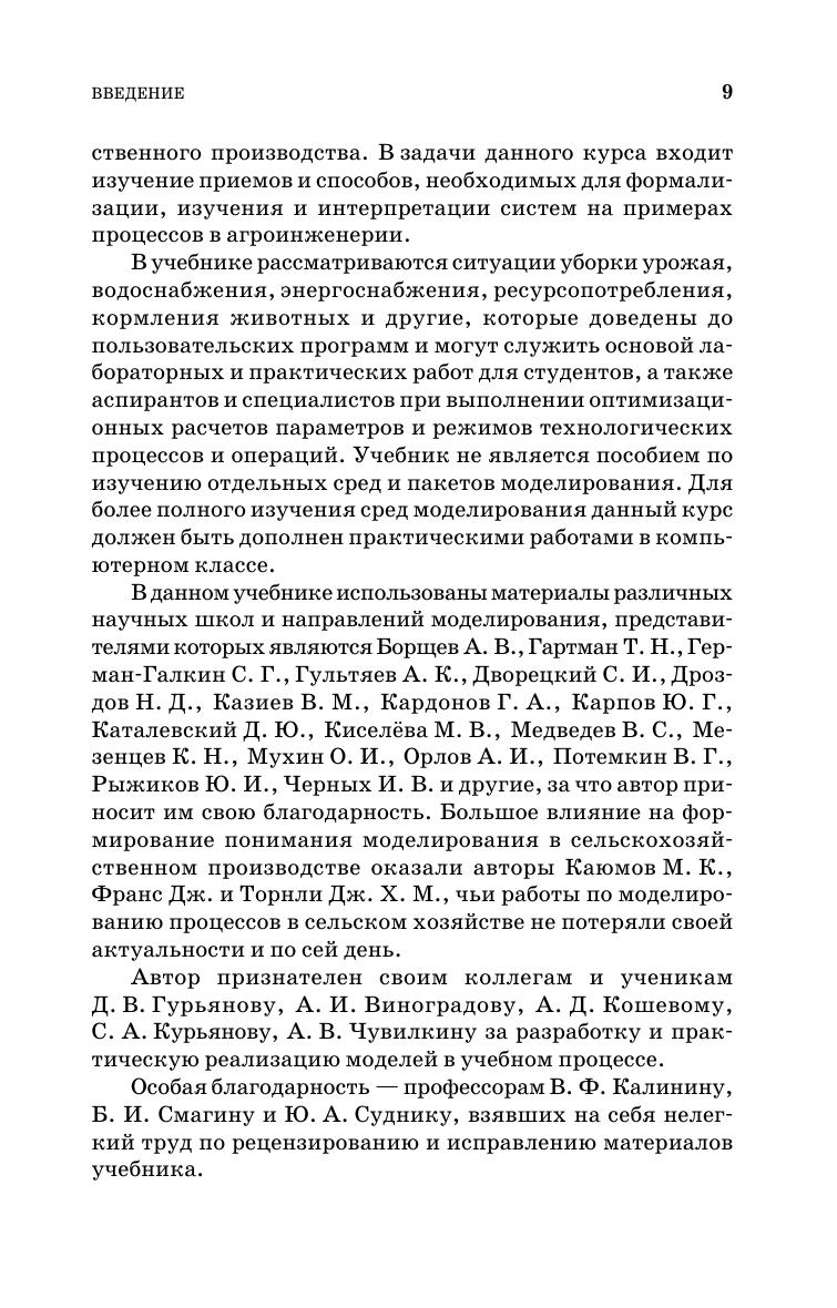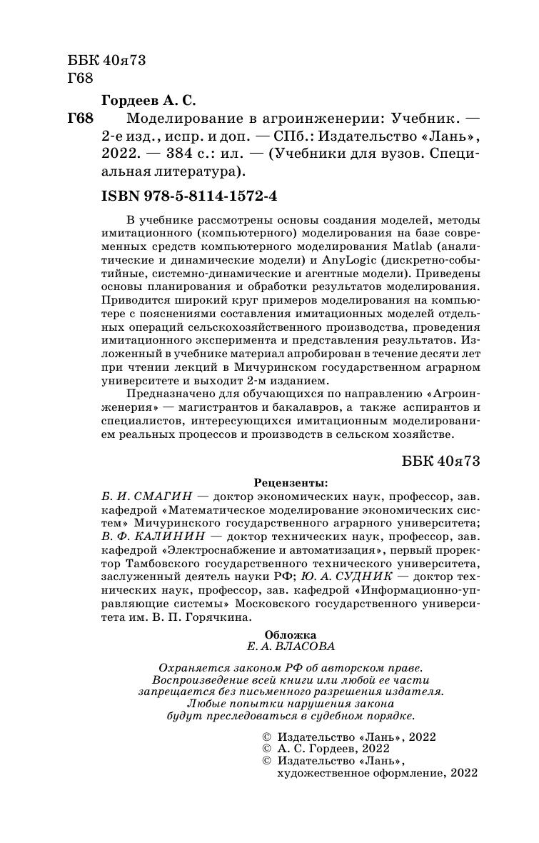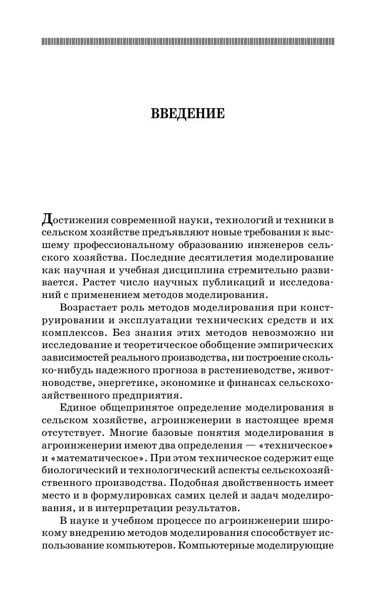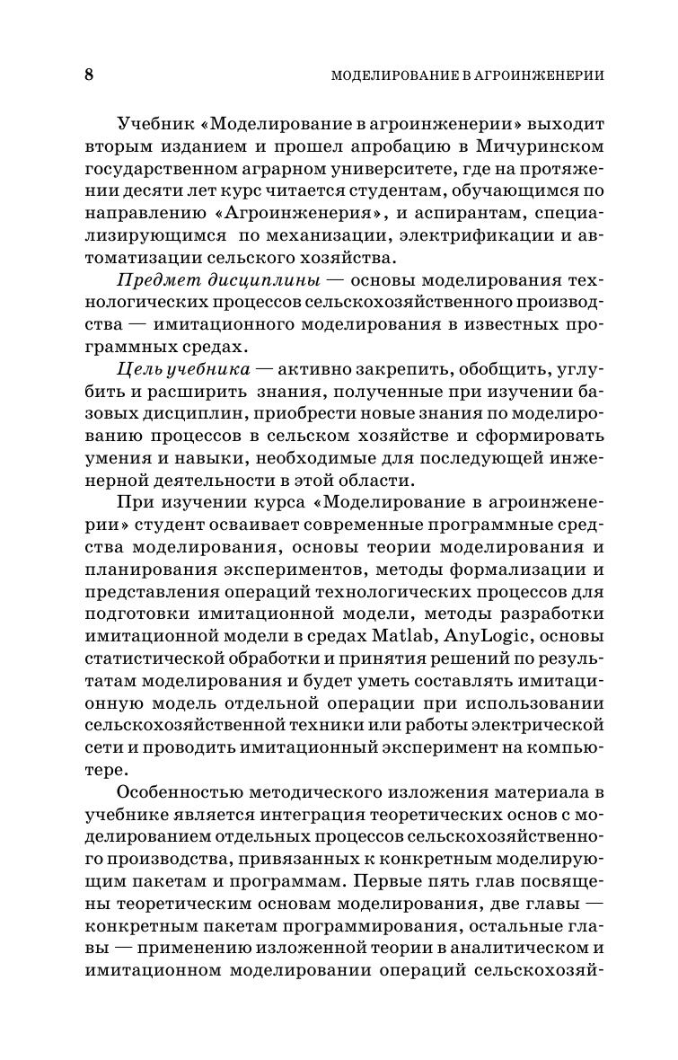 В учебнике рассмотрены основы создания моделей и моделирования, методы имитационного (компьютерного) моделирования на базе современных средств компьютерного моделирования Мatlab (аналитические и динамические модели) и АnyLogic (дискретно-событийные, системно-динамические и агентные модели). Приведены основы планирования и обработки результатов моделирования. Приводится широкий круг примеров моделирования на компьютере с пояснениями составления имитационных моделей отдельных операций сельскохозяйственного производства, проведения имитационного эксперимента и представления результатов. Предназначено для обучающихся по направлению «Агроинженерия» — бакалавров, магистрантов и аспирантов, а также специалистов, интересующихся имитационным моделированием реальных процессов и производств в сельском хозяйстве.