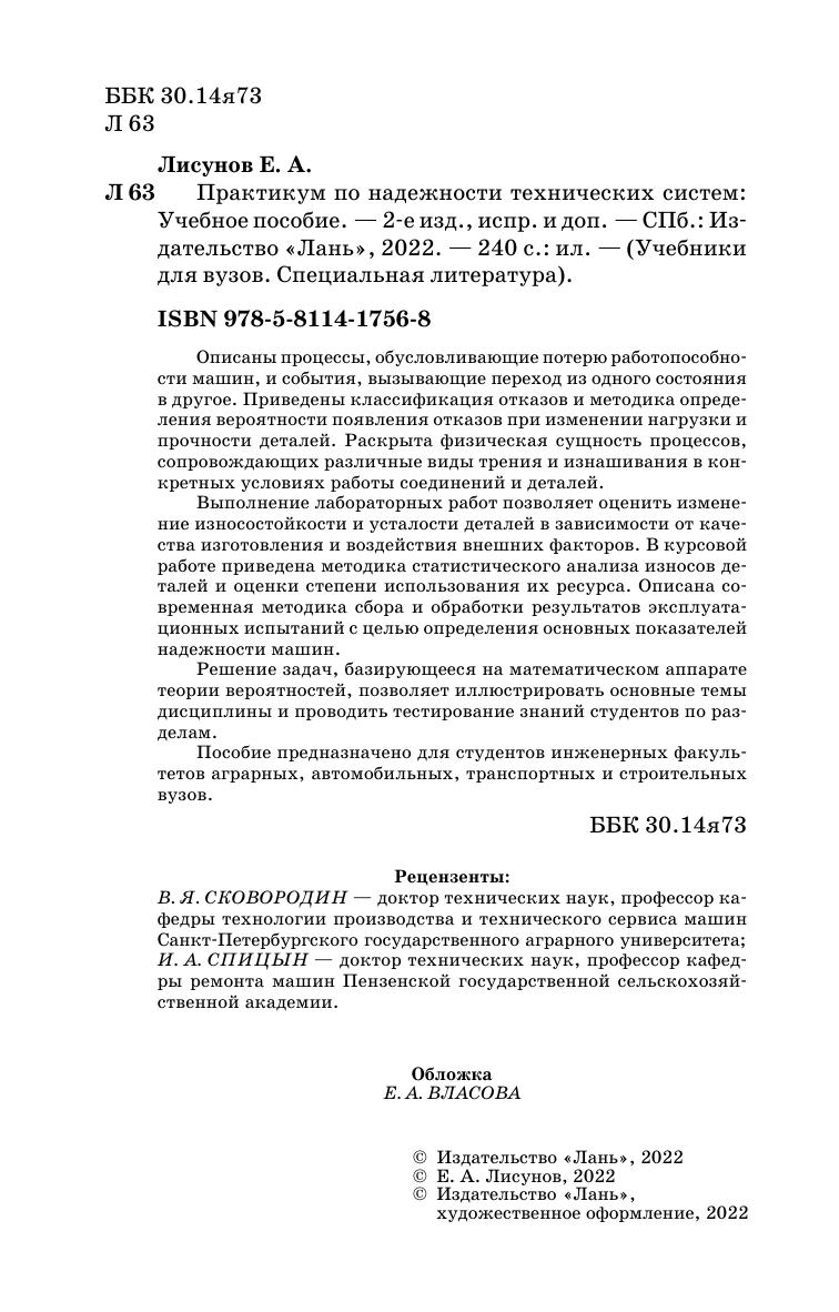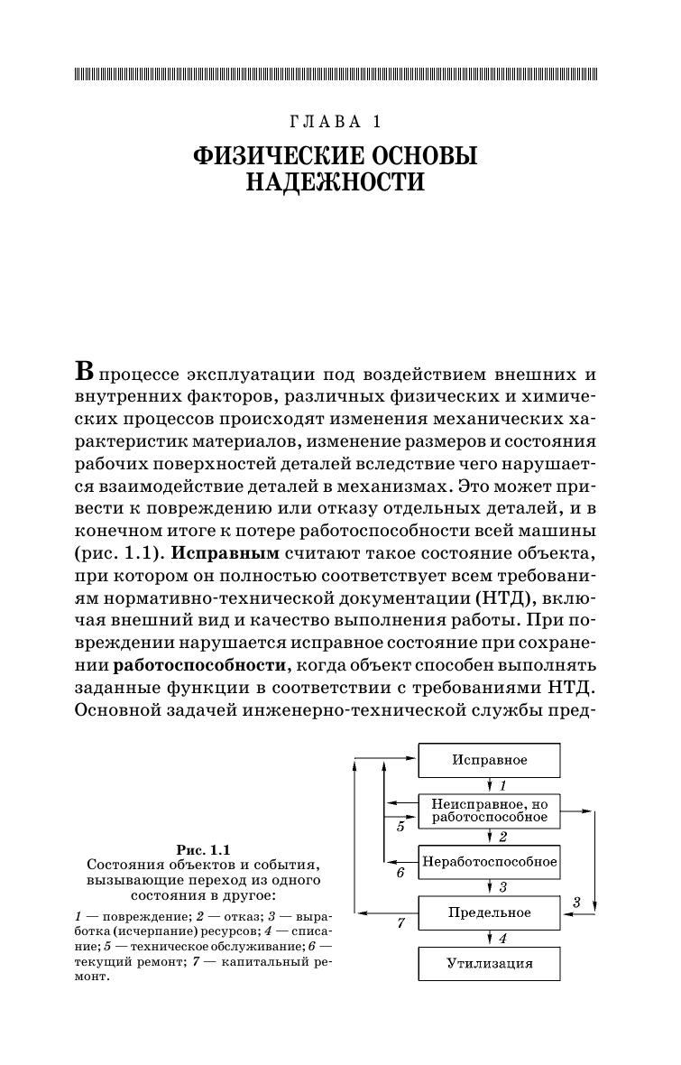 Описаны процессы, обусловливающие потерю работопособности машин, и события, вызывающие переход из одного состояния в другое. Приведены классификация отказов и методика определения вероятности появления отказов при изменении нагрузки и прочности деталей. Раскрыта физическая сущность процессов, сопровождающих различные виды трения и изнашивания в конкретных условиях работы соединений и деталей. Выполнение лабораторных работ позволяет оценить изменение износостойкости и усталости деталей в зависимости от качества изготовления и воздействия внешних факторов. В курсовой работе приведена методика статистического анализа износов деталей и оценки степени использования их ресурса. Описана современная методика сбора и обработки результатов эксплуатационных испытаний с целью определения основных показателей надежности машин. Решение задач, базирующееся на математическом аппарате теории вероятностей, позволяет иллюстрировать основные темы дисциплины и проводить тестирование знаний студентов по разделам. Пособие предназначено для студентов инженерных факультетов аграрных, автомобильных, транспортных и строительных вузов.