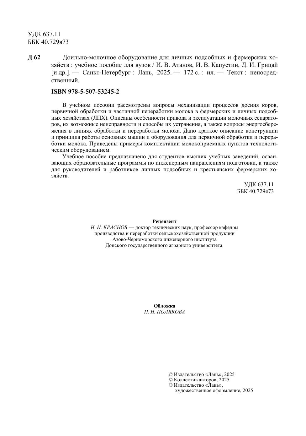 В учебном пособии рассмотрены вопросы механизации процессов доения коров, первичной обработки и частичной переработки молока в фермерских и личных подсобных хозяйствах (ЛПХ). Описаны особенности привода и эксплуатации молочных сепараторов, их возможные неисправности и способы их устранения, а также вопросы энергосбережения в линиях обработки и переработки молока. Дано краткое описание конструкции и принципа работы основных машин и оборудования для первичной обработки и переработки молока. Приведены примеры комплектации молокоприемных пунктов технологическим оборудованием. Учебное пособие предназначено для студентов высших учебных заведений, осваивающих образовательные программы по инженерным направлениям подготовки, а также для руководителей и работников личных подсобных и крестьянских фермерских хозяйств.