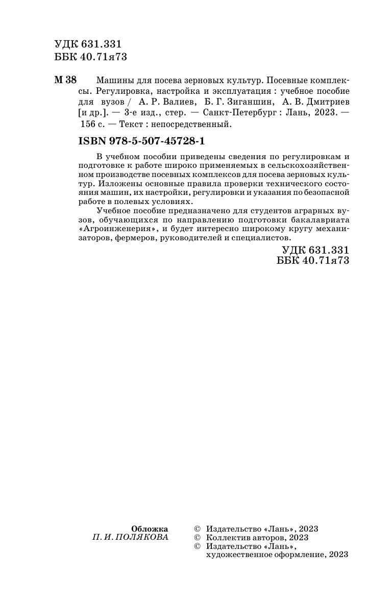 В учебном пособии приведены сведения по регулировкам и подготовке к работе широко применяемых в сельскохозяйственном производстве посевных комплексов для посева зерновых культур. Изложены основные правила проверки технического состояния машин, их настройки, регулировки и указания по безопасной работе в полевых условиях. Учебное пособие предназначено для студентов аграрных вузов, обучающихся по направлению подготовки бакалавриата «Агроинженерия», и будет интересно широкому кругу механизаторов, фермеров, руководителей и специалистов.
