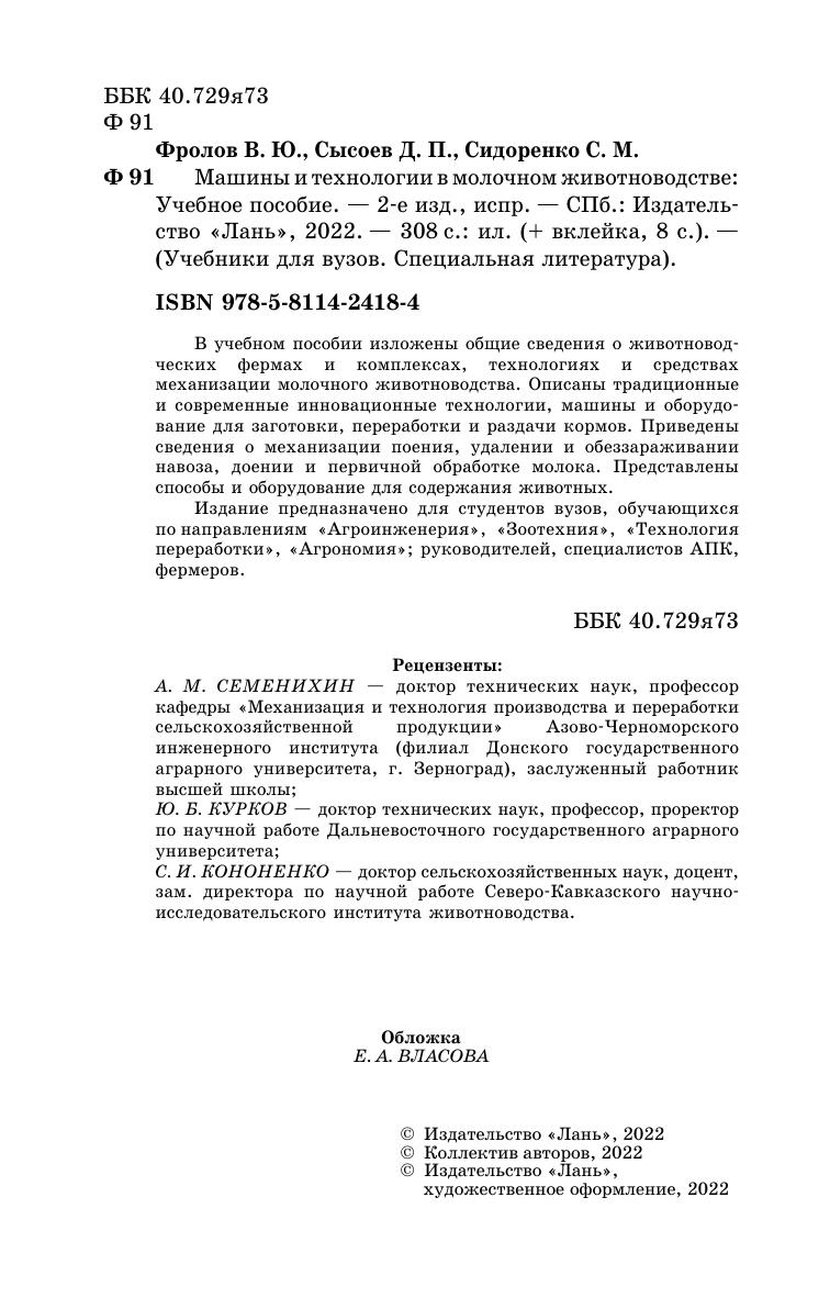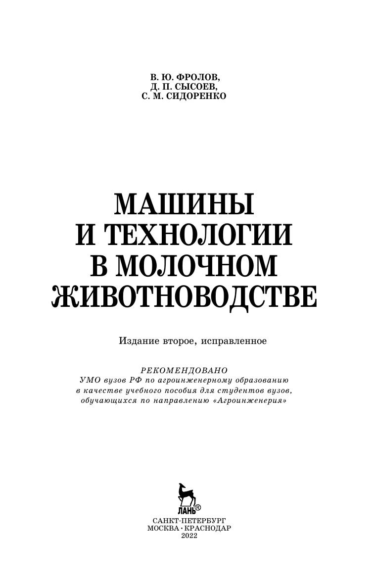 В учебном пособии изложены общие сведения о животноводческих фермах и комплексах, технологиях и средствах механиза-ции молочного животноводства. Описаны традиционные и совре-менные инновационные технологии, машины и оборудование для заготовки, переработки и раздачи кормов. Приведены сведения о механизации поения, удалении и обеззараживании навоза, доении и первичной обработке молока. Представлены способы и оборудование для содержания животных. Издание предназначено для студентов вузов, обучающихся по направлению «Агроинженерия», по специальностям: «Зоотехния», «Технология переработки», «Агрономия», руководителей, специалистов АПК, фермеров.