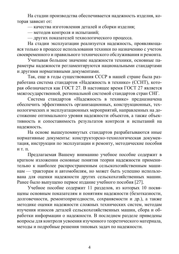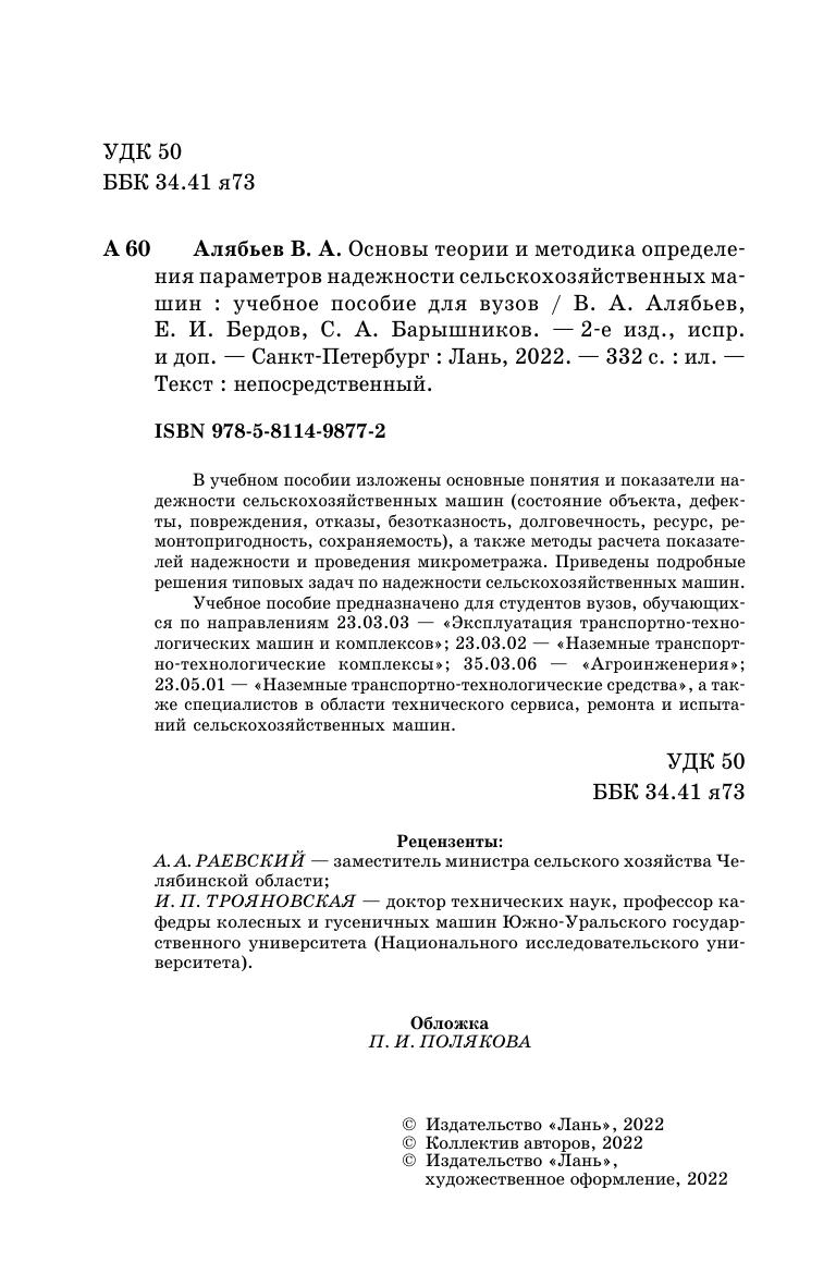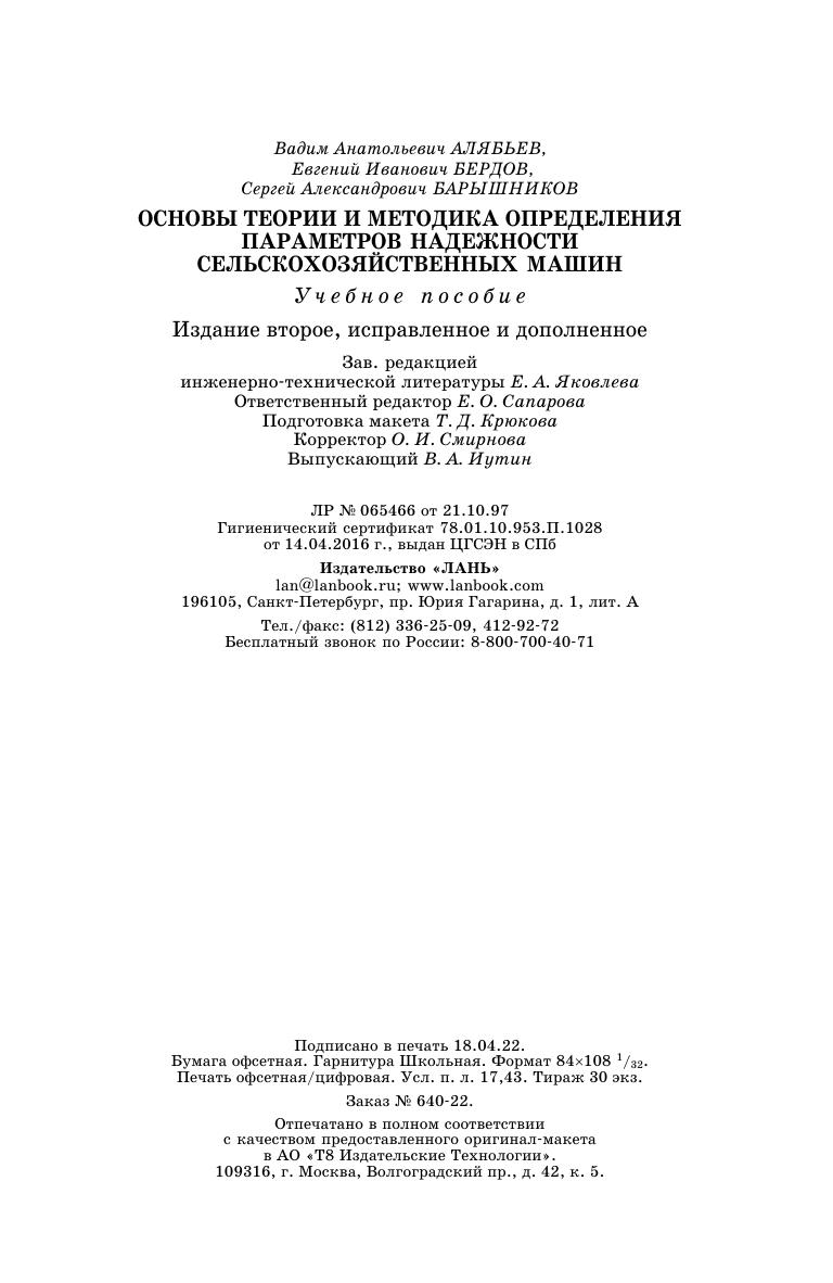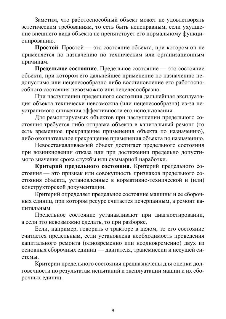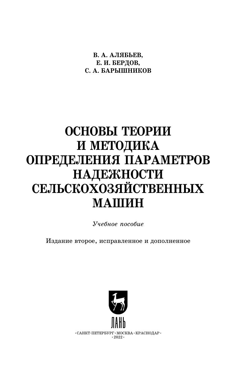В учебном пособии изложены основные понятия и показатели надежности сельскохозяйственных машин (состояние объекта, дефекты, повреждения, отказы, безотказность, долговечность, ресурс, ремонтопригодность, сохраняемость), а также методы расчета показателей надежности и проведения микрометража. Приведены подробные решения типовых задач по надежности сельскохозяйственных машин. Учебное пособие предназначено для студентов вузов, обучающихся по направлениям 23.03.03 — «Эксплуатация транспортно-технологических машин и комплексов», 23.03.02 — «Наземные транспортно-технологические комплексы», 35.03.06 — «Агроинженерия», 23.05.01 — «Наземные транспортно-технологические средства», а также специалистов в области технического сервиса, ремонта и испытаний сельскохозяйственных машин.