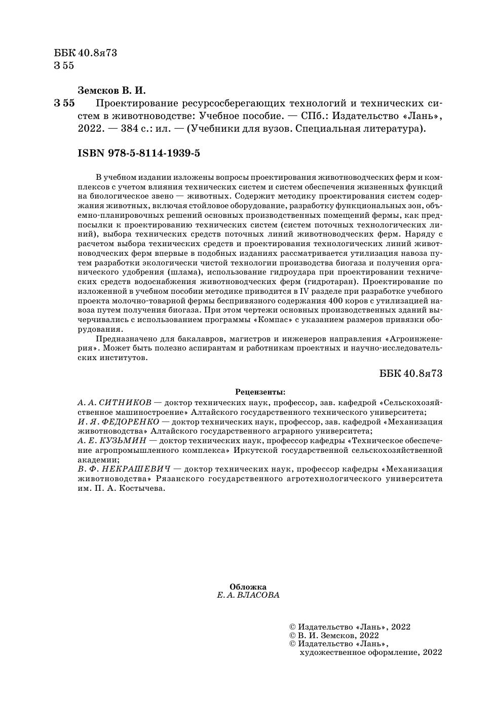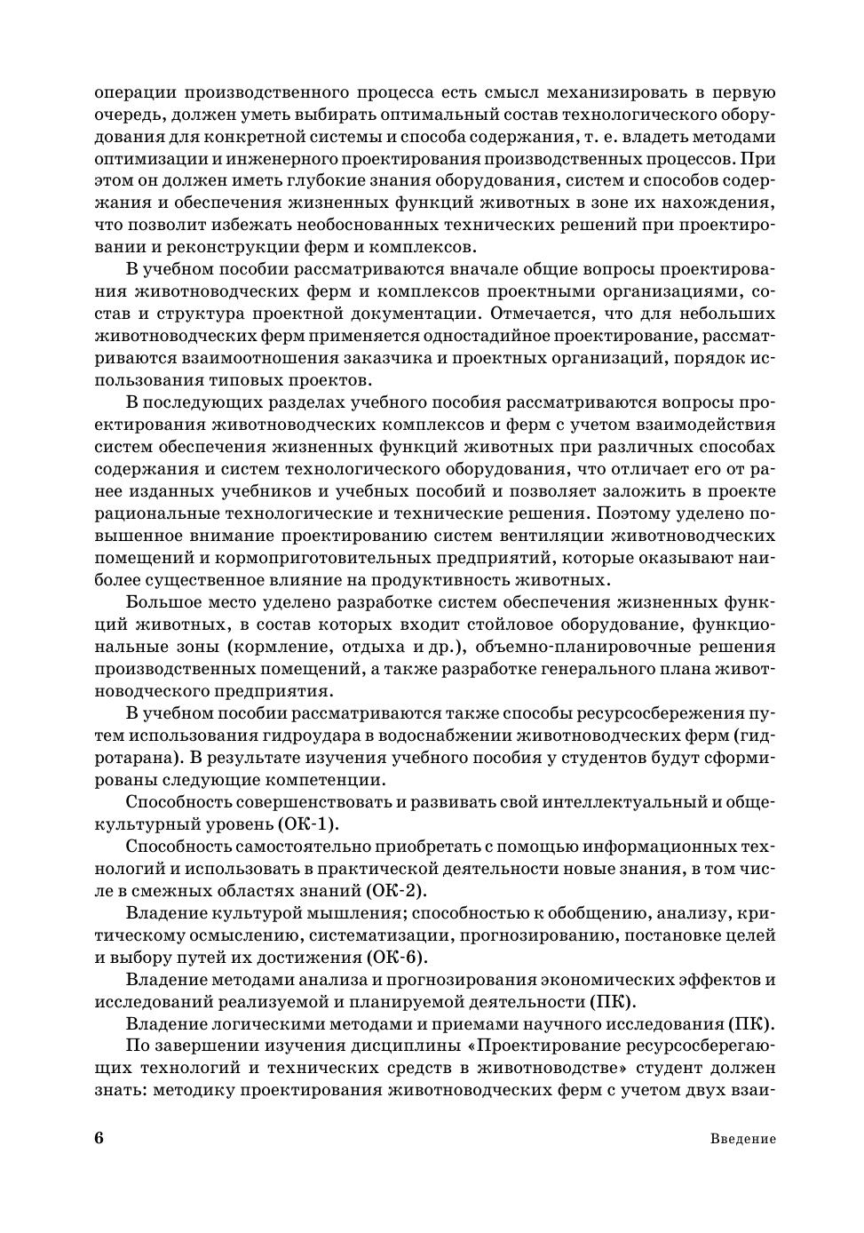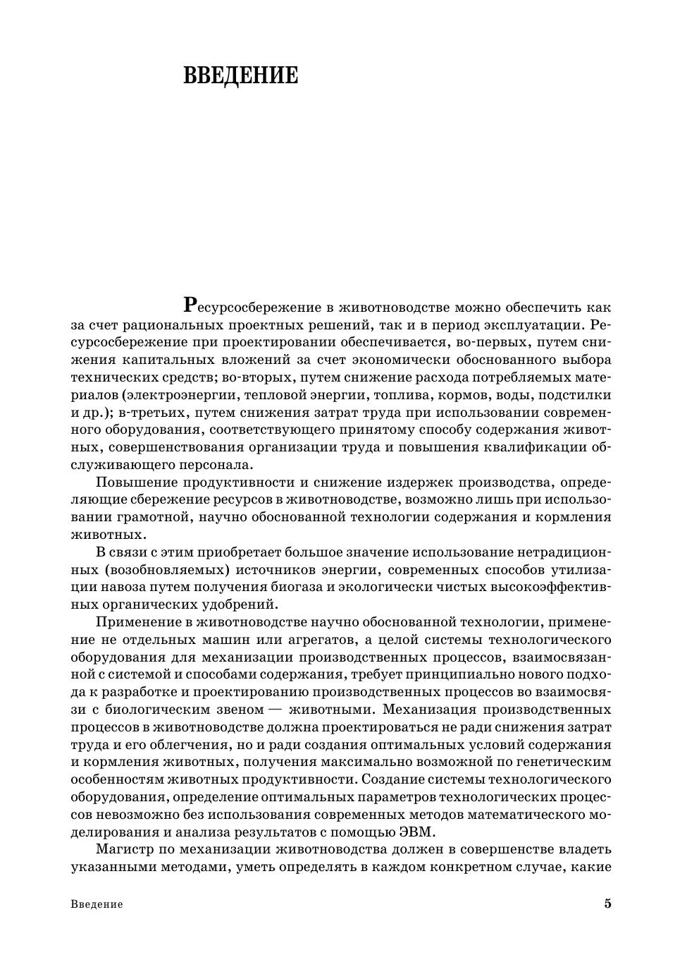 В учебном издании изложены вопросы проектирования животноводческих ферм и комплексов с учетом влияния технических систем и систем обеспечения жизненных функций на биологическое звено – животных. Содержит методику проектирования систем содержания животных, включая стойловое оборудование, разработку функциональных зон, объемно-планировочных решений основных производственных помещений фермы, как предпосылки к проектированию технических систем (систем поточных технологических линий), выбора технических средств поточных линий животноводческих ферм. Наряду с расчетом выбора технических средств и проектирования технологических линий животноводческих ферм впервые в подобных изданиях рассматривается утилизация навоза путем разработки экологически чистой технологии производства биогаза и получения органического удобрения (шлама), использование гидроудара при проектировании технических средств водоснабжения животноводческих ферм (гидротаран). Проектирование по изложенной в учебном пособии методике приводится в IV-м разделе при разраюотке учебного проекта молочно-товарной ферлы беспривязного содержания 400 коров с утилизацией навоза путем получения биогаза. При этом чертежи основных производсвенных зданий вычерчивались с использованием программы «Компас» с указанием размеров привязки оборудования. Предназначено для бакалавров, магистров и инженеров направления «Агроинженерия». Может быть полезным аспирантам и работникам проектных и научно-исследовательских институтов.
