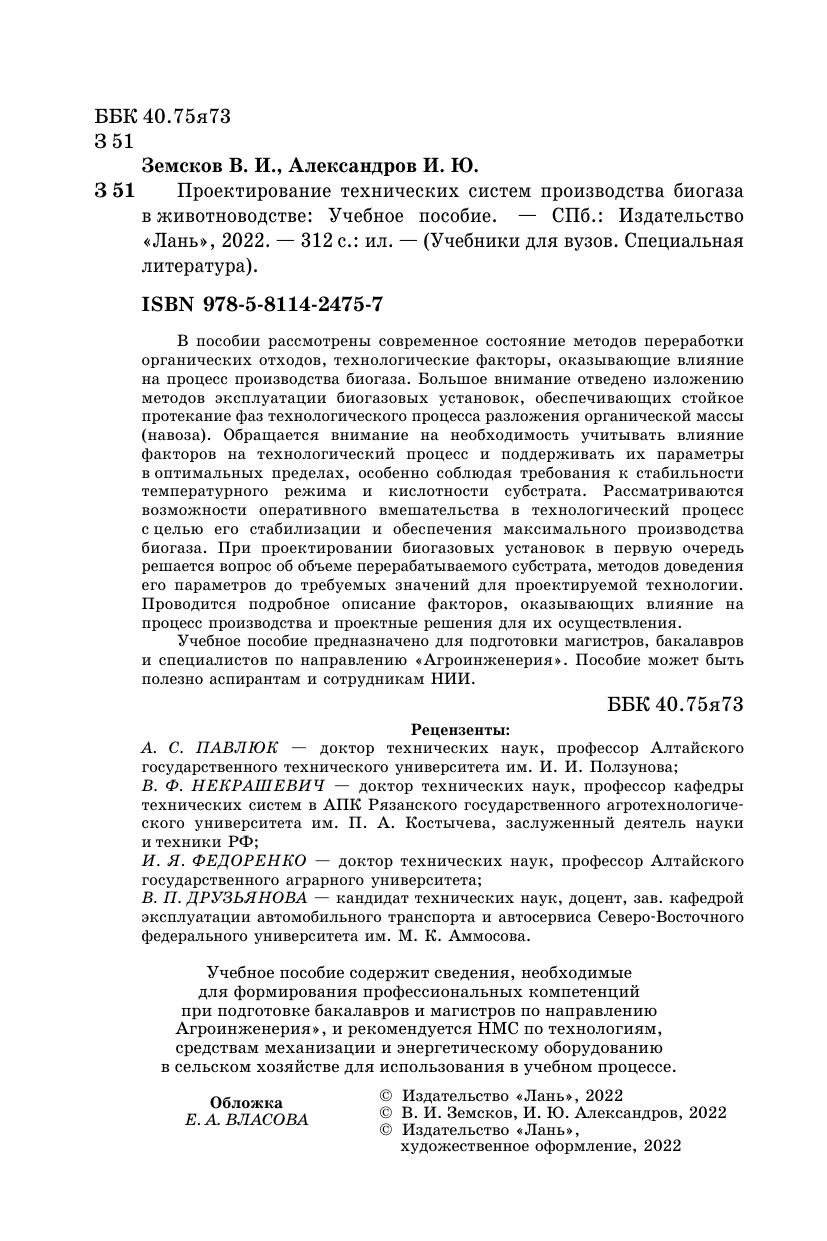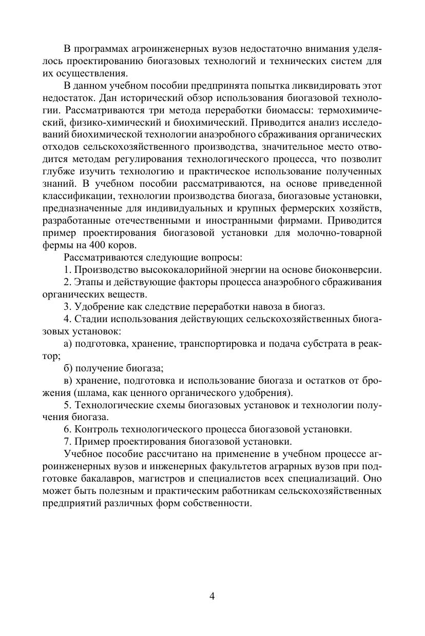 В пособии рассмотрены современное состояние методов переработки органических отходов, технологические факторы, оказывающие влияние на процесс производства биогаза. Большое внимание отведено изложению методов эксплуатации биогазовых установок, обеспечивающих стойкое протекание фаз технологического процесса разложения органической массы (навоза). Обращается внимание на необходимость учитывать влияние факторов на технологический процесс и поддерживать их параметры в оптимальных пределах, особенно соблюдая требования к стабильности температурного режима и кислотности субстрата. Рассматриваются возможности оперативного вмешательства в технологический процесс с целью его стабилизации и обеспечения максимального производства биогаза. При проектировании биогазовых установок в первую очередь решается вопрос об объеме перерабатываемого субстрата, методов доведения его параметров до требуемых значений для проектируемой технологии. Проводится подробное описание факторов, оказывающих влияние на процесс производства и проектные решения для их осуществления. Учебное пособие предназначено для подготовки магистров, бакалавров и специалистов по направлению «Агроинженерия». Пособие может быть полезно аспирантам и сотрудникам НИИ.