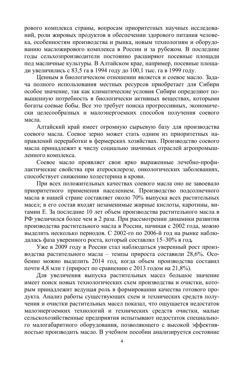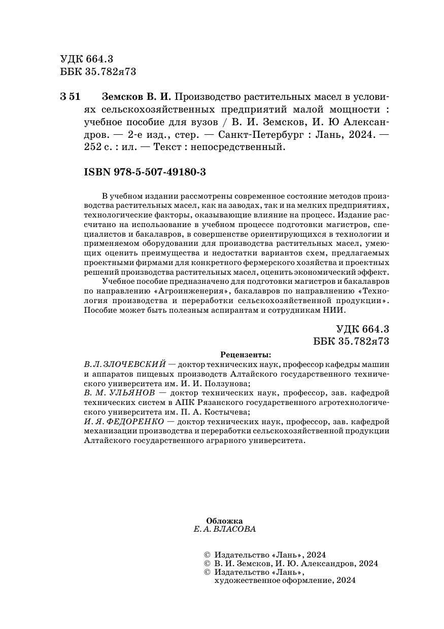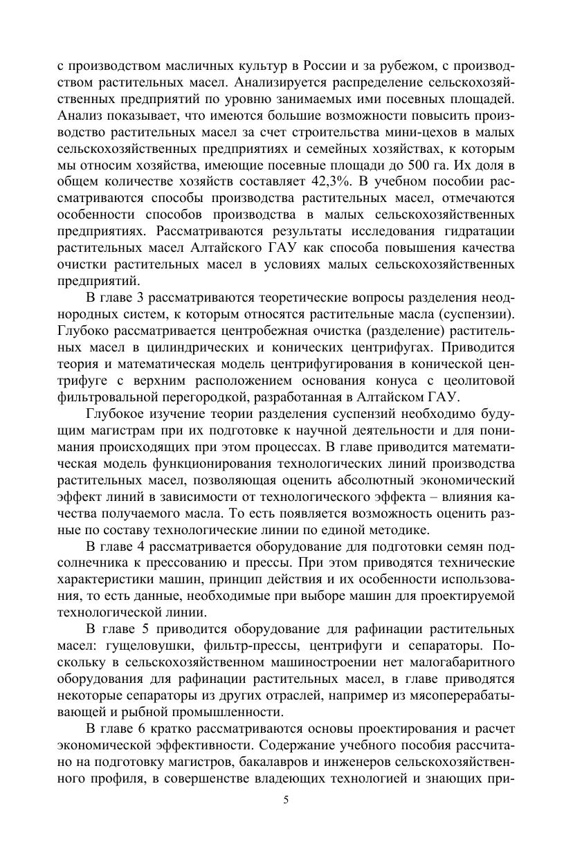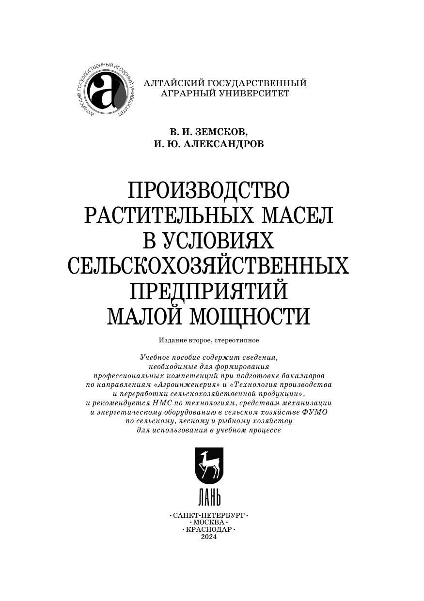 В учебном издании рассмотрены современное состояние методов производства растительных масел, как на заводах, так и на мелких предприятиях, технологические факторы, оказывающие влияние на процесс. Издание рассчитано на использование в учебном процессе подготовки магистров, специалистов и бакалавров, в совершенстве ориентирующихся в технологии и применяемом оборудовании для производства растительных масел, умеющих оценить преимущества и недостатки вариантов схем, предлагаемых проектными фирмами для конкретного фермерского хозяйства и проектных решений производства растительных масел, оценить экономический эффект. Учебное пособие предназначено для подготовки магистров и бакалавров по направлению «Агроинженерия», бакалавров по направлнению «Технология производства и переработки сельскохозяйственной продукции». Пособие может быть полезным аспирантам и сотрудникам НИИ.