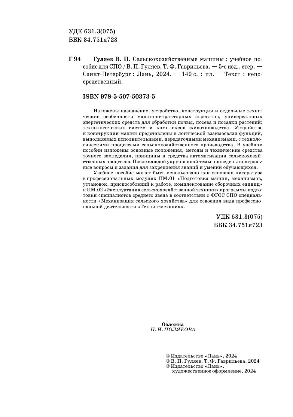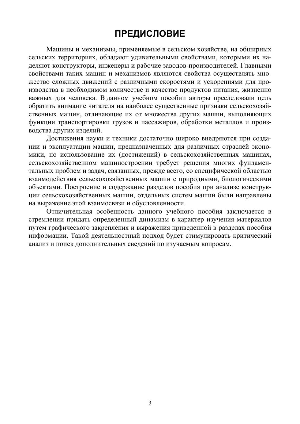 Изложены назначение, устройство, конструкции и отдельные технические особенности машинно-тракторных агрегатов, универсальных энергетических средств для обработки почвы, посева и посадки растений, технологических систем и комплексов животноводства. Устройство и конструкции машин представлены в логической взаимосвязи функций, выполняемых исполнительными, передаточными механизмами, с технологическими процессами сельскохозяйственного производства. В учебном пособии изложены основные положения, методы и технические средства точного земледелия, принципы и средства автоматизации сельскохозяйственных процессов. После каждой укрупненной темы приведены контрольные вопросы и задания для закрепления знаний и умений обучающихся. Соответствует современным требованиям Федерального государственного образовательного стандарта среднего профессионального образования и профессиональным квалификационным требованиям. Учебное пособие может быть использовано как основная литература в профессиональных модулях ПМ.01 «Подготовка машин, механизмов, установок, приспособлений к работе, комплектование сборочных единиц» и ПМ.02 «Эксплуатация сельскохозяйственной техники» программы подготовки специалистов среднего звена в соответствии с ФГОС СПО специальности «Механизация сельского хозяйства» для освоения вида профессиональной деятельности «Техник-механик».