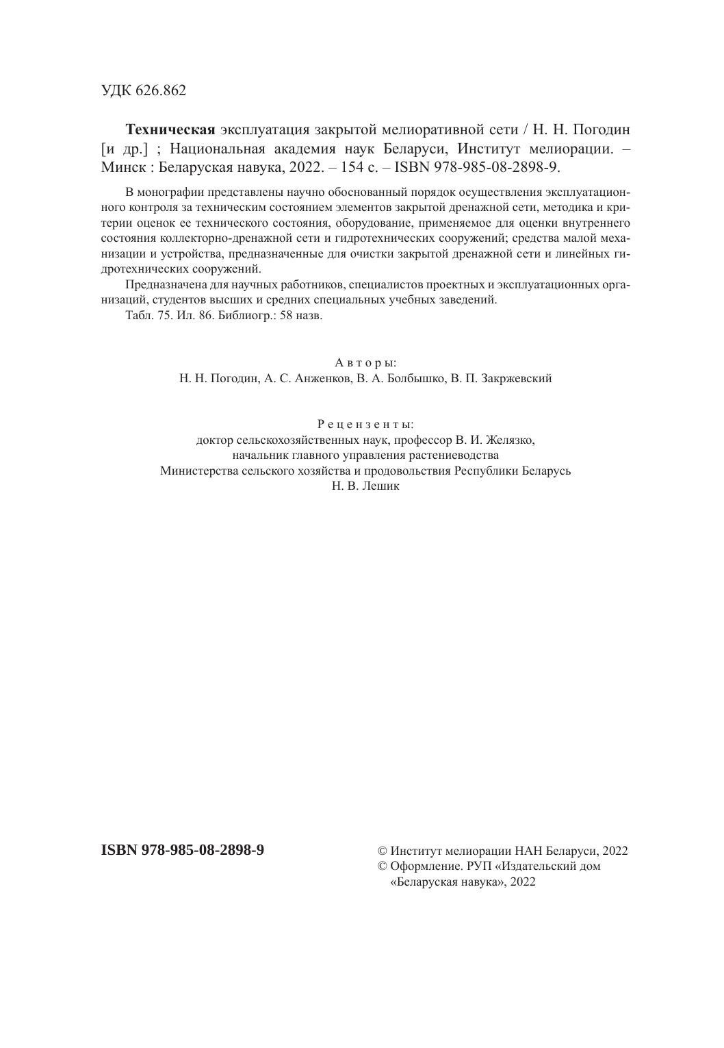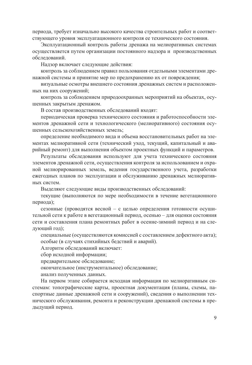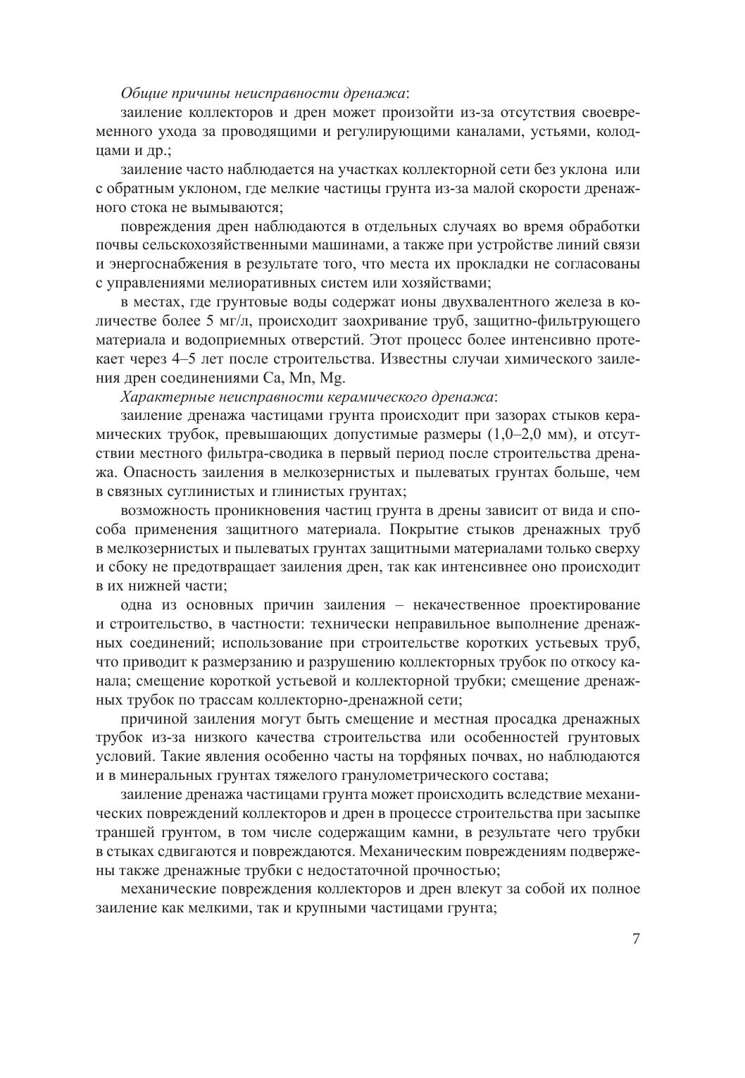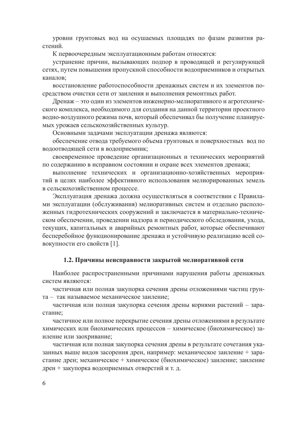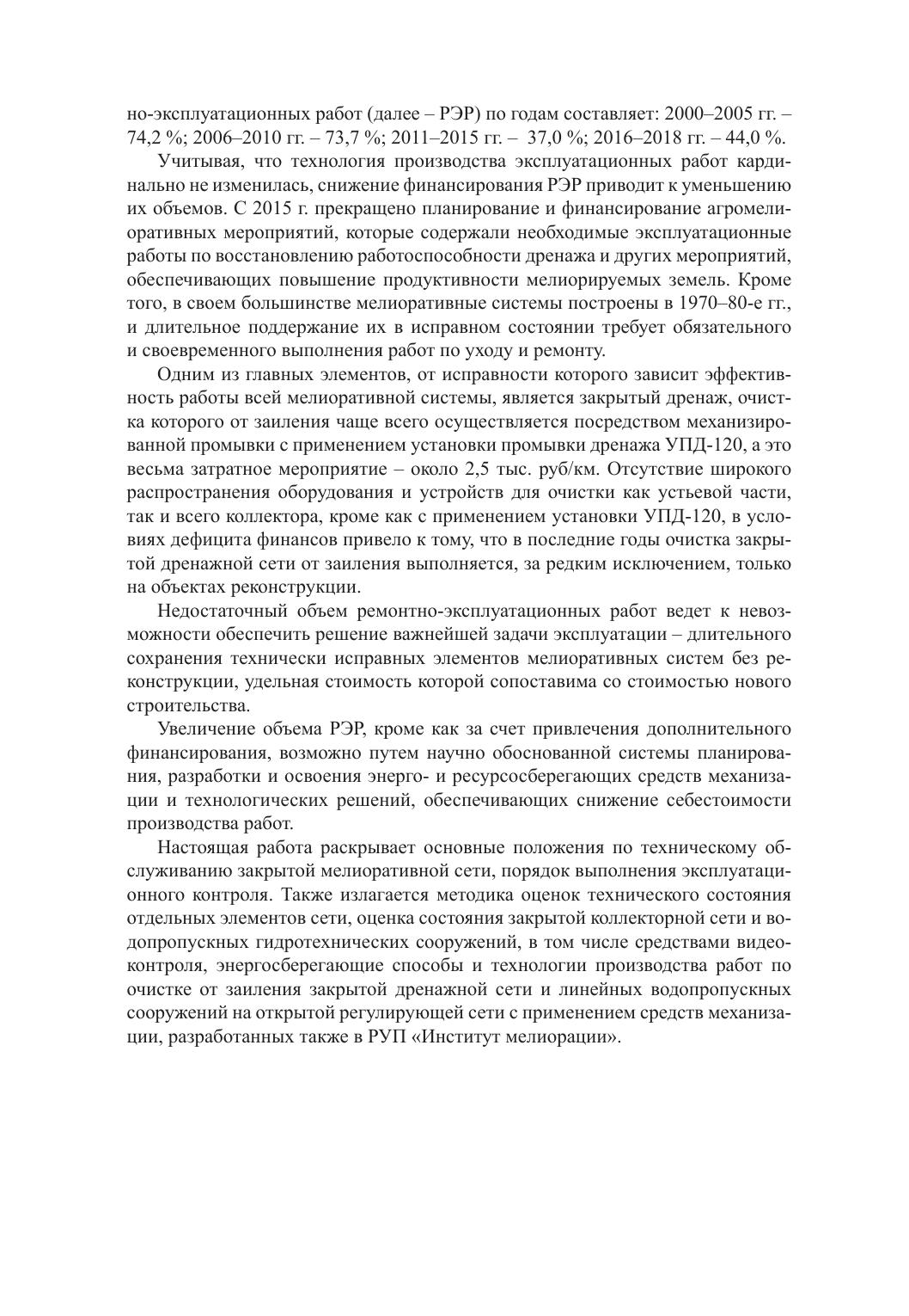 В монографии представлены научно обоснованный порядок осуществления эксплуатационного контроля за техническим состоянием элементов закрытой дренажной сети, методика и критерии оценок ее технического состояния, оборудование, применяемое для оценки внутреннего состояния коллекторно-дренажной сети и гидротехнических сооружений; средства малой механизации и устройства, предназначенные для очистки закрытой дренажной сети и линейных гидротехнических сооружений.