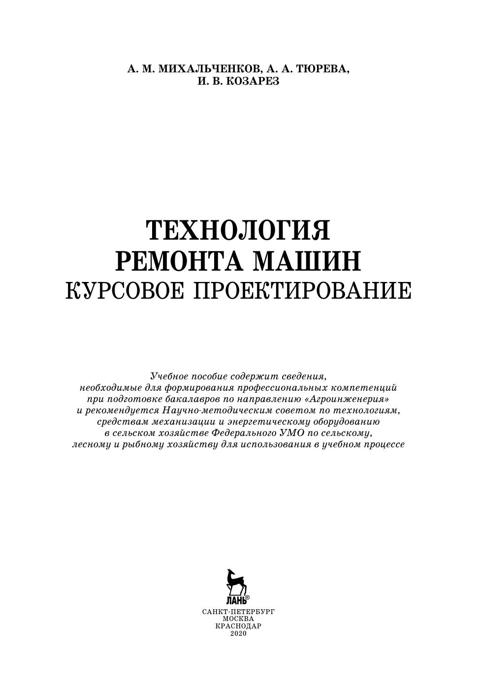 Учебное пособие предназначено для выполнения курсового проекта по дисциплине «Технология ремонта машин» и выпускной квалификационной работы для студентов, обучающихся по направлению подготовки «Агроинженерия» профиль «Технический сервис в АПК».