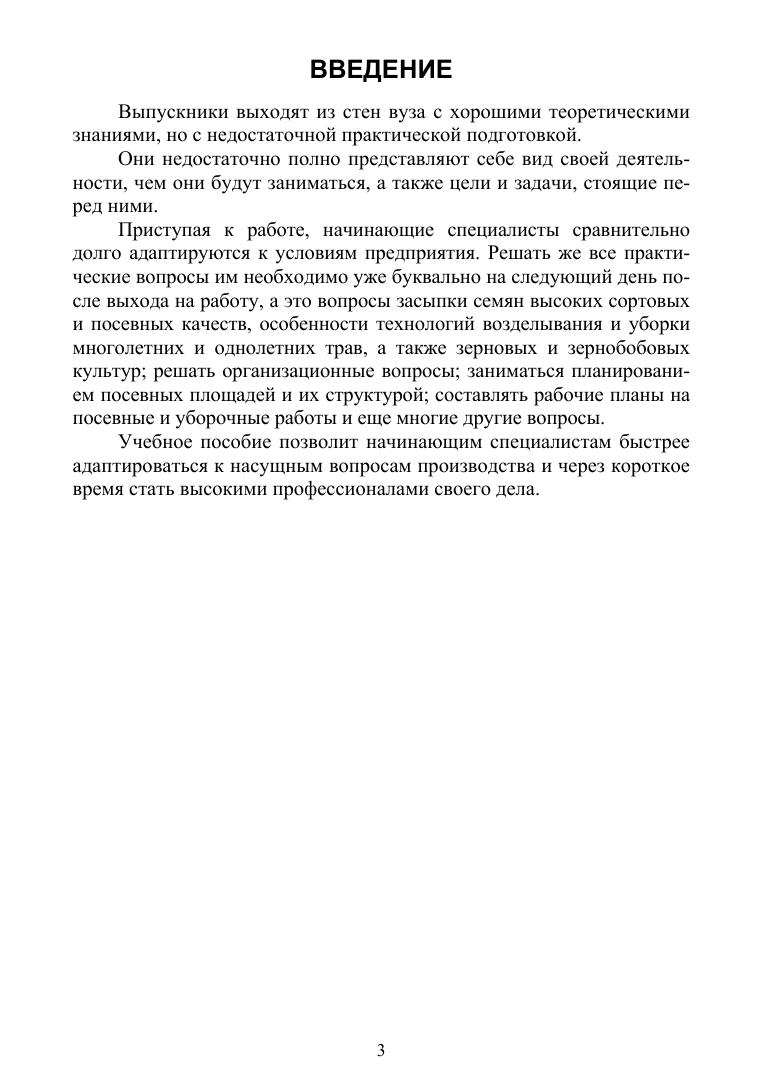 В пособии представлены наиболее значимые особенности технологий возделывания и уборки полевых культур. Поставленные на рассмотрение вопросы взяты из конкретных производственных условий, показаны пути их решения, что подтверждается многочисленными примерами и расчётами. Приведены примеры современных технологий, внедряемых в производство на основе достижений технического прогресса, позволяющие агрономической службе хозяйства упростить организацию труда и производства в поле, показана их эффективность.