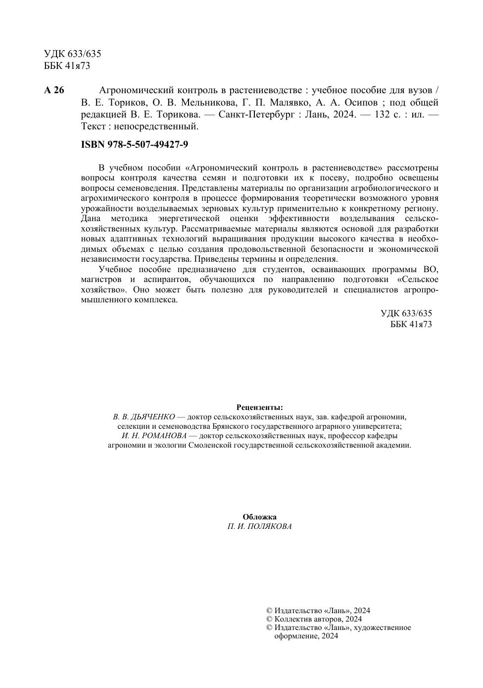 В учебном пособии «Агрономический контроль в растениеводстве» рассмотрены вопросы контроля качества семян и подготовки их к посеву, подробно освещены вопросы семеноведения. Представлены материалы по организации агробиологического и агрохимического контроля в процессе формирования теоретически возможного уровня урожайности возделываемых зерновых культур применительно к конкретному региону. Дана методика энергетической оценки эффективности возделывания сельскохозяйственных культур. Рассматриваемые материалы являются основой для разработки новых адаптивных технологий выращивания продукции высокого качества в необходимых объемах с целью создания продовольственной безопасности и экономической независимости государства. Приведены термины и определения. Учебное пособие предназначено для студентов, осваивающих программы ВО, магистров и аспирантов, обучающихся по направлению подготовки «Сельское хозяйство». Оно может быть полезно для руководителей и специалистов агропромышленного комплекса.