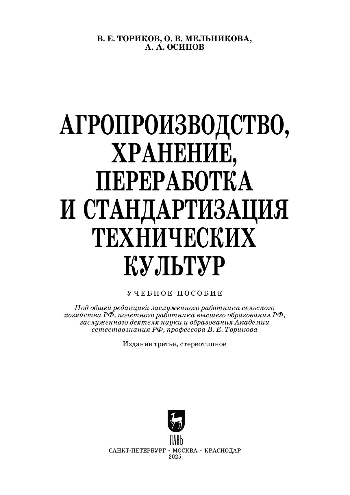 В учебном пособии отражено формирование качества продукции при выращивании и хранении, научные принципы хранения продукции, значение, агропроизводство, хранение и стандартизация семян масличных и эфирномасличных культур, фабричной сахарной свеклы, сырья табака и махорки, хмеля, первичная обработка технического сырья прядильных культур, лубяных культур, основа производства растительных масел из семян масличных культур. Соответствует современным требованиям Федерального государственного образовательного стандарта среднего профессионального образования и профессиональным квалификационным требованиям. Учебное пособие предназначено для студентов, осваивающих образовательные программы среднего профессионального образования (СПО), преподавателей аграрных колледжей и техникумов.