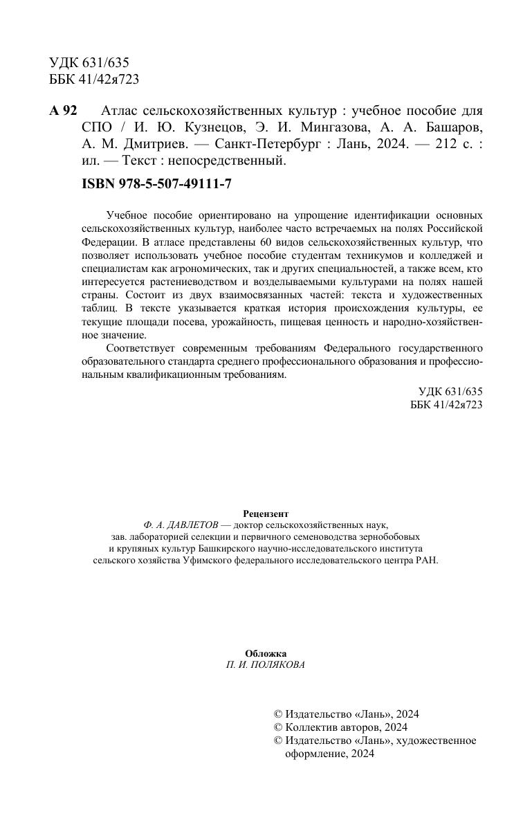 Учебное пособие ориентировано на упрощение идентификации основных сельскохозяйственных культур, наиболее часто встречаемых на полях Российской Федерации. В атласе представлены 60 видов сельскохозяйственных культур, что позволяет использовать учебное пособие студентам техникумов и колледжей и специалистам как агрономических, так и других специальностей, а также всем, кто интересуется растениеводством и возделываемыми культурами на полях нашей страны. Состоит из двух взаимосвязанных частей: текста и художественных таблиц. В тексте указывается краткая история происхождения культуры, ее текущие площади посева, урожайность, пищевая ценность и народно-хозяйственное значение. Соответствует современным требованиям Федерального государственного образовательного стандарта среднего профессионального образования и профессио-нальным квалификационным требованиям.