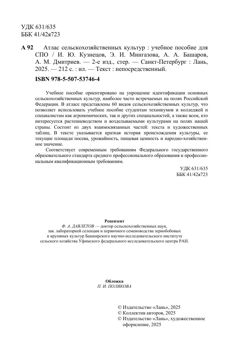 Учебное пособие ориентировано на упрощение идентификации основных сельскохозяйственных культур, наиболее часто встречаемых на полях Российской Федерации. В атласе представлены 60 видов сельскохозяйственных культур, что позволяет использовать учебное пособие студентам техникумов и колледжей и специалистам как агрономических, так и других специальностей, а также всем, кто интересуется растениеводством и возделываемыми культурами на полях нашей страны. Состоит из двух взаимосвязанных частей: текста и художественных таблиц. В тексте указывается краткая история происхождения культуры, ее текущие площади посева, урожайность, пищевая ценность и народно-хозяйственное значение. Соответствует современным требованиям Федерального государственного образовательного стандарта среднего профессионального образования и профессио-нальным квалификационным требованиям.