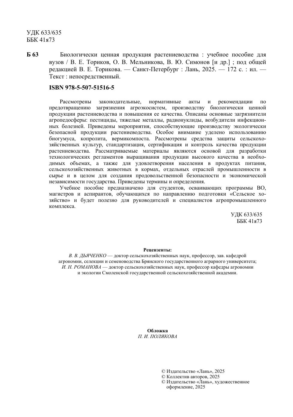 Рассмотрены законодательные, нормативные акты и рекомендации по предотвращению загрязнения агроэкосистем, производству биологически ценной продукции растениеводства и повышения ее качества. Описаны основные загрязнители агропедосферы: пестициды, тяжелые металлы, радионуклиды, возбудители инфекционных болезней. Приведены мероприятия, способствующие производству экологически безопасной продукции растениеводства. Особое внимание уделено использованию биогумуса, копролита, вермикомпоста. Рассмотрены средства защиты сельскохозяйственных культур, стандартизация, сертификация и контроль качества продукции растениеводства. Рассматриваемые материалы являются основой для разработки технологических регламентов выращивания продукции высокого качества в необходимых объемах, а также для удовлетворения населения в продуктах питания, сельскохозяйственных животных в кормах, отдельных отраслей промышленности в сырье и в целом для создания продовольственной безопасности и экономической независимости государства. Приведены термины и определения. Учебное пособие предназначено для студентов, осваивающих программы ВО, магистров и аспирантов, обучающихся по направлению подготовки «Сельское хозяйство» и будет полезно для руководителей и специалистов агропромышленного комплекса.