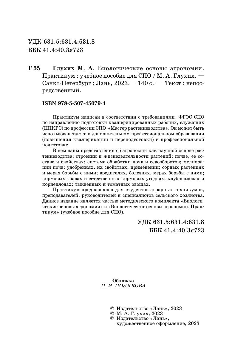 Практикум написан в соответствии с требованиями ФГОС СПО по направлению подготовки квалифицированных рабочих, служащих (ППКРС) по профессии СПО «Мастер растениеводства». Он может быть использован также в дополнительном профессиональном образовании (повышения квалификации и переподготовки) и профессиональной подготовке. В нем даны представления об агрономии как научной основе растениеводства, строении и жизнедеятельности растений, почве, ее составе и свойствах, системе обработки почв и севооборотов, мелиорации почв, удобрениях, их свойствах, применении, сорных растениях и мерах борьбы с ними, вредителях, болезнях, мерах борьбы с ними, кормовых травах и естественных кормовых угодьях, клубнеплодах и корнеплодах, тыквенных и томатных овощах. Практикум предназначен для студентов аграрных техникумов, преподавателей, руководителей и специалистов сельского хозяйства. Данное издание является частью методического комплекта «Биологические основы агрономии» и «Биологические основы агрономии. Практикум» (учебное пособие для СПО).